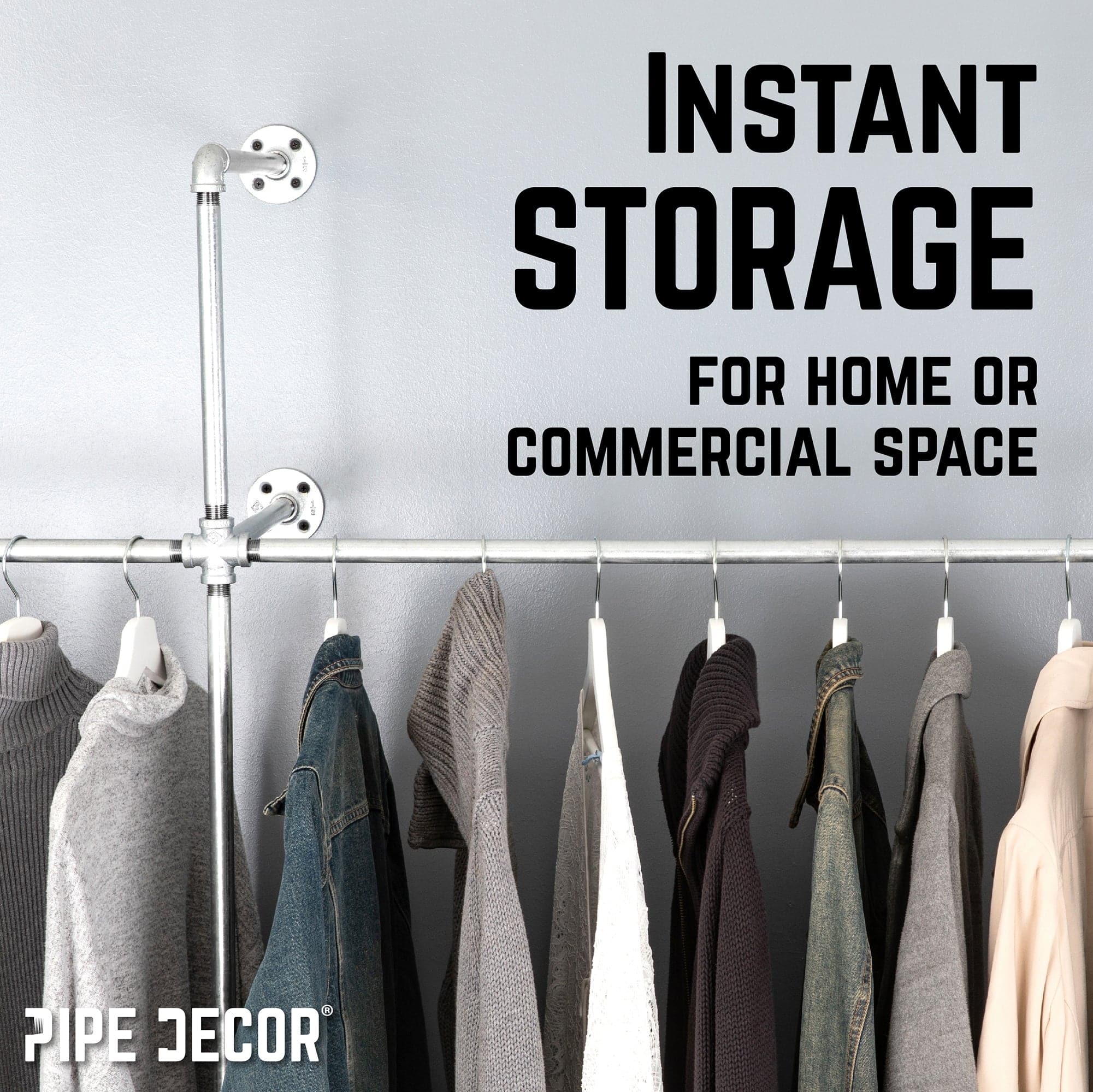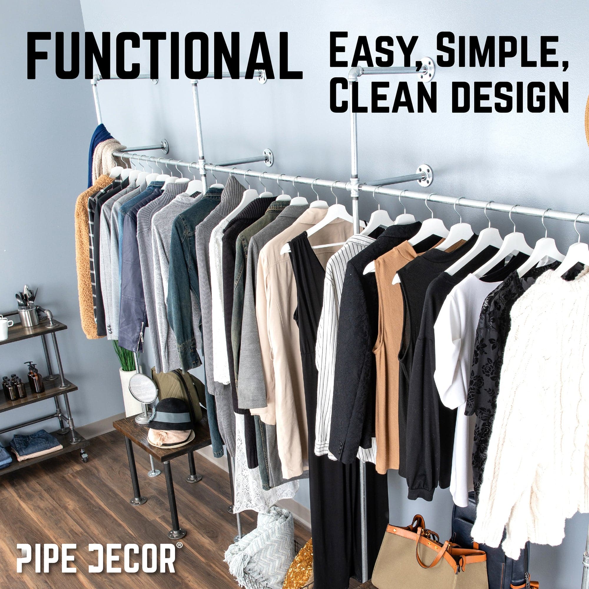 Minimalist design meets maximum functionality. Our expandable double-hung wardrobe is the perfect way to display your unique fashion sense in your home or shop. Mix and match our DIY kits to create the open wardrobe space of your dreams. Use your space efficiently by creating a one-of-a-kind wardrobe to get organized in a flash. Our wardrobe is modular and comes in sets of one, two, or three sections. Buy the size that fits your space. The pipes are 100% real steel and are made to stand the test of time. Our wardrobe anchors to the wall in multiple places for added stability using our patented 5-way fittings. Most of the weight is borne by the floor flanges, so you can install this design anywhere; however, we recommend drilling into a wall stud whenever possible for added stability.