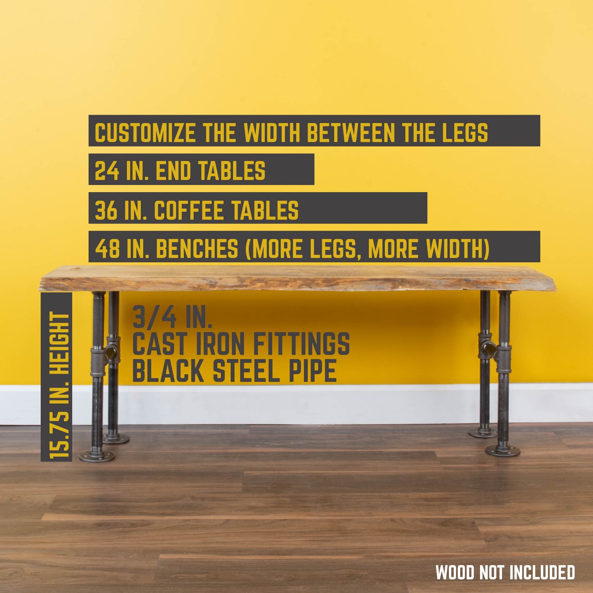 - Kit includes: (4) 3/4 in. x 8-inch pipe bench legs, (4) 3/4 in. x 6-inch pipe bench legs, (2) 3/4 in. x 4-inch pipe bench legs, (8) 3/4-in. round flanges, (4) 3/4 in. Tees, (16) screws, instructions, and a clean and seal sheet
