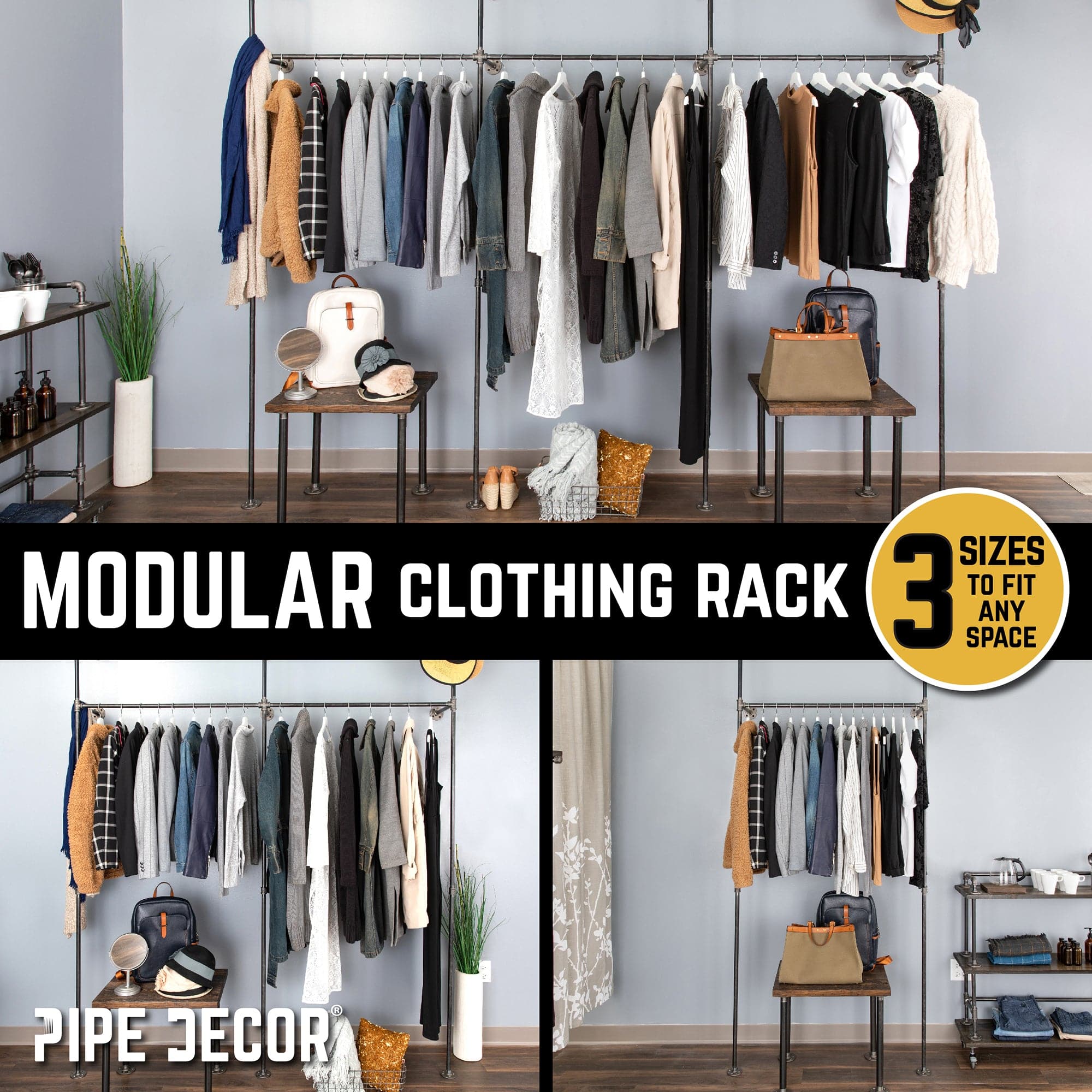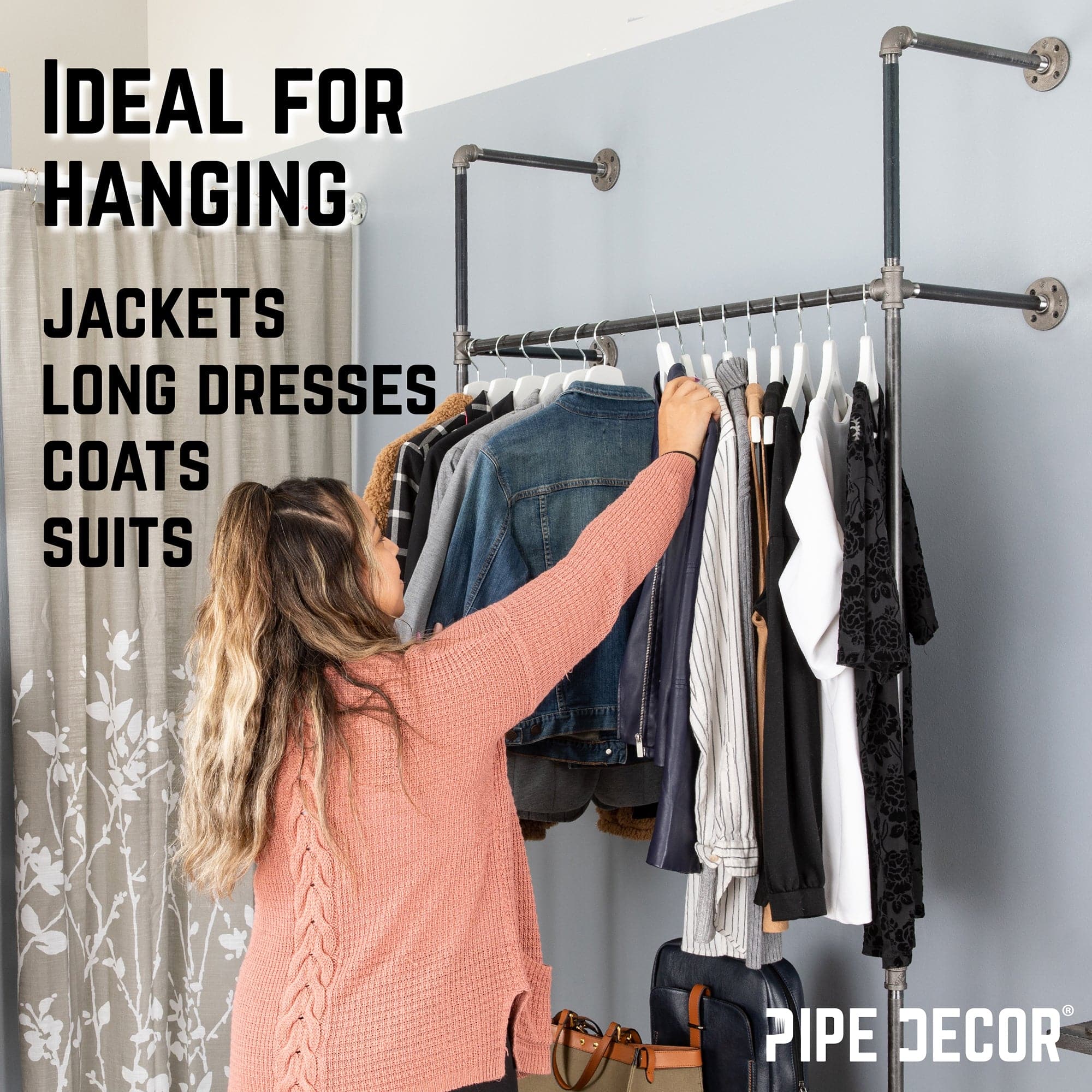 Minimalist design meets maximum functionality. Our expandable double-hung wardrobe is the perfect way to display your unique fashion sense in your home or shop. Mix and match our DIY kits to create the open wardrobe space of your dreams. Use your space efficiently by creating a one-of-a-kind wardrobe to get organized in a flash. Our wardrobe is modular and comes in sets of one, two, or three sections. Buy the size that fits your space. The pipes are 100% real steel and are made to stand the test of time. Our wardrobe anchors to the wall in multiple places for added stability using our patented 5-way fittings. Most of the weight is borne by the floor flanges, so you can install this design anywhere; however, we recommend drilling into a wall stud whenever possible for added stability.