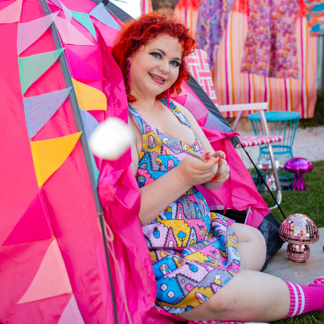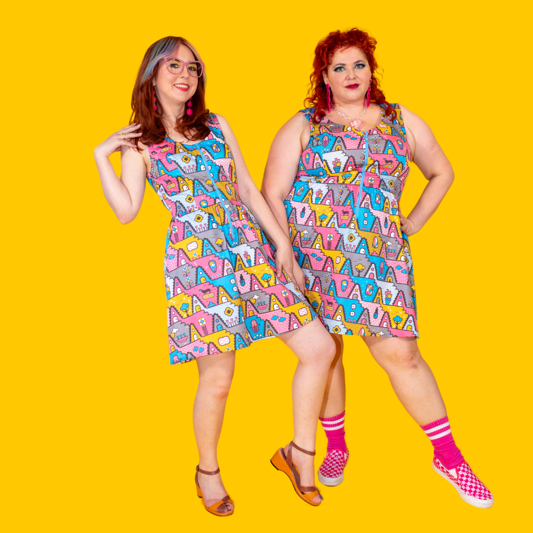 Meet our wildest fit & flare dress, made of stretch cotton poplin! Featuring our original, quirky 80s-inspired print of geometric a-frame houses, bushes and trees, and little cute pets! These scoop neck dresses feature a bright front zip, POCKETS, and a neckline that looks flattering on all body types and isn't too revealing for work or too boring for a date!