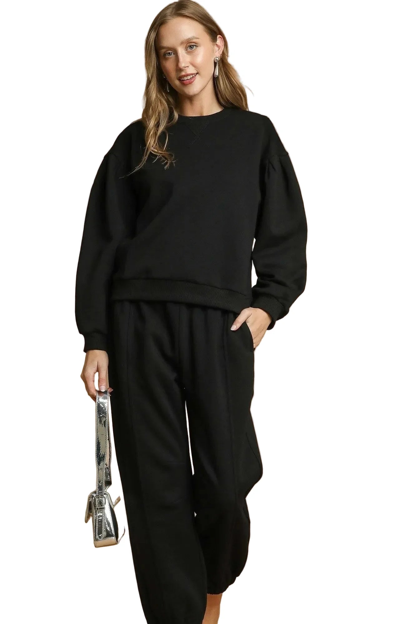 Round Neck Sweatshirt with Pleated Detail ‐ Black / L
