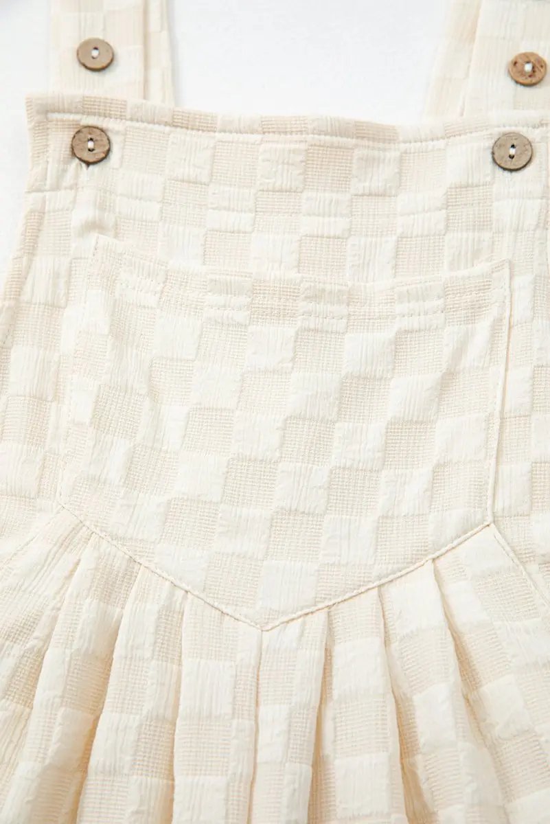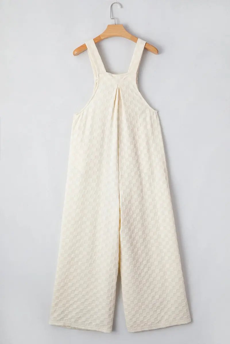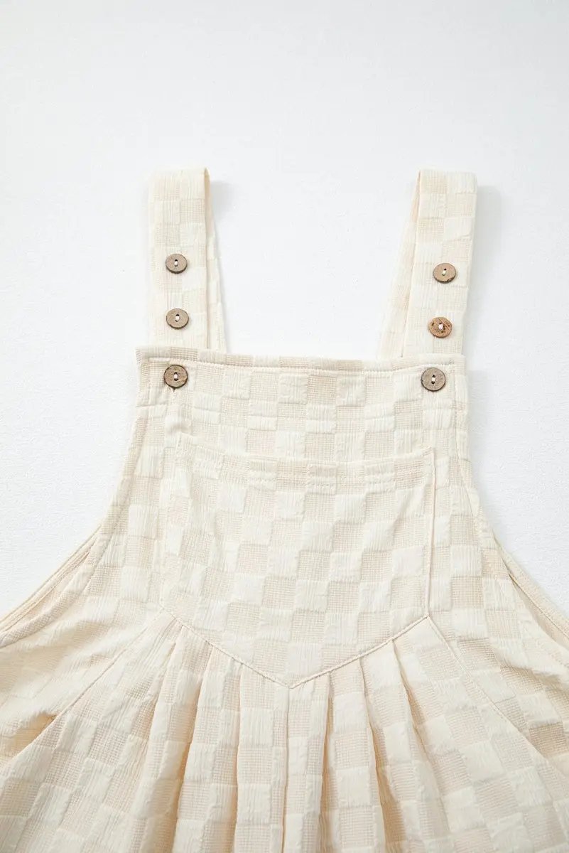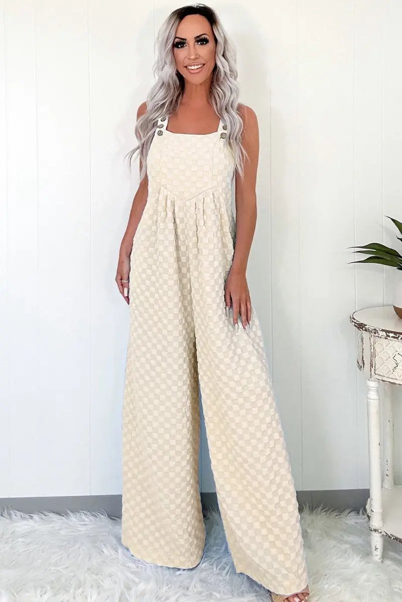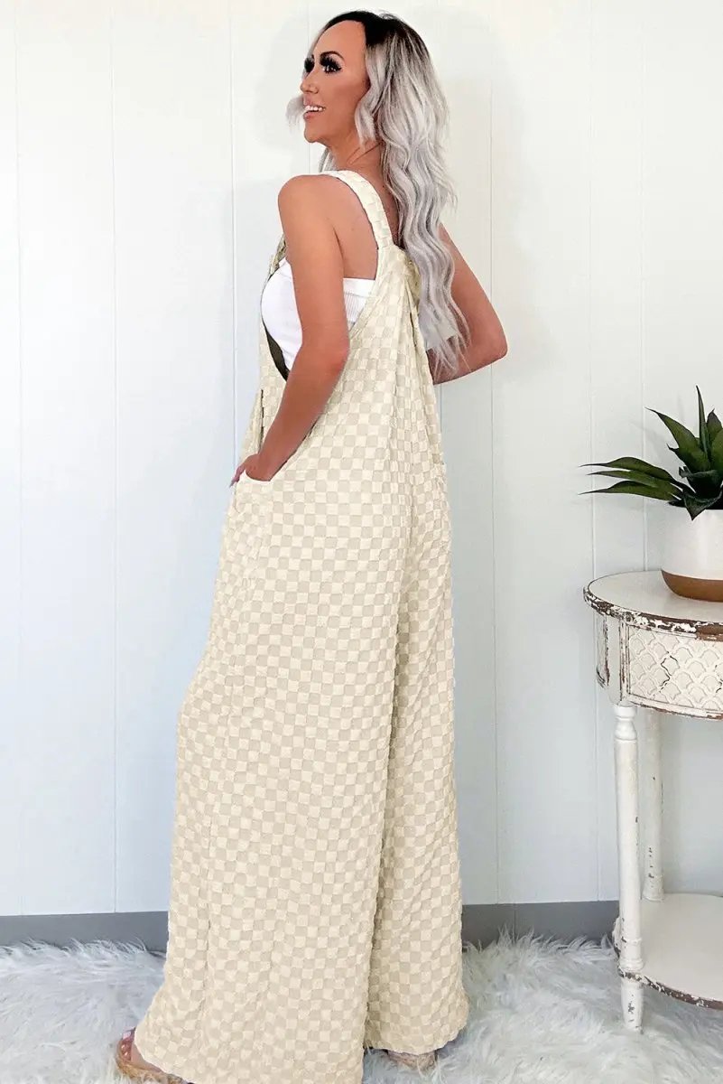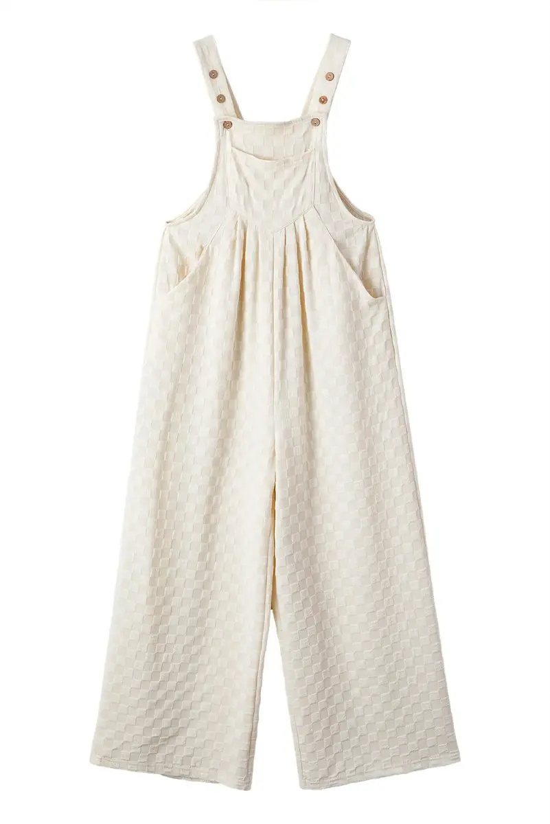 The design flatters the figure with a structured high waist and wide, flowing legs. A functional bib pocket adds practical detail, while shoulder straps with metal hardware provide a secure, adjustable fit. The allover beige check pattern delivers a versatile, timeless look that pairs easily with sandals, flats, or heels for various occasions.