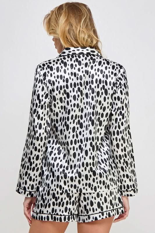 Experience the epitome of nighttime luxury with the BE WICKED Dalmy PJ Set in Black/White, size Large. Expertly crafted from high-quality satin polyester, this pajama set combines elegance with comfort. The long-sleeve collared shirt features a classic button-front closure, ensuring ease of wear, while the matching shorts come with an elastic waistband for an adjustable, snug fit. Adorned with a subtle polka dot print, the set presents a chic, contemporary design that flatters your silhouette. The smooth satin fabric offers a soft touch against the skin, making it perfect for relaxing evenings. Embrace a blend of style and comfort with this sophisticated pajama set.