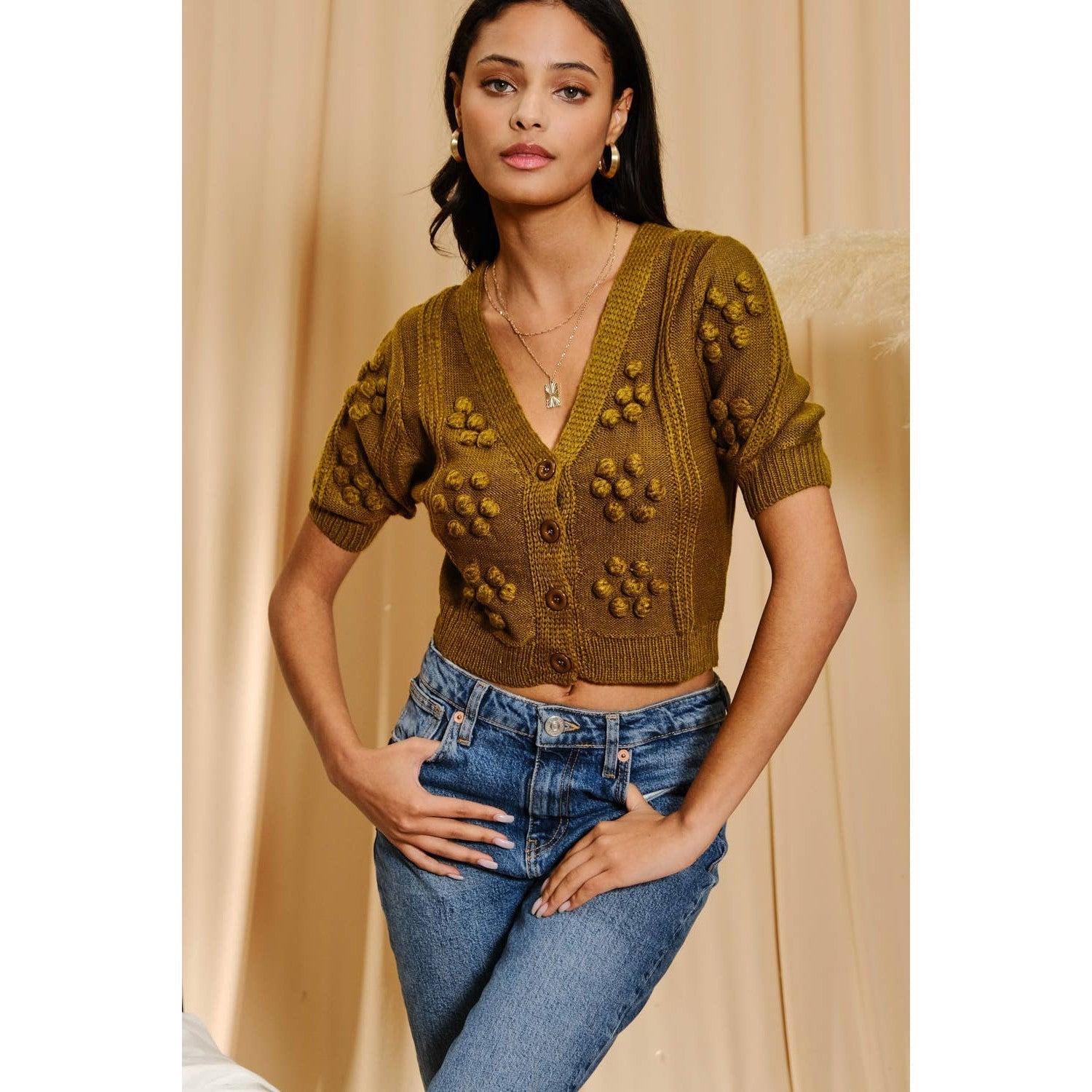 The Sleeved Pom Pom Cardigan from Endless Blu is a stylish addition to any wardrobe.