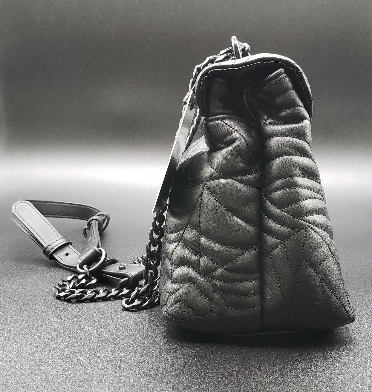 Ever needed a high end goth style bag, here it is. Black shoulder bag with Charlotte spider web style quilt design exterior. Faux leather bag with black inner fabric. Pockets and dividers inside. Magnetic clasp closure. Chain strap is adjustable.