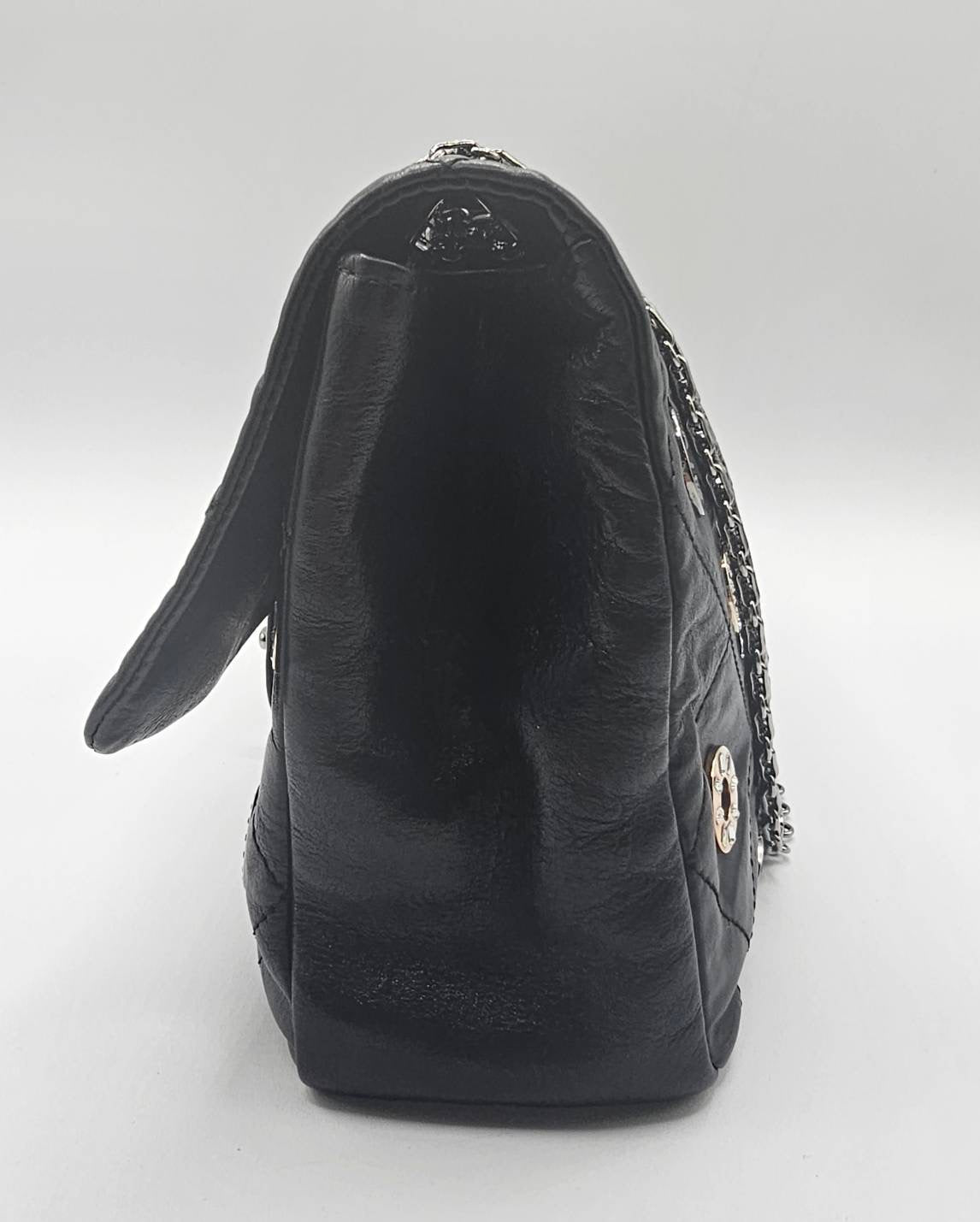 Black leather bag with gunmetal grommet and hardware. Crystal embellishments throughout. Single interior pocket. Flap closure.