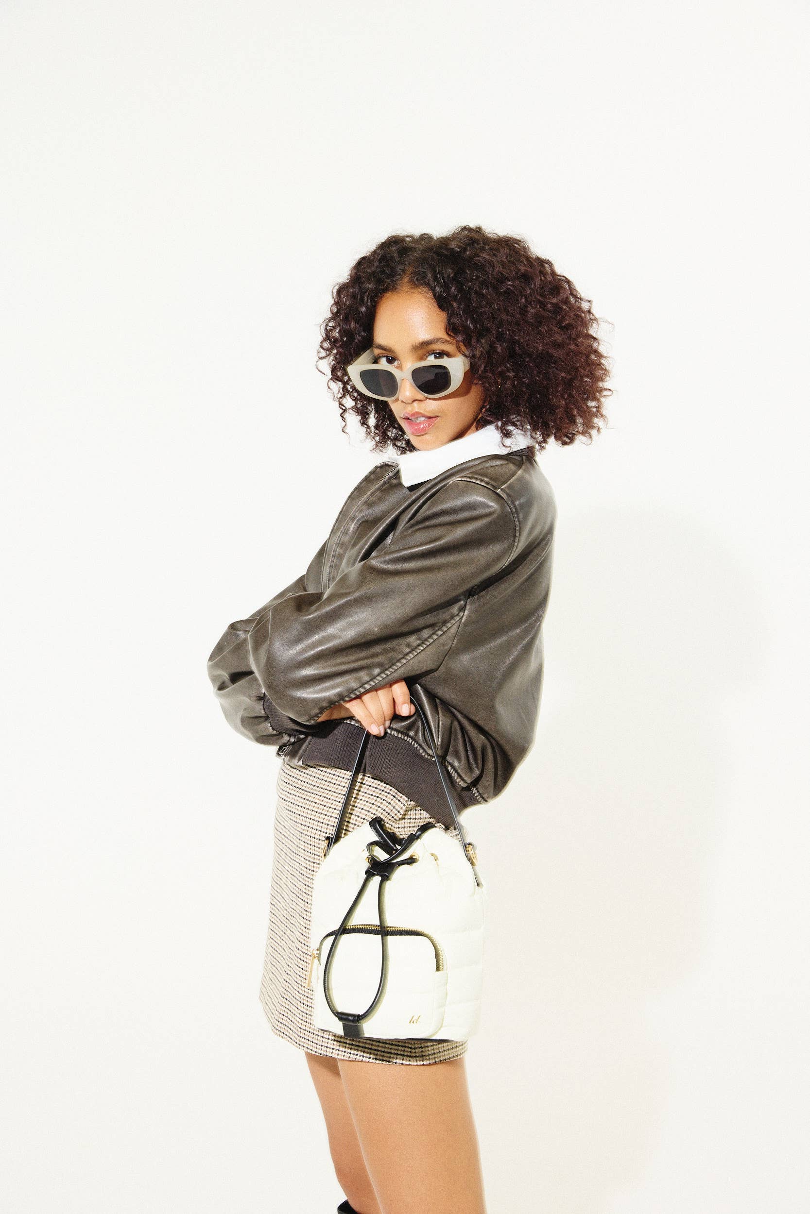 Say hello to the ‘Lucky’ Bucket Bag, your go-to accessory for the festive season and beyond. This lightweight, weatherproof bucket bag is designed to keep your belongings warm and cozy, wrapped in quilted nylon plush. Available in baby pink, classic black, and crisp white, the ‘Lucky’ Bucket Bag brings a playful yet practical touch to your holiday wardrobe.