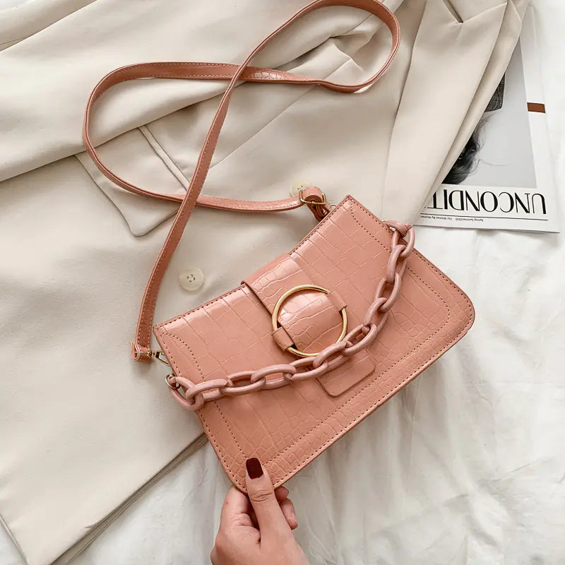 The bag features a secure zipper buckle opening, ensuring your belongings stay safe while you’re on the go. Its unique stone grain acrylic chain belt adds a trendy flair that sets it apart from ordinary bags. With a single shoulder strap, it offers a chic and convenient carry option for busy lifestyles.