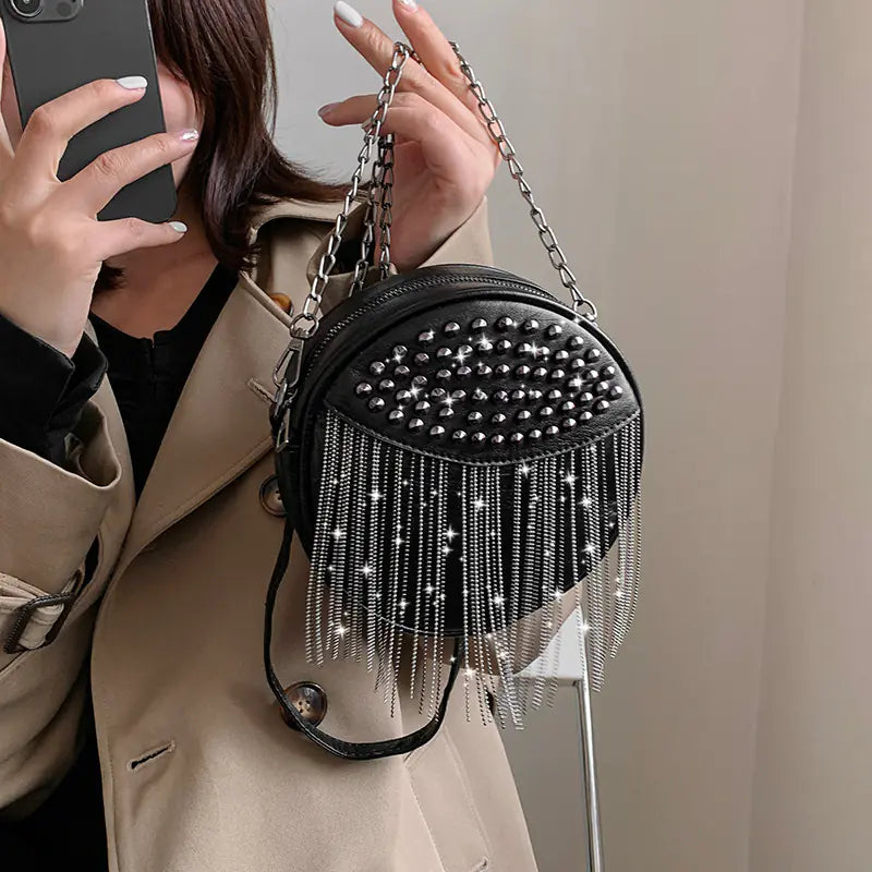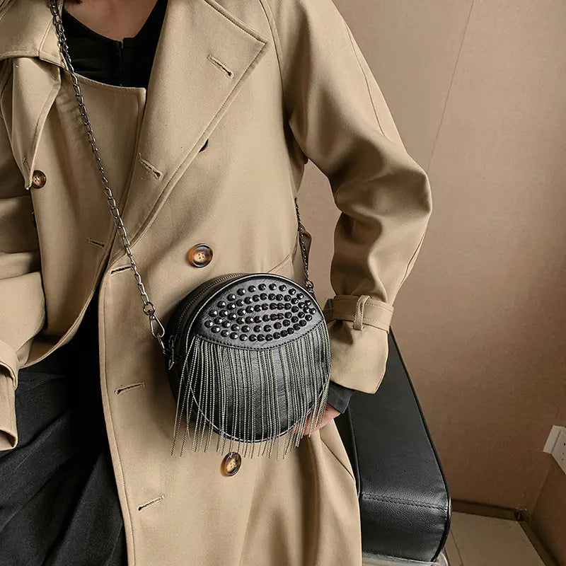 The standout tassel detail and trendy rivet accents add a touch of flair, making this bag a must-have for those who appreciate fashion-forward accessories. Whether you're heading out for a casual day or dressing up for a night out, this small round bag will complement your outfit perfectly.