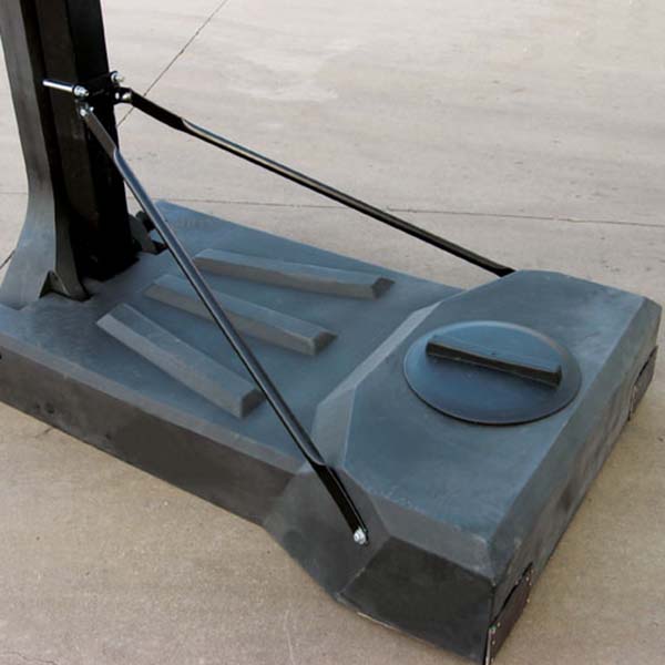 The OmniSlam Eclipse is a portable basketball goal that offers superior performance at a great price. It can be used indoors or outdoors and has a large poly base that can hold up to 500 lbs. of sand, ensuring stability. Unlike sectional posts, its one-piece 4" square 11 gauge post providing superior durability. The front of the base features a cam lever handle that makes it easy for one person to transport the unit on any hard, smooth, and level surface.