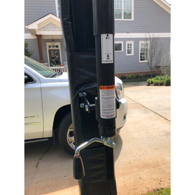 The extension arm tube is made of dual 2” x 4” (14 ga.) tubing and allow for at least 36” from mounting plate to backboard. The height adjustment crank cylinder has a minimum 2000# capacity rating and is 4’ from ground level for easy access. The pole design enables infinite height adjustment from 10’ to 7’, with an optional locking device. A "direct-rim mount" design reduces backboard stress. An easy-to-read height adjustment label is on the pole as well.