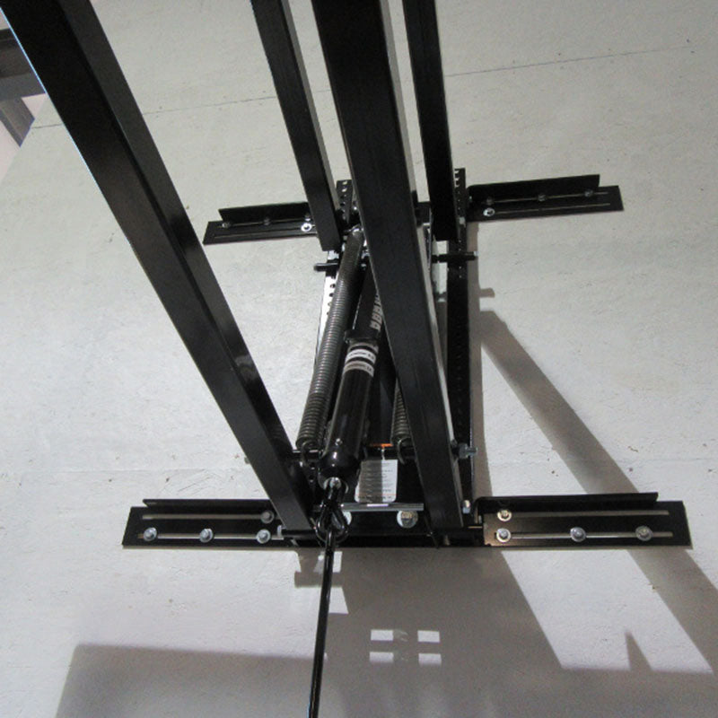 Adjustable extension arms are constructed of dual 2” x 2” tubing. A height adjustment crank cylinder is mounted within the extension arms and have a minimum 2,000# capacity rating. Two springs mounted in the extension assembly are included to minimize the amount of effort required to adjust the goal height when raising or lowering the unit. Design allows the rim to be mounted directly to the extension arm through the backboard to reduce stress on the backboard.