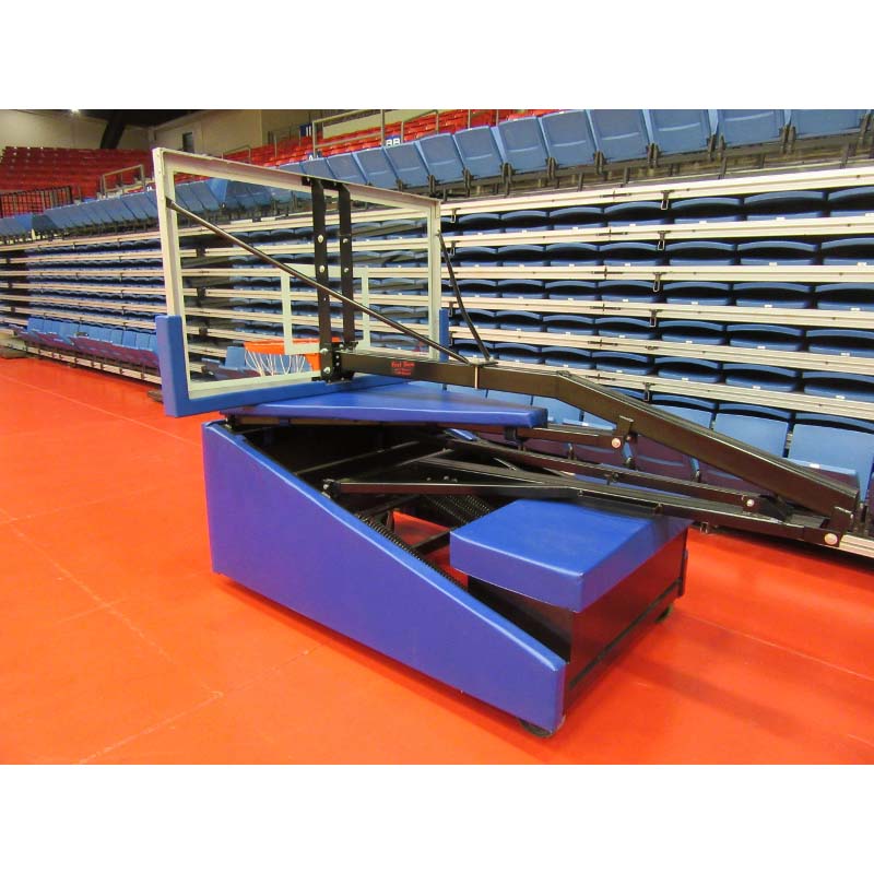 The unit operates via “Spring-Assist”. Seven 3 ½” painted coil springs support the weight of the backboard, rim, extension boom, padding and uprights (NO HYDRAULICS). Coil springs are painted to match the color of the base. Plated springs are not considered equal due to “hydrogen embrittlement” which takes place during the plating process. Rim height is adjustable in six-inch increments from regulation 10’ height down to 6’ via a removable adjustment pin. The Spring-Assist system can be operated easily by one person.