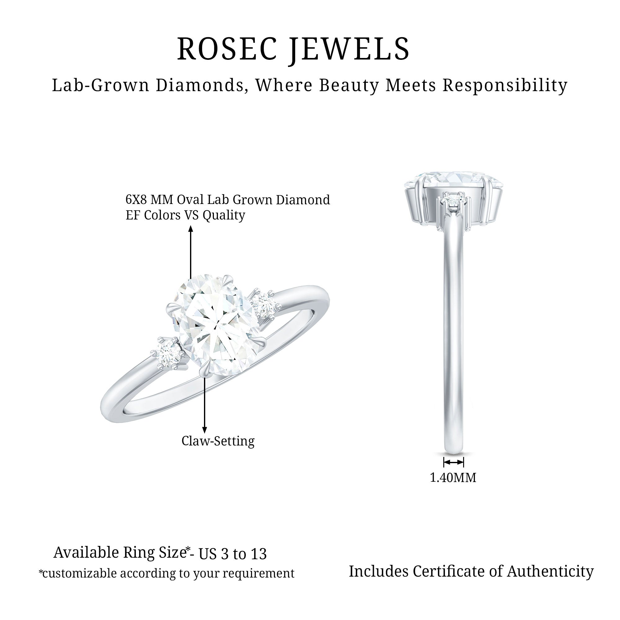 Symbolizing eternal love and telling your unique love story, this Lab Grown Diamond Engagement Ring is the perfect way to start your journey together. Its sophisticated elegance catches the light with every move, featuring an EF Color VS Clarity Lab Diamond that dazzles with its brilliance and shine. This Solitaire Engagement Ring highlights a 6X8 MM oval lab grown diamond set in claw setting, complemented by delicate round cut side stones. Both classic and modern, this Oval Engagement Ring represents commitment and honors the everlasting connection between you two. With its versatile design, this Oval Shaped Ring is simple yet elegant, making it an ideal solitaire ring, a birthday gift, or a piece for everyday wear. We provide a variety of metal choices for you to select from. Plus, this 1 Carat Diamond Ring is available in different sizes according to US standards, ranging from 3 to 13. The classic design brings a hint of simplicity and timeless elegance, making it perfect for any occasion. Its beauty makes this Single Diamond Ring perfect for any occasion, whether its an Engagement, Wedding, or Anniversary.