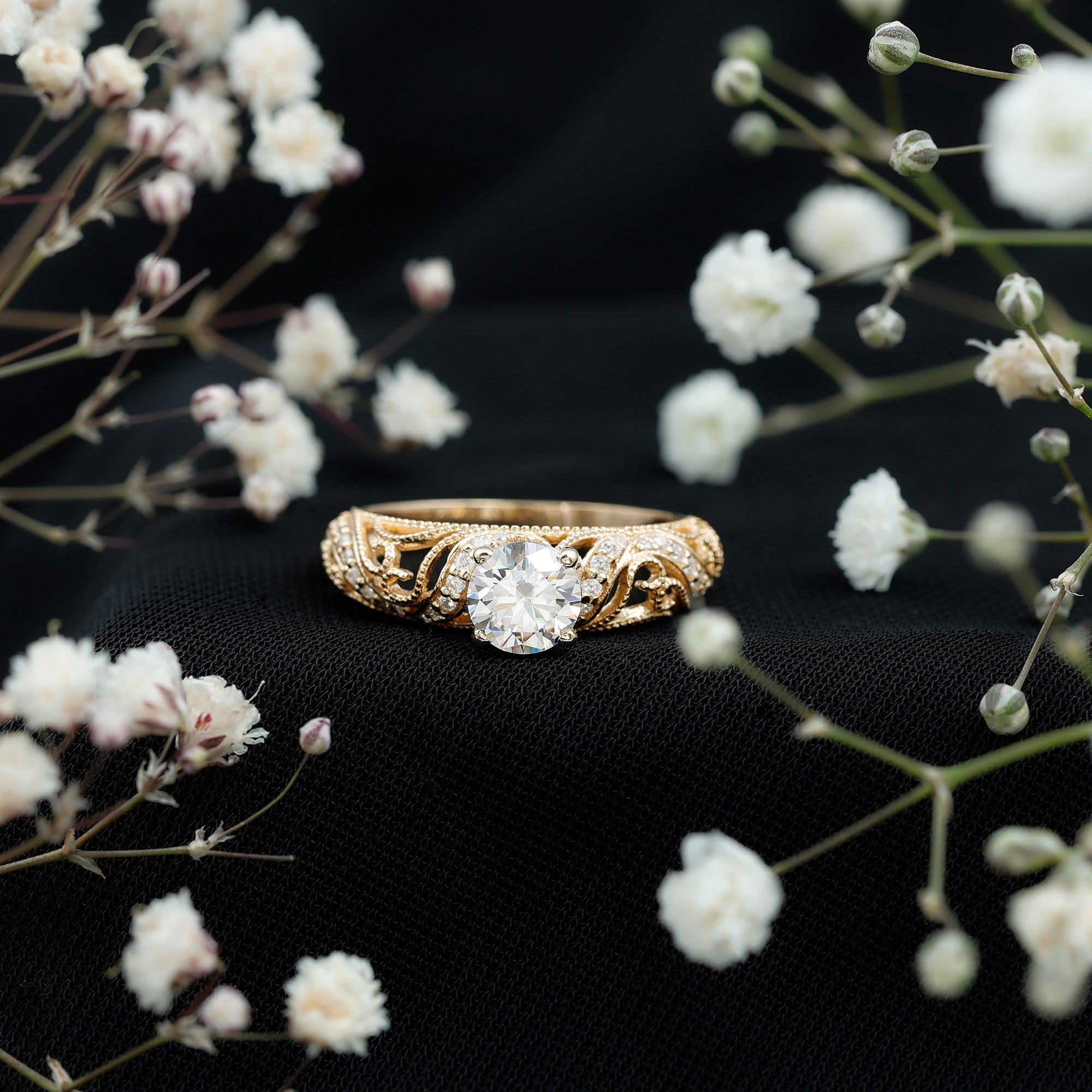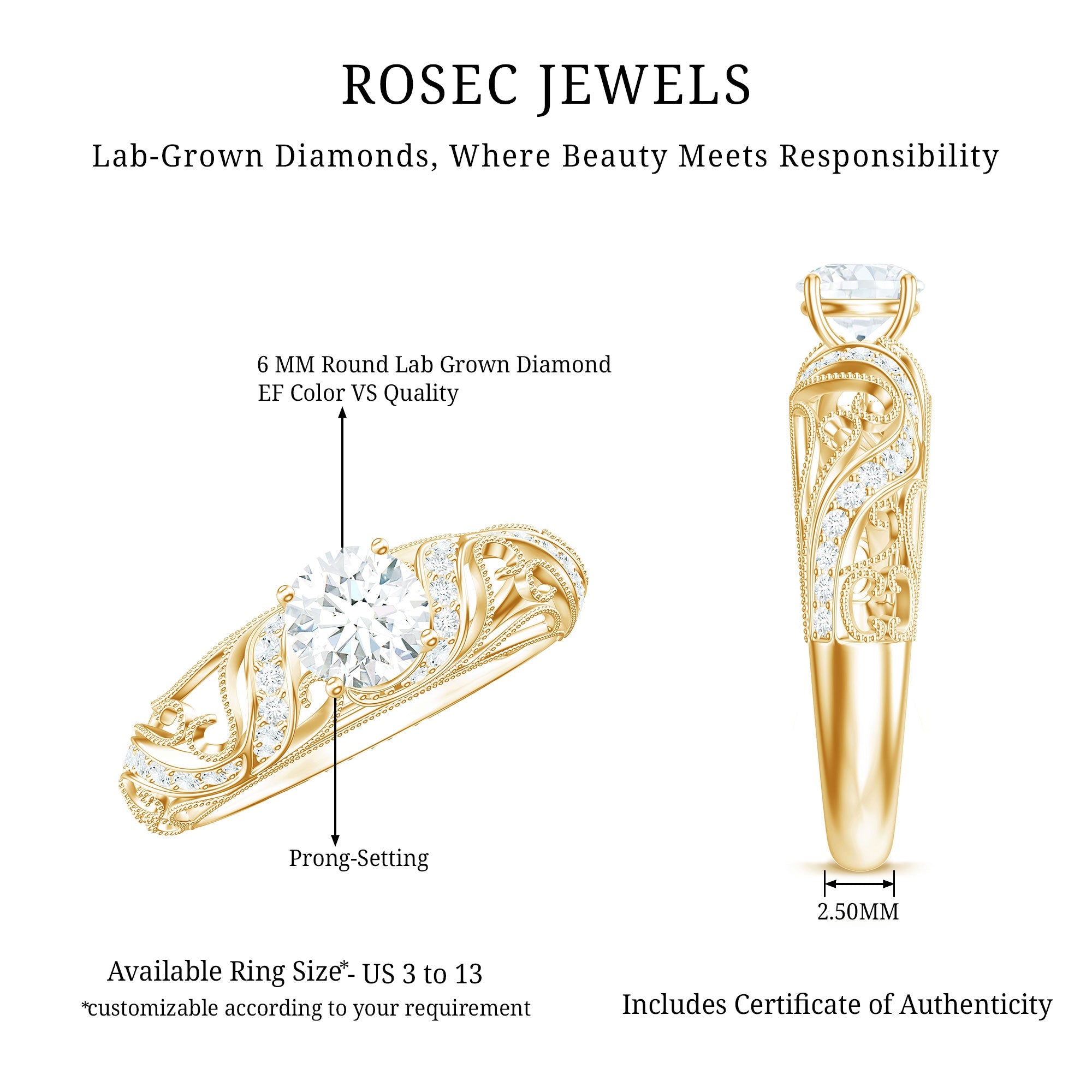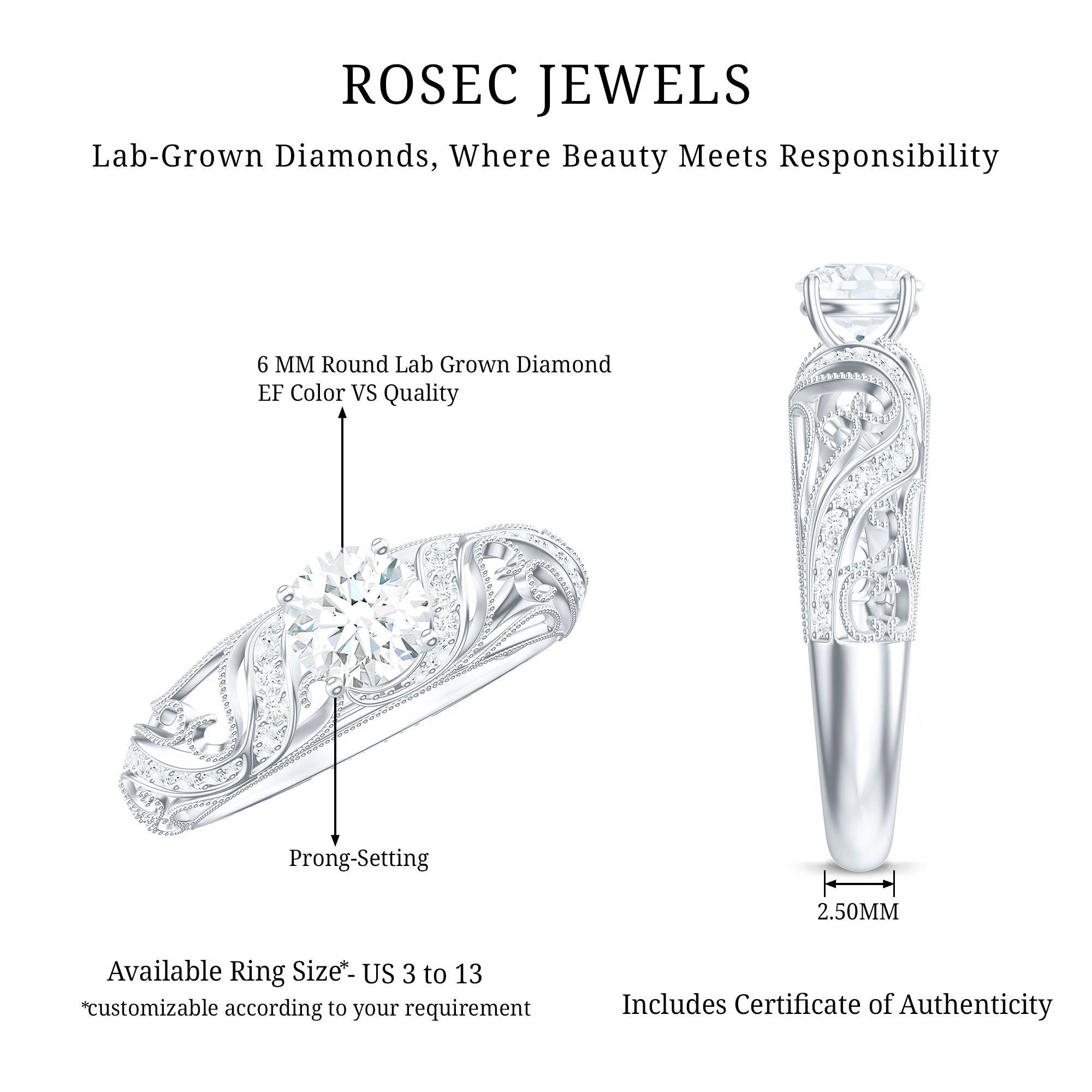 This Lab Grown Diamond Ring has a classic and elegant modern take having glamour and sparkle. With its timeless design and exceptional brilliance, this Diamond Engagement Ring celebrates the understated beauty with a jaw dropping appearance and beaded details. Embellished with 6 MM Round Shaped Lab Grown Diamond in Prong Setting sits in the center elegantly. To adorn the shank are the petite Diamonds studded on filigree shank. As a symbol of love and commitment, this Lab Diamond Circle Engagement Ring is an epitome of elegance and timelessness that has a classic yet radiant look with its enduring appeal.