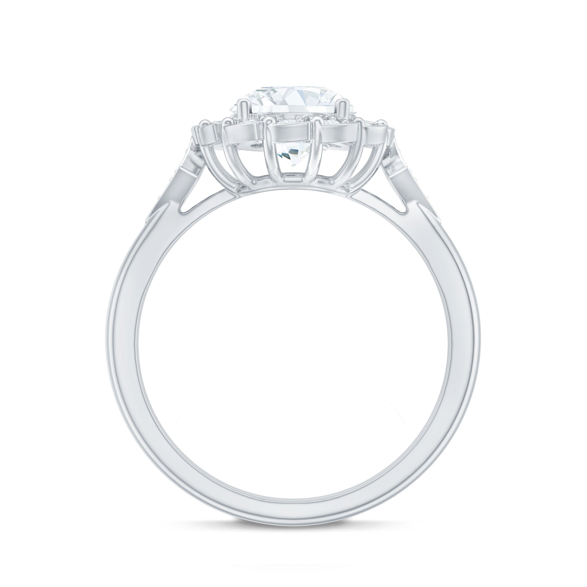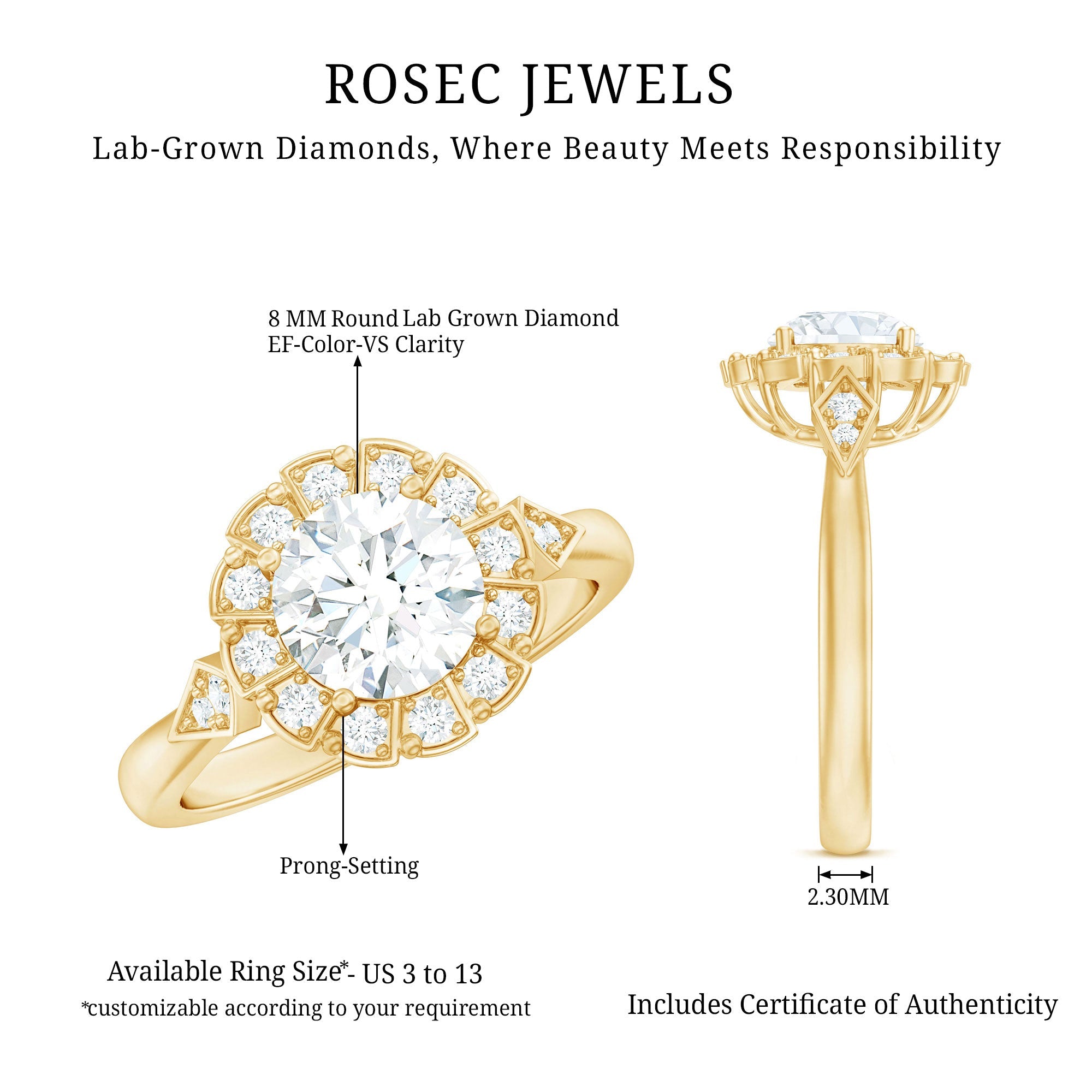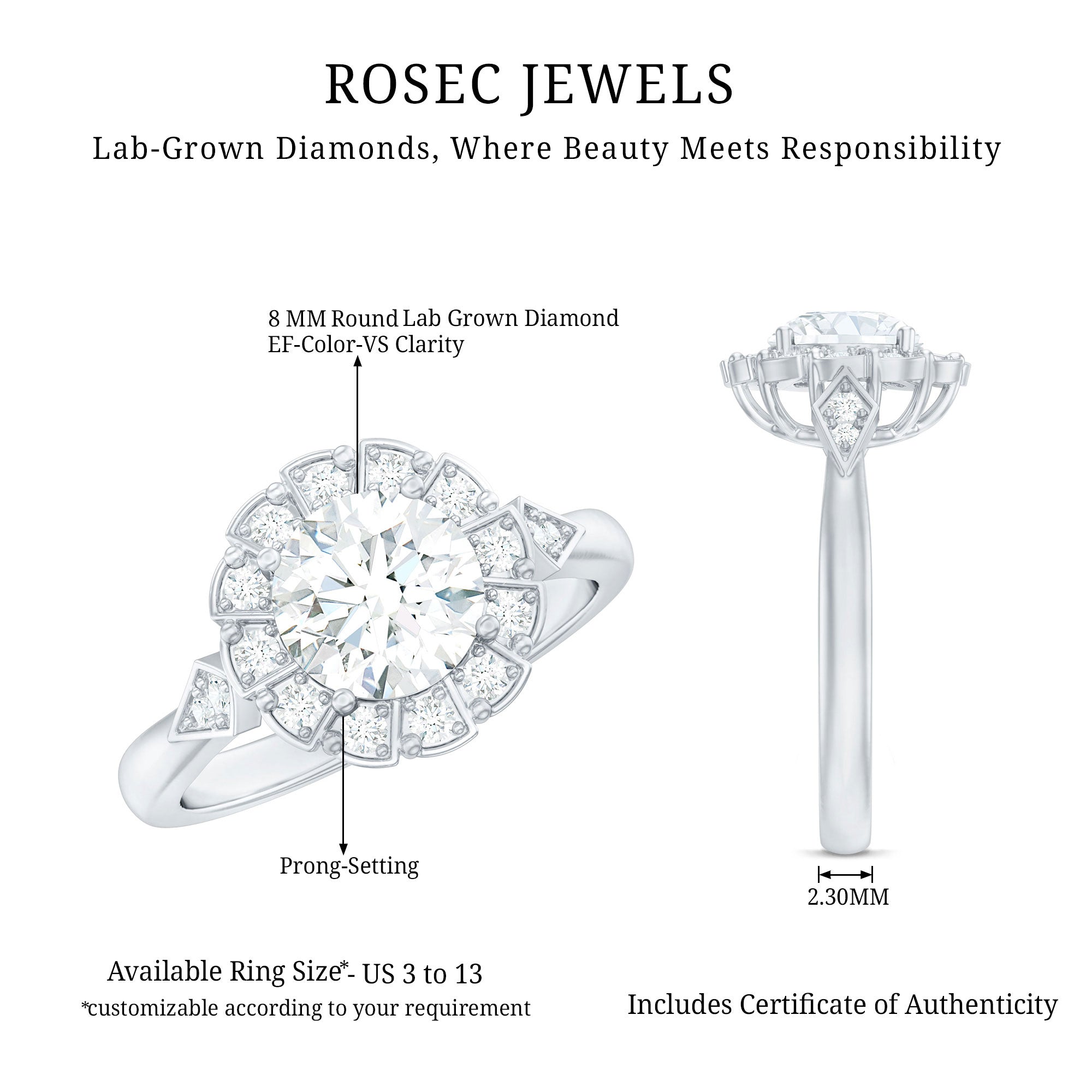 Our Flower Engagement Ring is thoughtfully designed to blend the natural beauty of flowers with the everlasting brilliance of lab-created diamonds, resulting in a truly unique piece. Drawing inspiration from the soft grace of nature, this Halo Engagement Ring features an 8 MM round cut diamond (EF-VS quality) securely held in prong setting, surrounded by smaller stones that create a charming floral halo. The sleek band of this Lab Grown Diamond Ring is elegantly enhanced with sparkling gemstones on either side, providing an additional layer of shine. This exquisite 2 carat Diamond Engagement Ring will arrive in a high-quality jewelry box, complete with a Gemstone Authenticity Certificate, ensuring a reliable shopping experience with us.