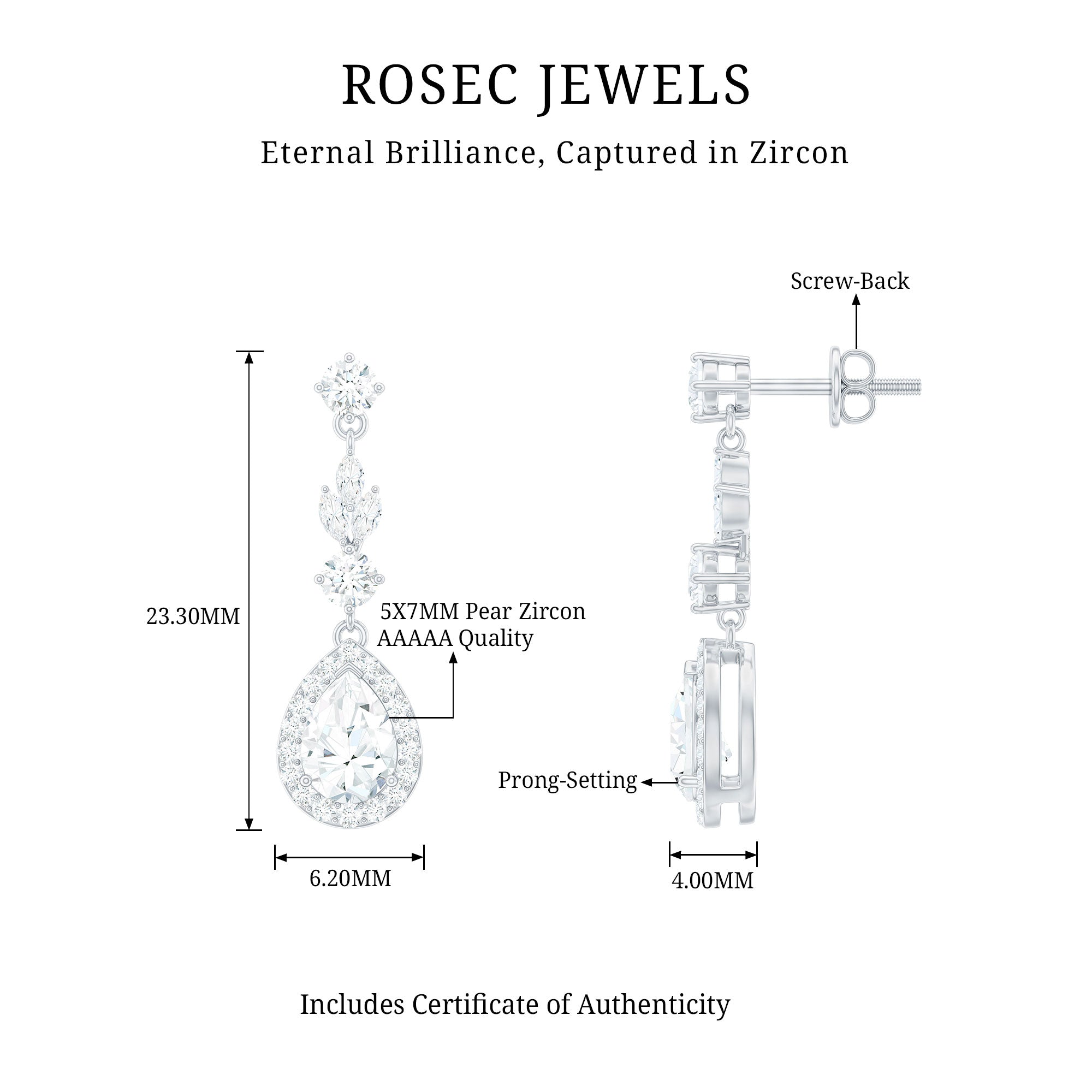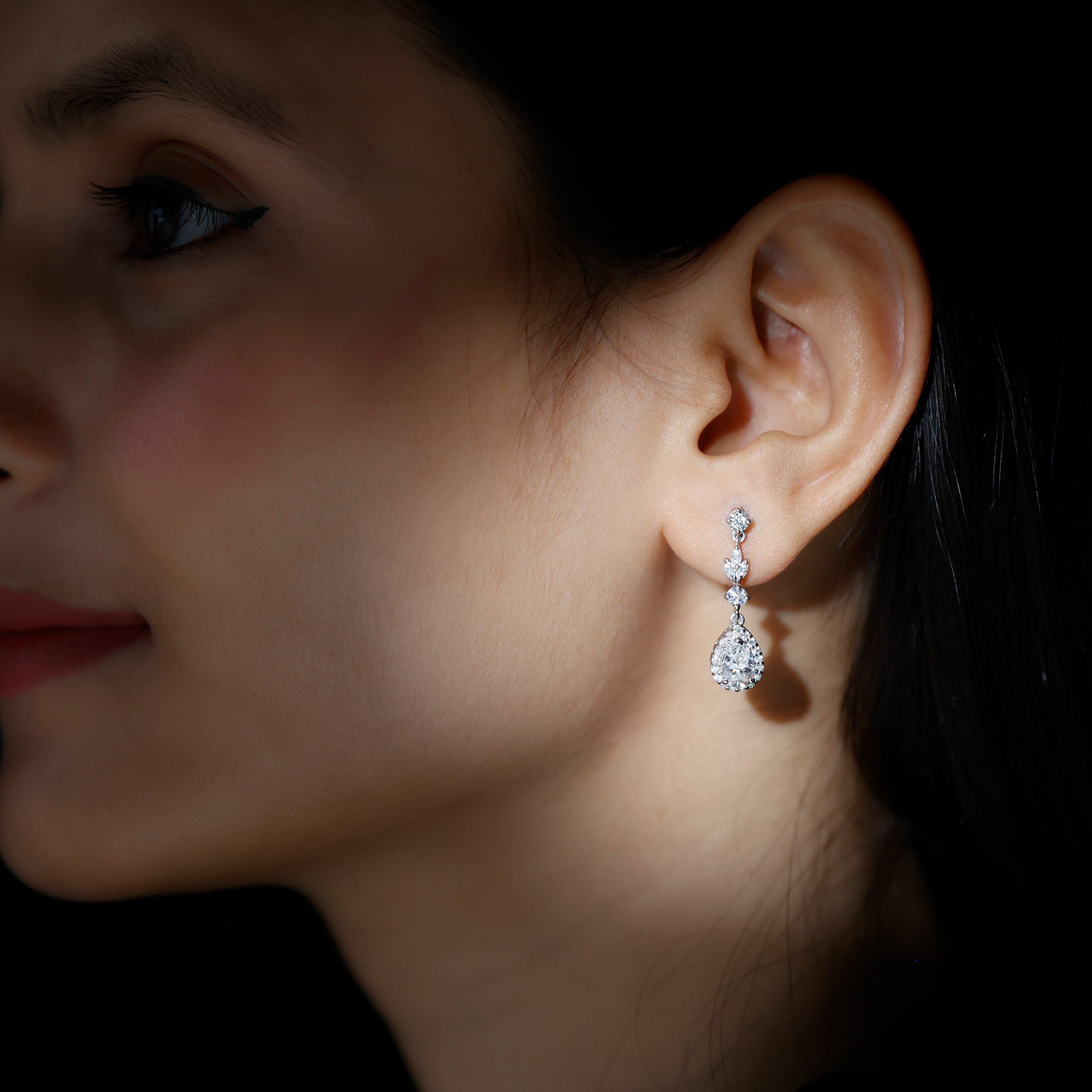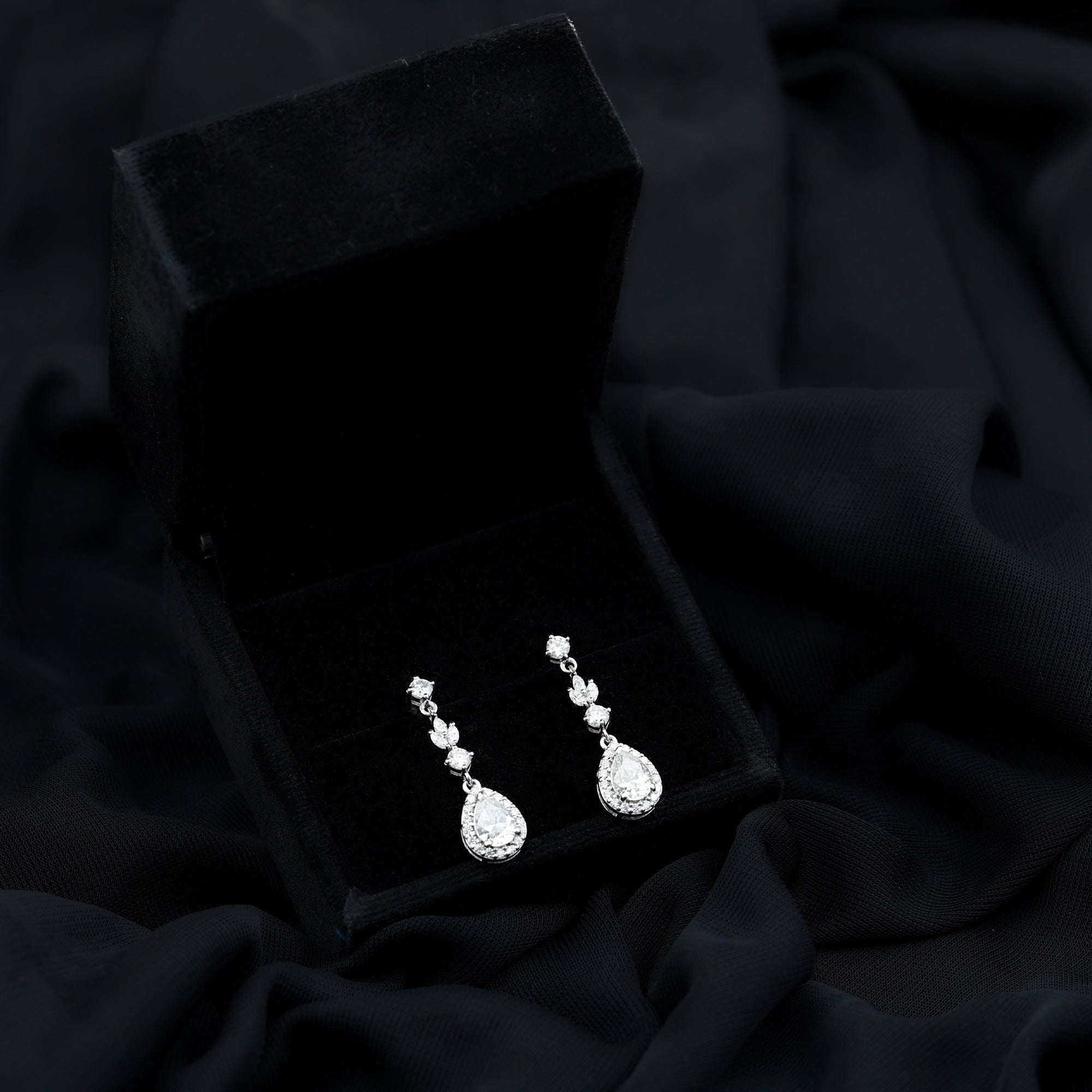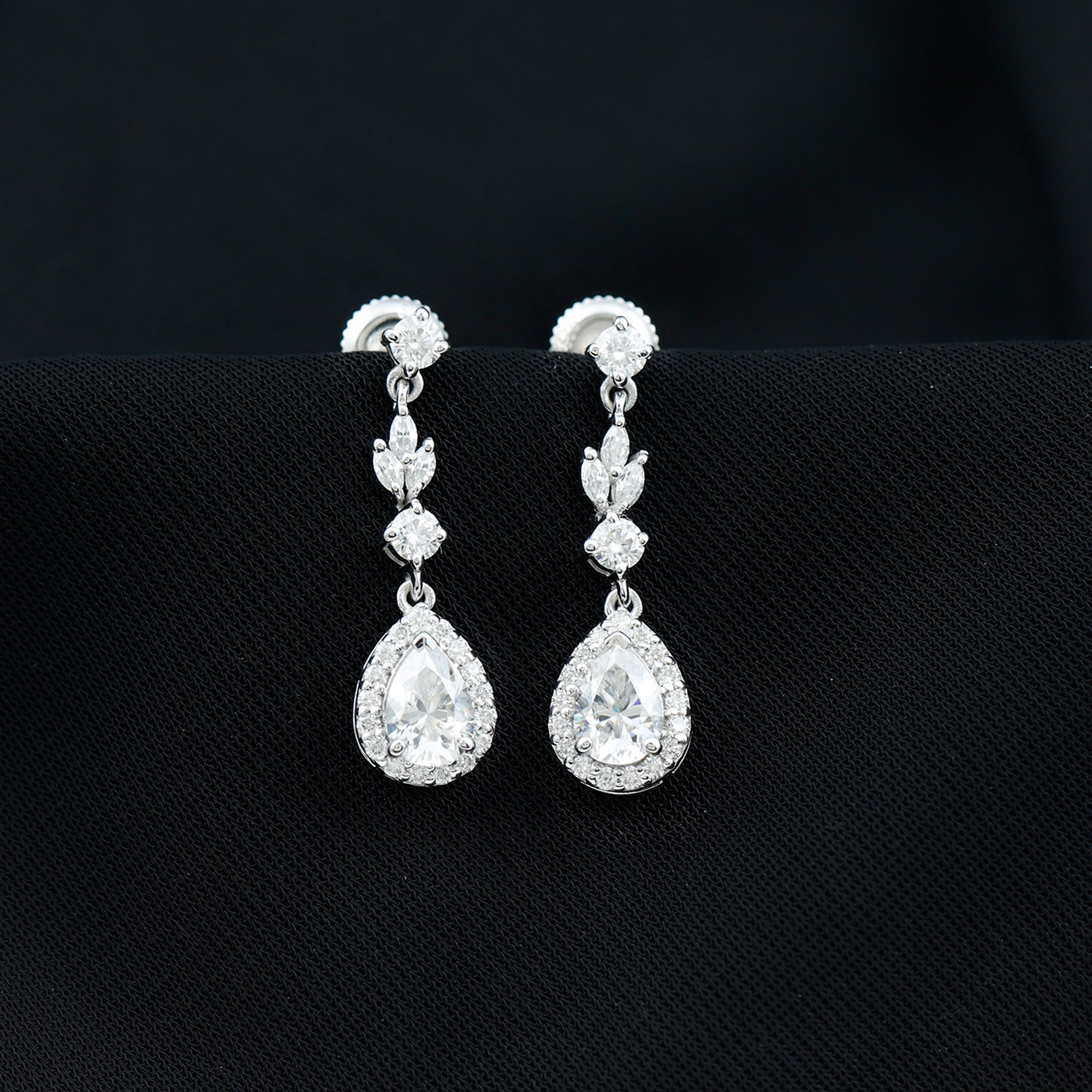 Simply stunning, our CZ Drop Earrings are crafted with 14K White Gold Plated Silver and are perfect for completing the Wedding Jewelry Set. The earrings feature a 5X7 MM Pear Shape Zircon secured in Prong Setting and encircled with Round Shape smaller stones. The center stone is linked with Round and Marquise shaped Zircon that gives it a dazzling effect to the earring. These Earrings with Screw on Backs stays on place throughout the day and dazzles with the remarkable shine of AAAAA Quality Cubic Zirconia. These Wedding Earrings will not only complete your look but also boost your confidence when you walk down the aisle.