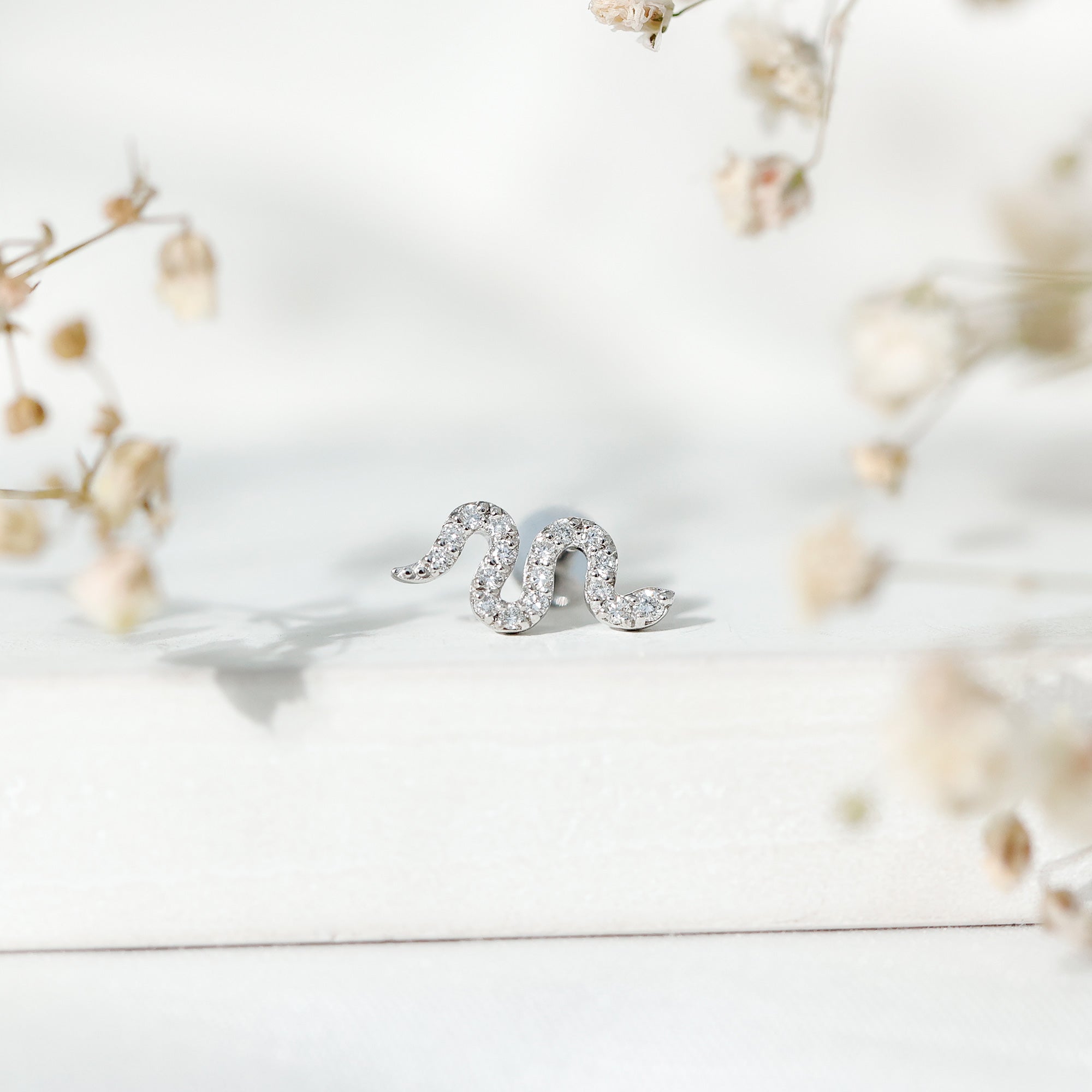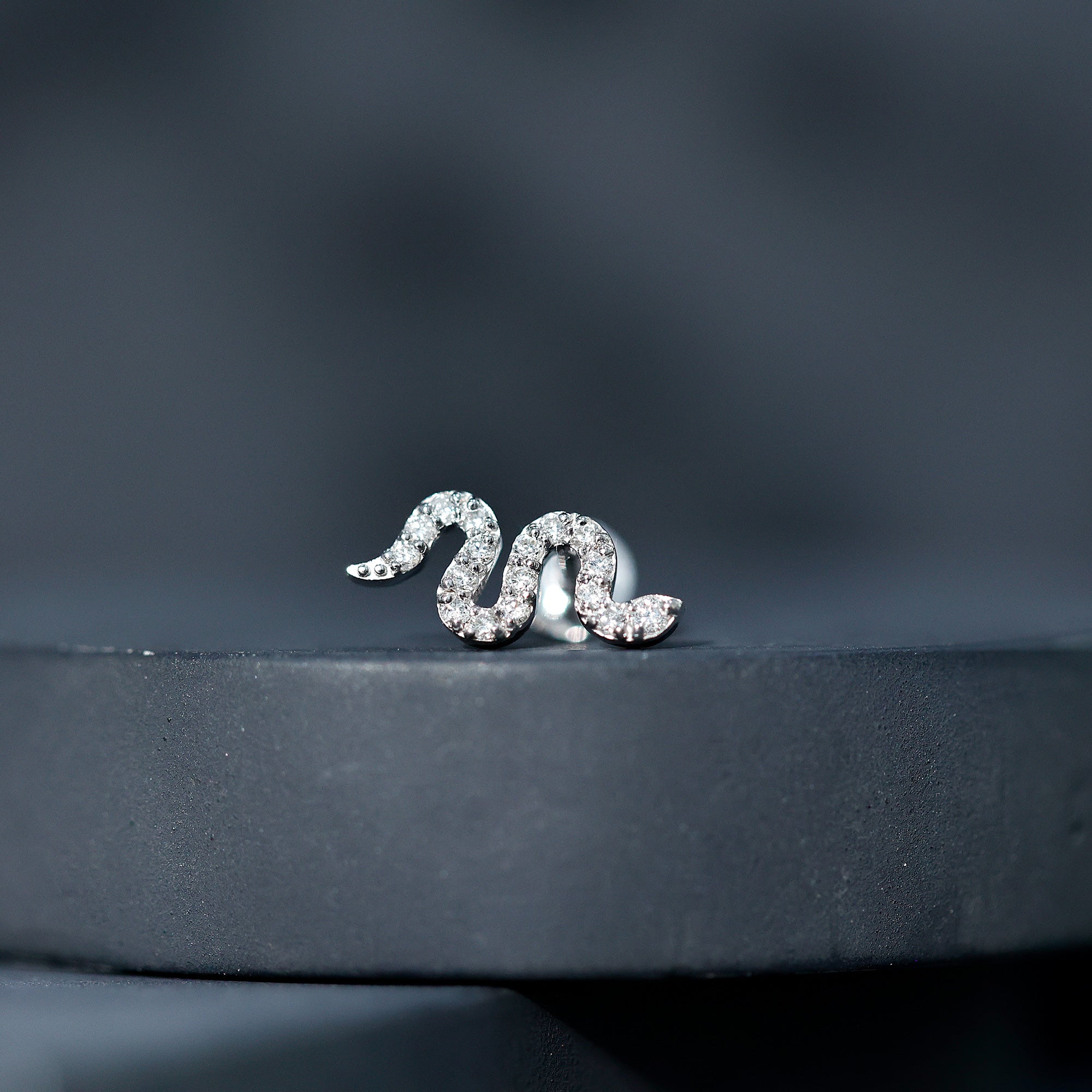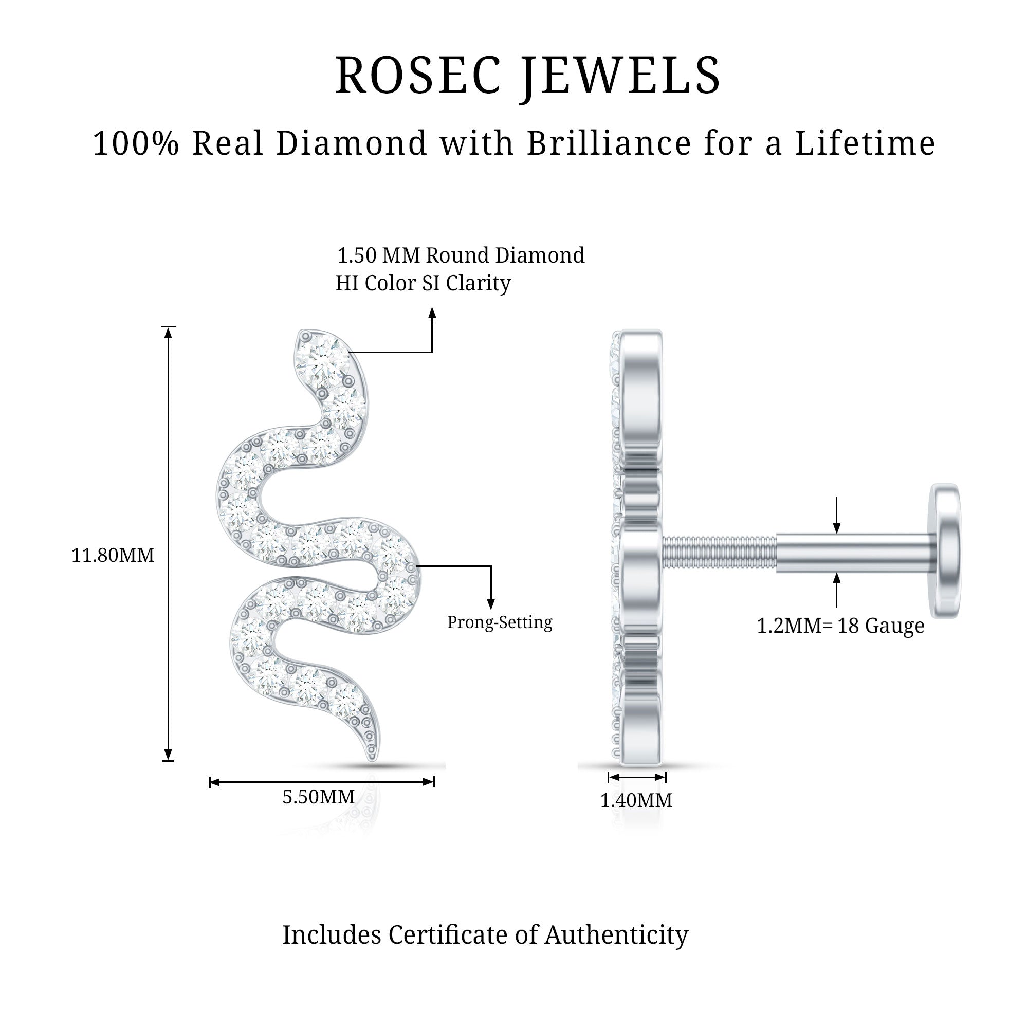 Certified Diamond Snake Earring for Cartilage Piercing ‐ Natural - ( HI-SI ) / 14K White Gold / Flat Back 4.5 MM