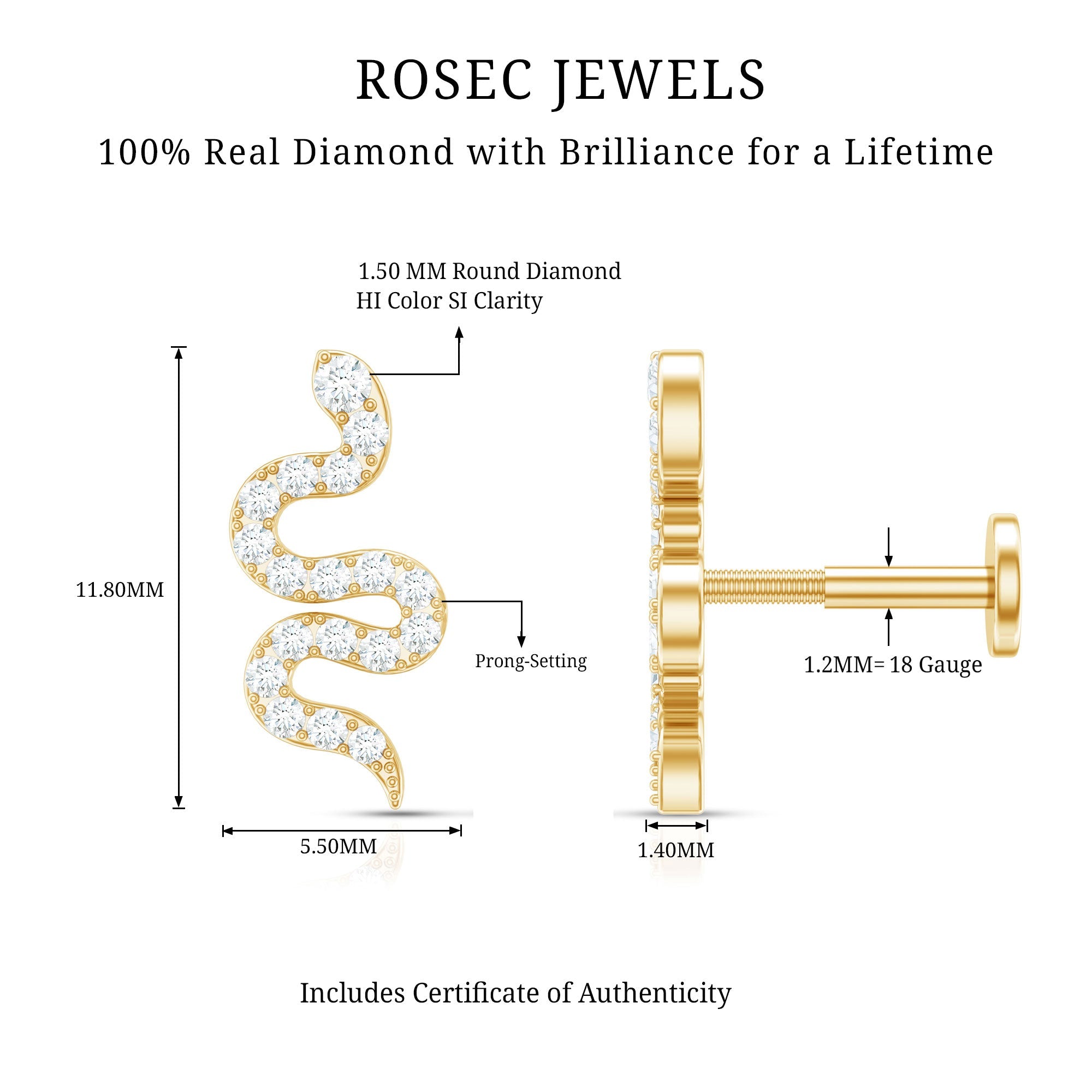 Certified Diamond Snake Earring for Cartilage Piercing ‐ Natural - ( HI-SI ) / 18K Yellow Gold / Flat Back 5.0 MM
