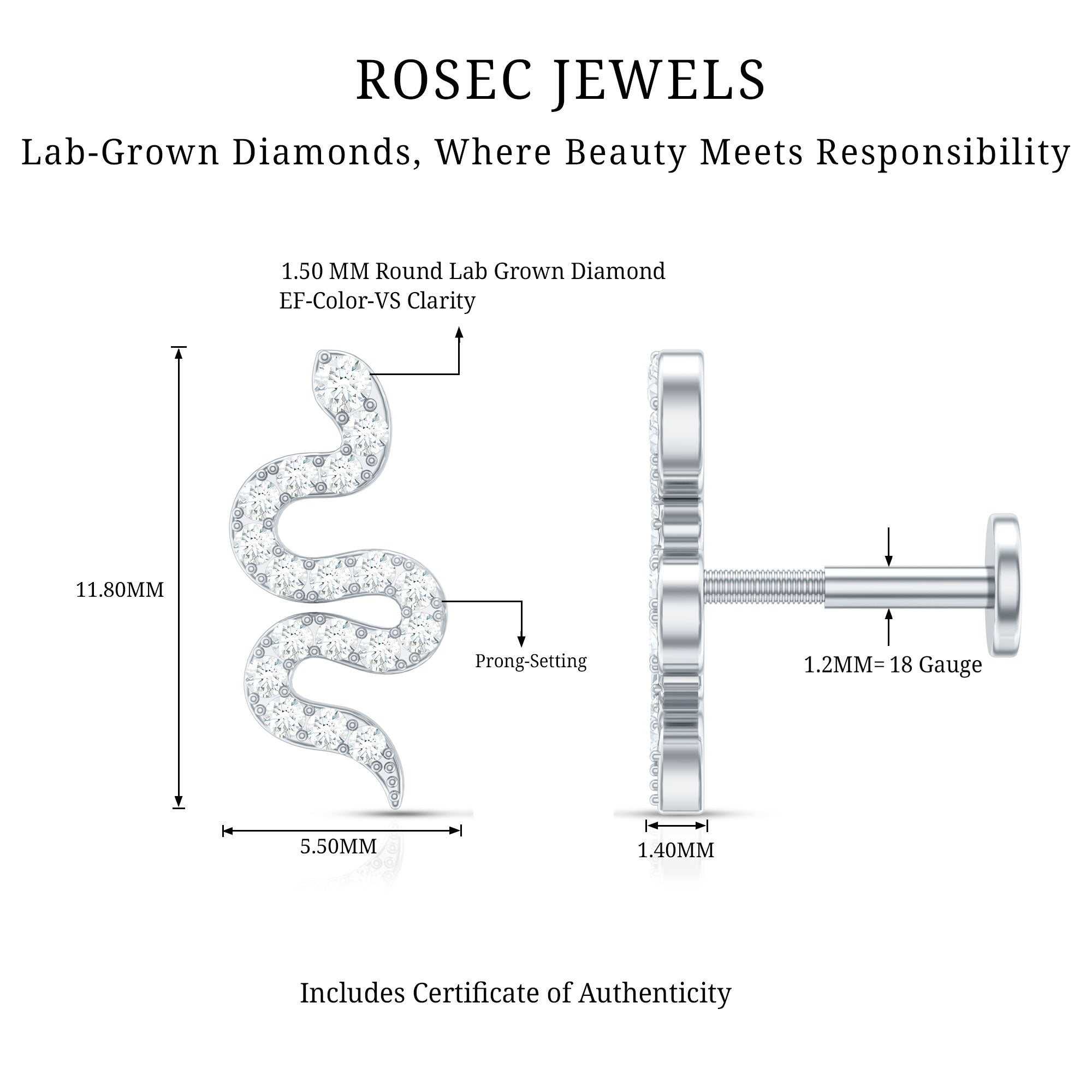 Certified Diamond Snake Earring for Cartilage Piercing ‐ Lab - ( EF-VS ) / 18K White Gold / Flat Back 5.5 MM