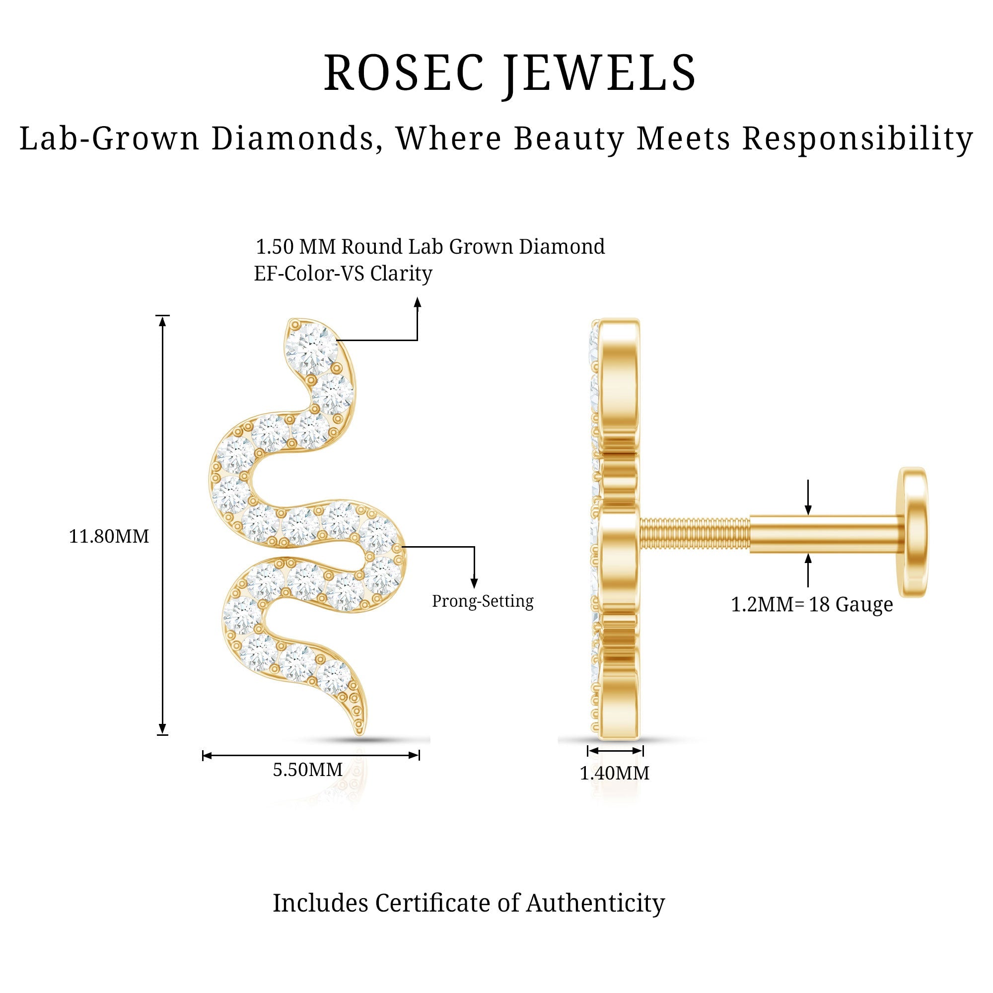 Certified Diamond Snake Earring for Cartilage Piercing ‐ Lab - ( EF-VS ) / 18K Yellow Gold / Flat Back 5.5 MM