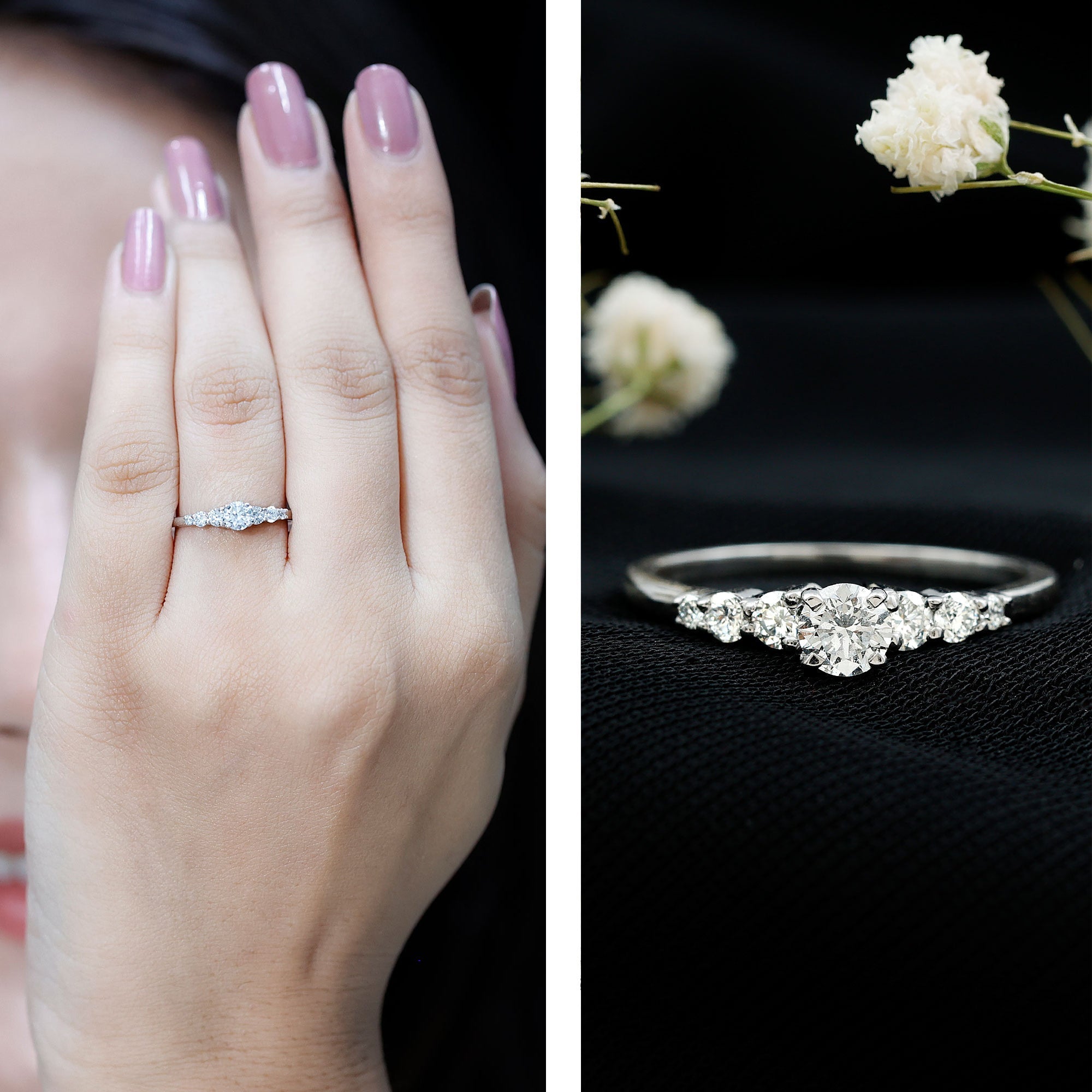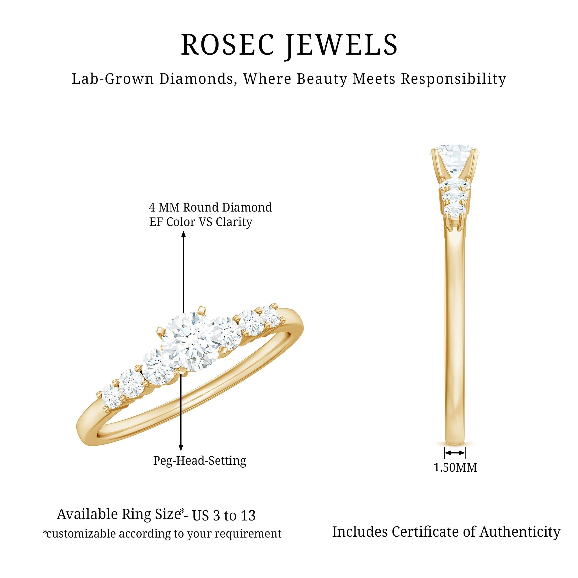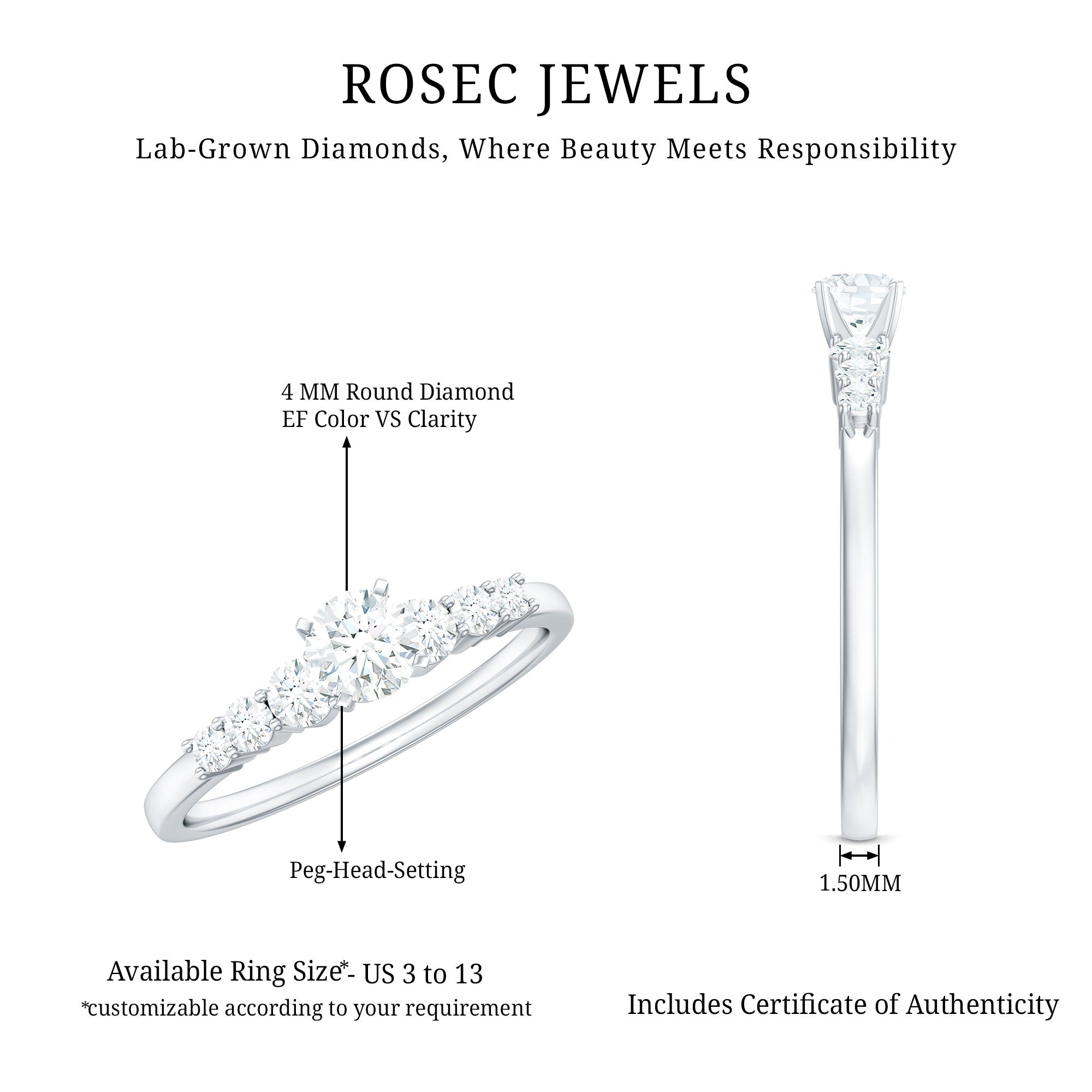Make a promise to forever and seal it with this stunning Lab Grown Diamond Ring. At its heart lies a 4 mm round cut lab grown diamond set in a safe peg head setting, gracefully flanked on either side by a series of graduated diamonds (synthetic, round cut). The total gemstone weight in this Classic Engagement Ring is approximately 0.5 carat. Additionally, this Minimalist Ring is available in a variety of metal colors, ring sizes, and purity options. Whether you are planning a dream proposal or simply want a Side Stone Ring for her that tells your love story, this piece has it all. It comes with a certificate of authenticity, giving you complete peace of mind about your purchase.