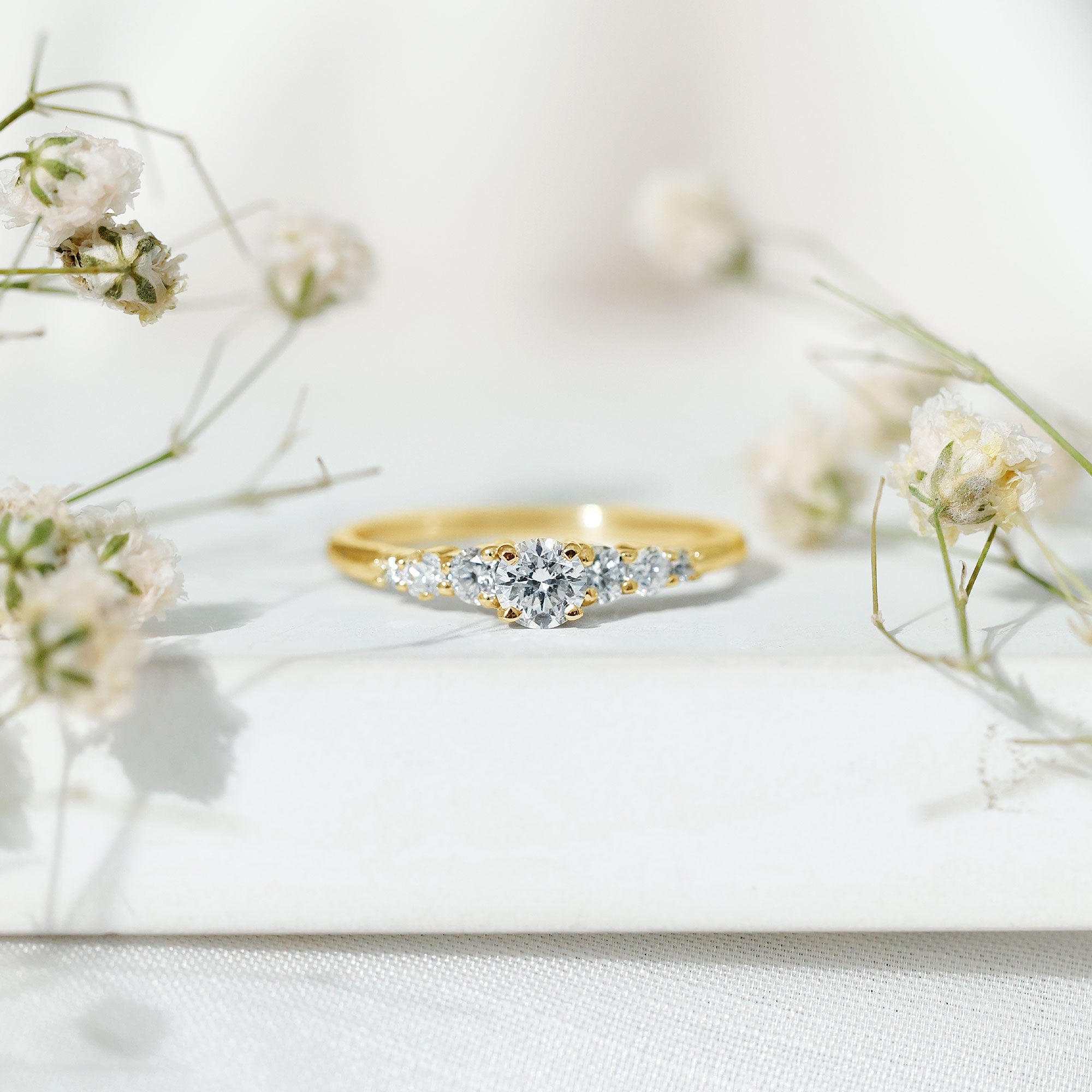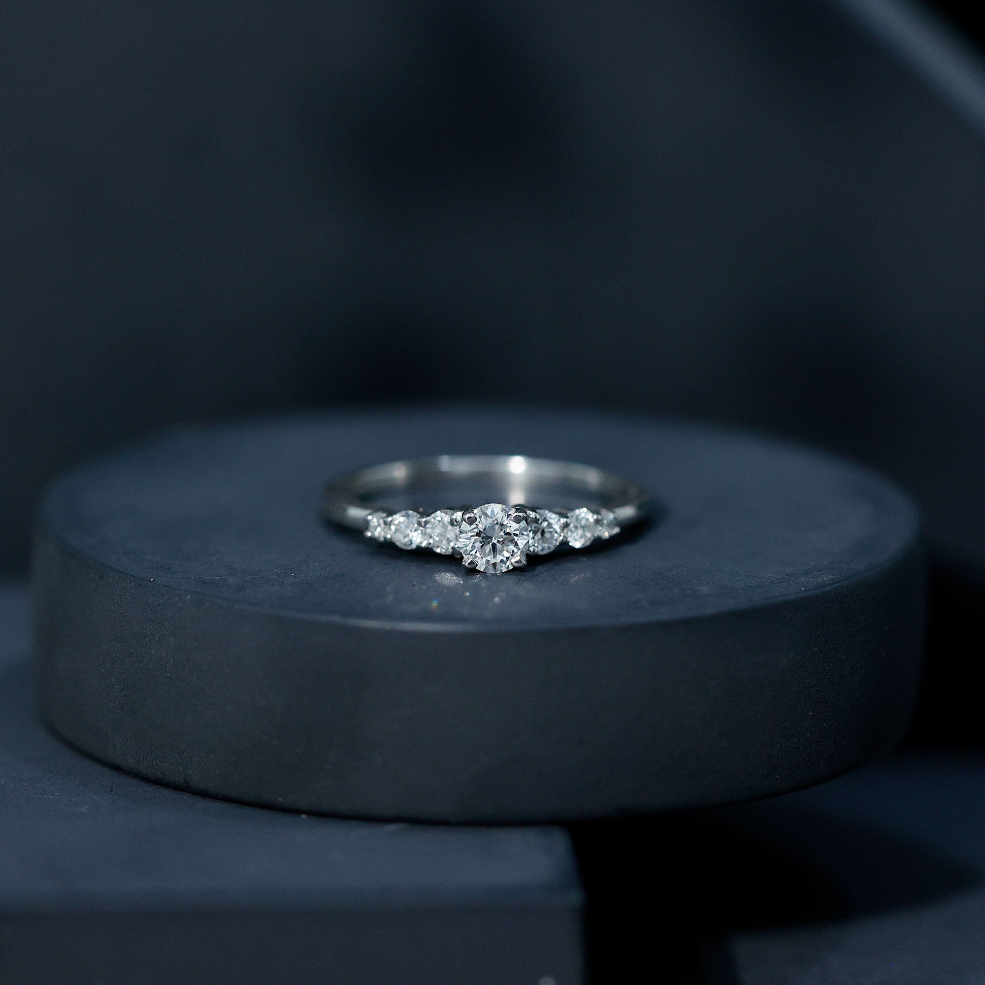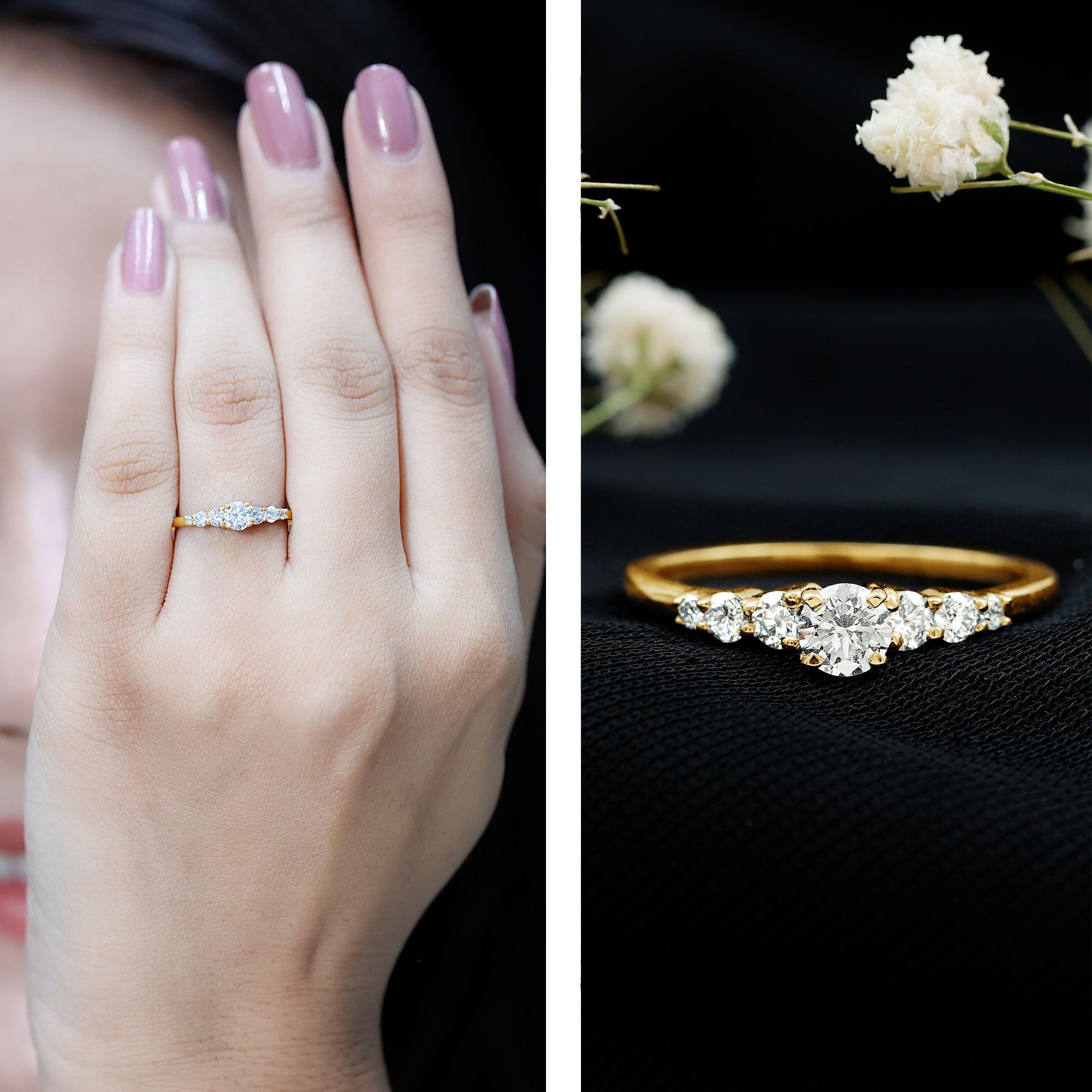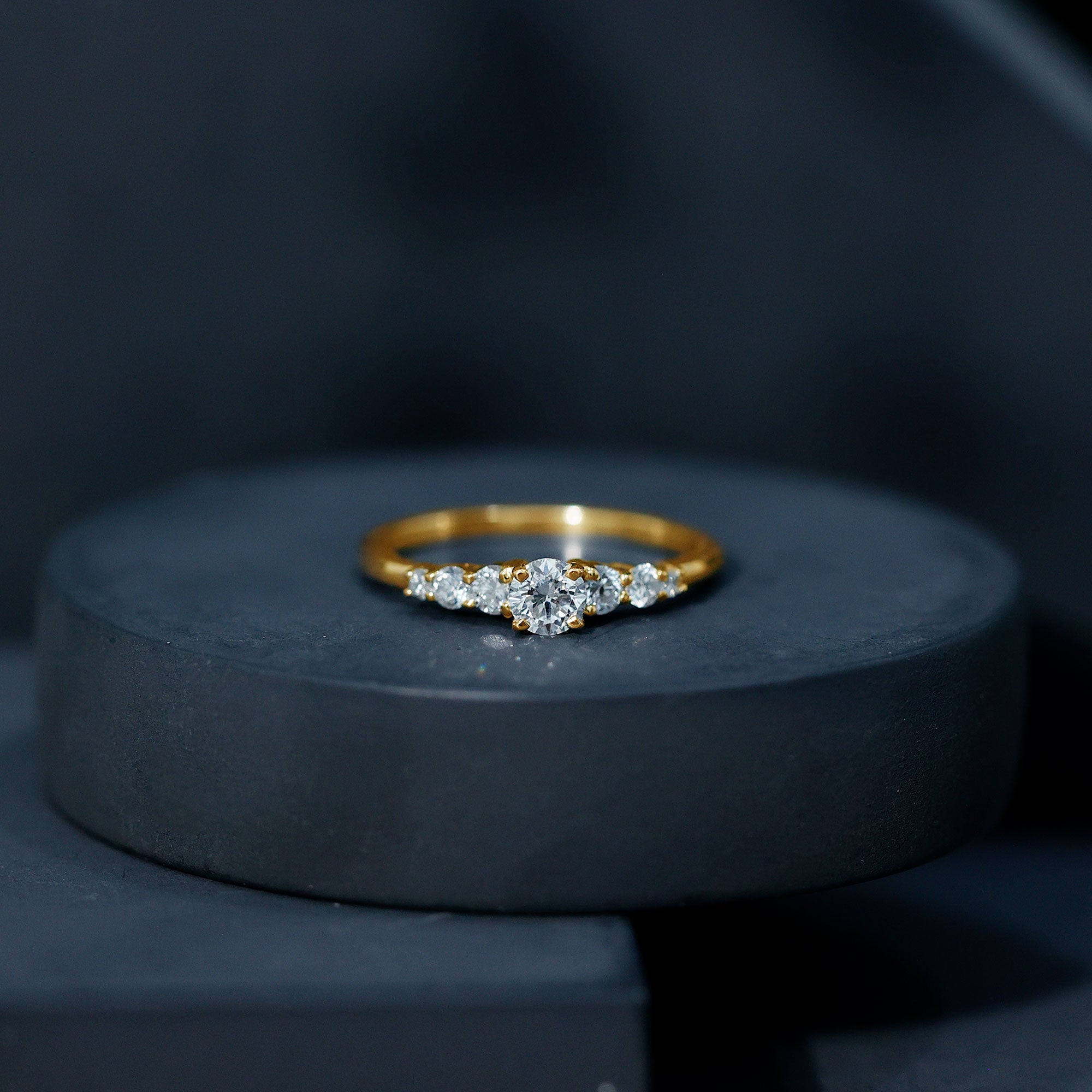 Make a promise to forever and seal it with this stunning Lab Grown Diamond Ring. At its heart lies a 4 mm round cut lab grown diamond set in a safe peg head setting, gracefully flanked on either side by a series of graduated diamonds (synthetic, round cut). The total gemstone weight in this Classic Engagement Ring is approximately 0.5 carat. Additionally, this Minimalist Ring is available in a variety of metal colors, ring sizes, and purity options. Whether you are planning a dream proposal or simply want a Side Stone Ring for her that tells your love story, this piece has it all. It comes with a certificate of authenticity, giving you complete peace of mind about your purchase.