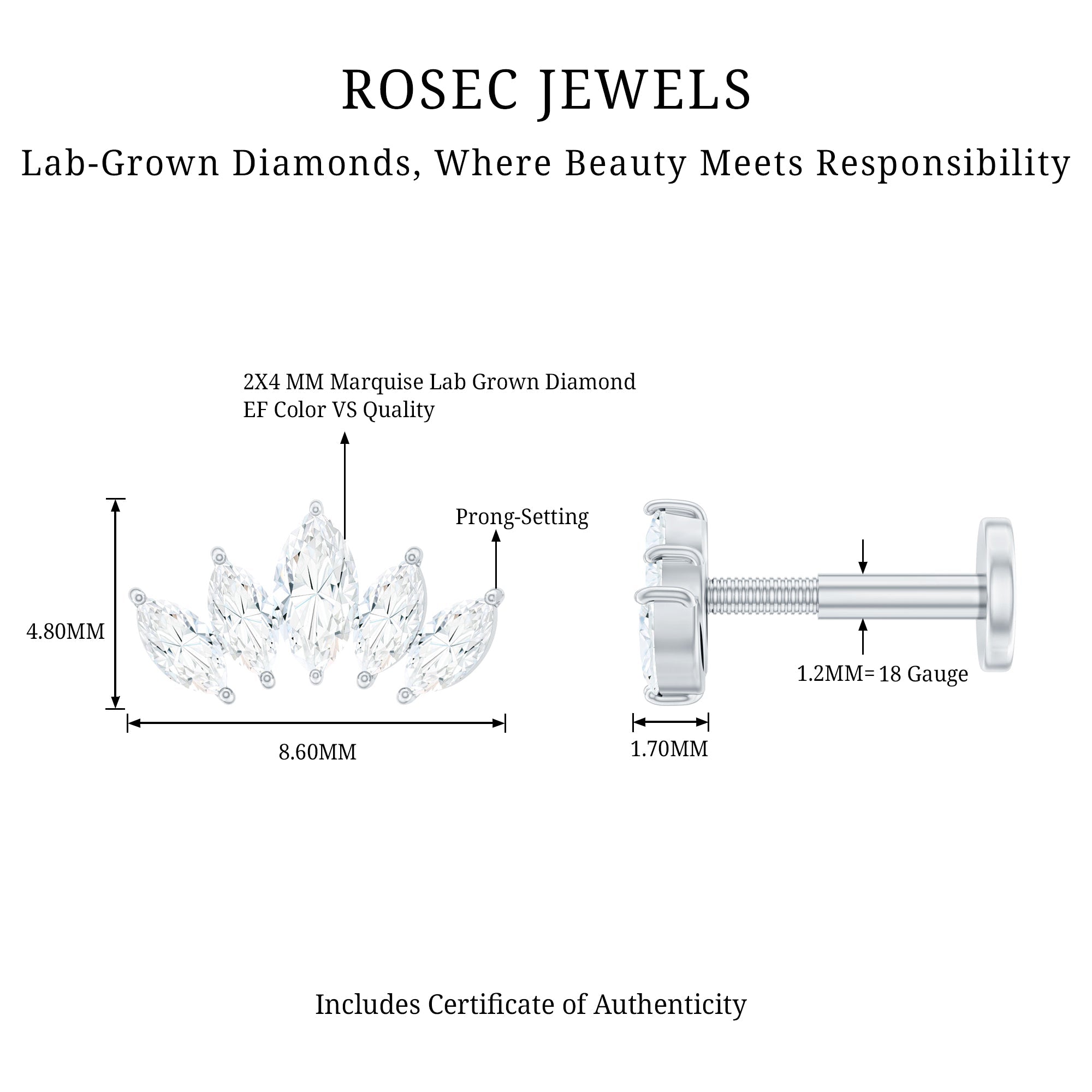 Certified Marquise Cut Diamond Helix Earring for Women ‐ Lab - ( EF-VS ) / 18K White Gold / Flat Back 4.5 MM