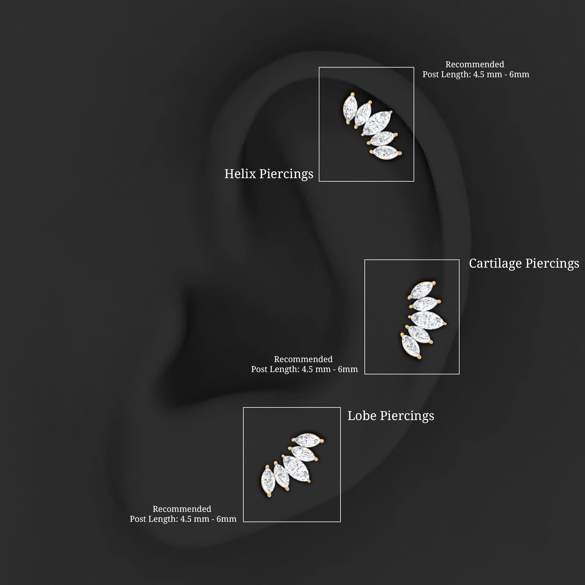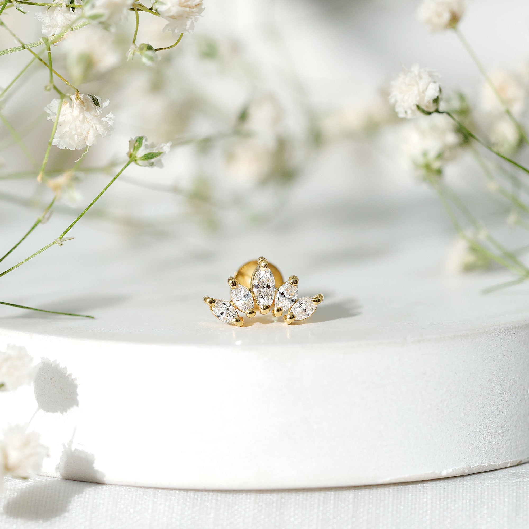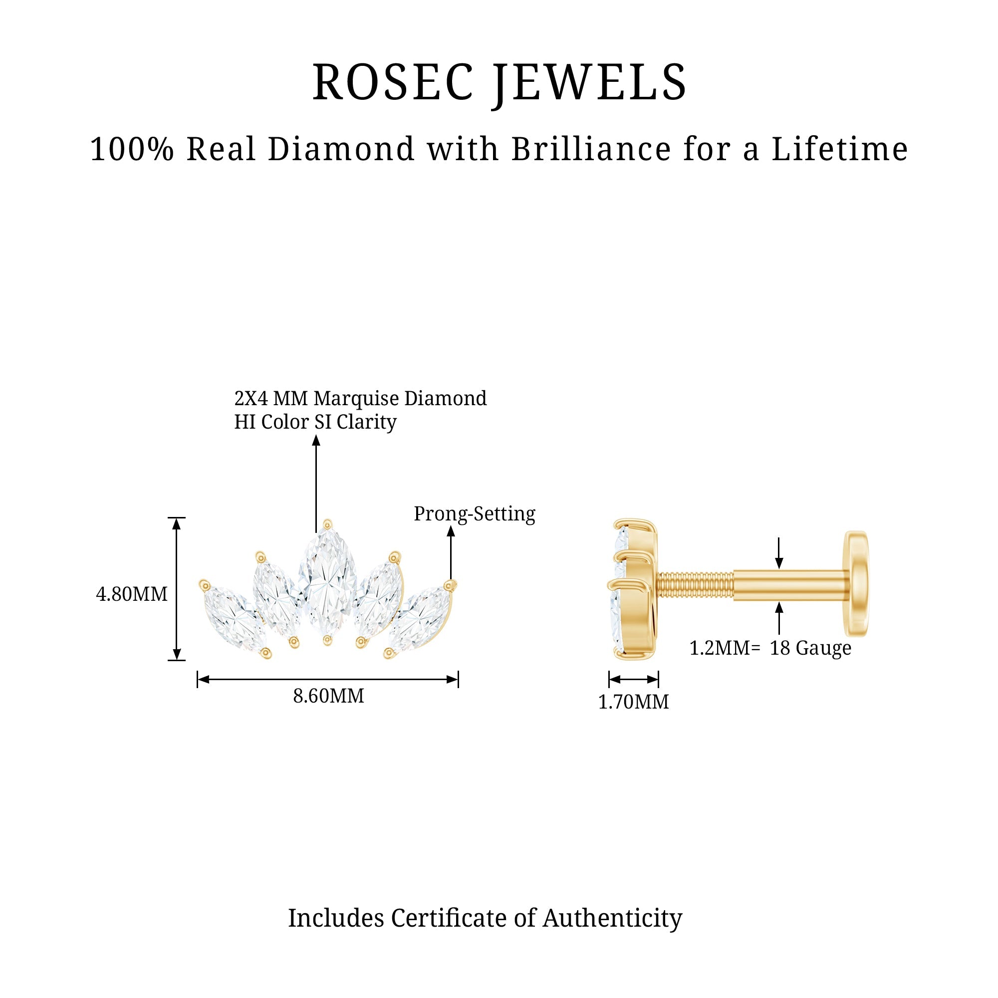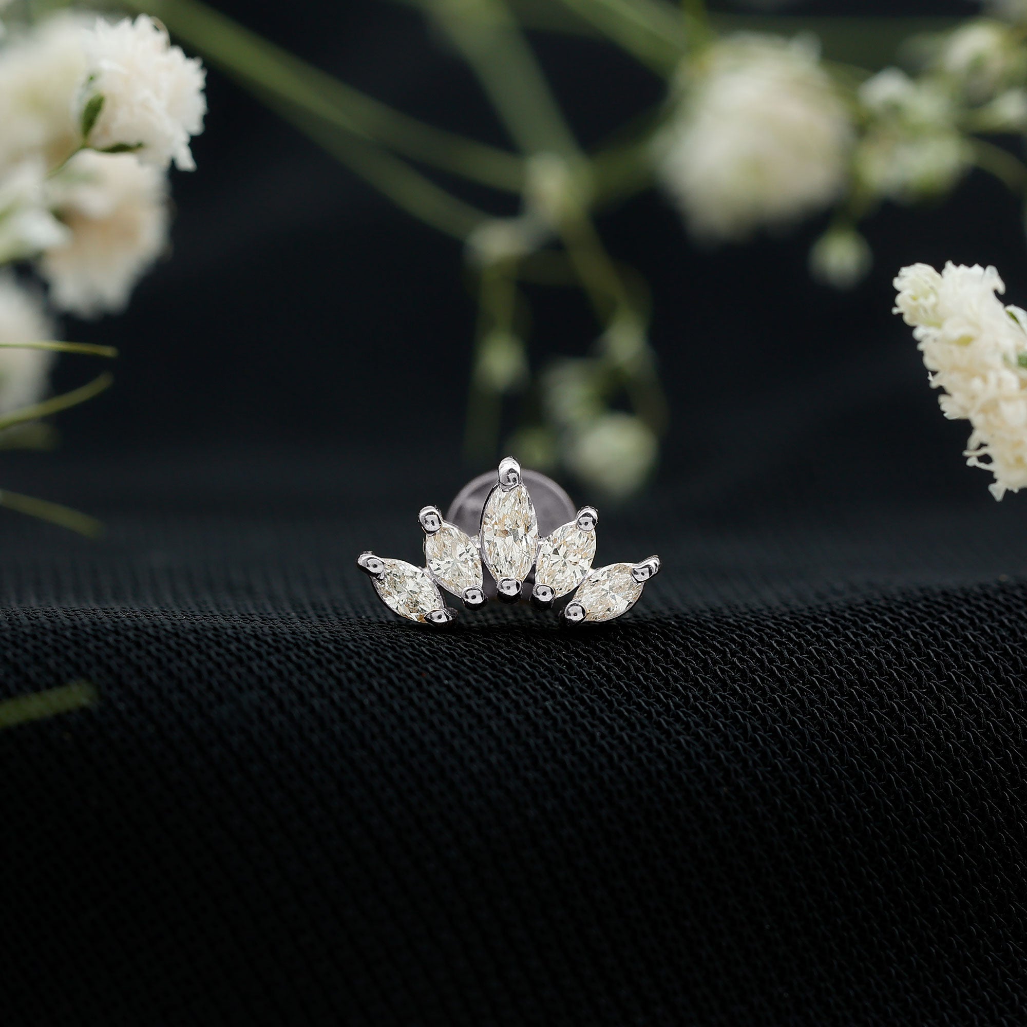 Diamond piercing jewelry is trending everywhere! This Diamond Helix Stud is a perfect piece to enhance your collection. Showcasing five Marquise Shape Diamonds assembled as leaf design secured by Prong Setting, adding a touch of sparkle and shine. There are endless ways to style this Marquise Stud Earring, pair it with another stud, hoop, or any bold statement piece of jewelry. You can wear it on your multiple piercings like Helix, Cartilage, or Upper Lobe Piercing. Present this Cartilage Piercing Earring to your special one and capture her priceless reaction! You can present this as a birthday gift, an anniversary gift, or a romantic surprise, it beautifully marks lifes most cherished moments. It offers a wide range of metal color options and is also available in various metal choices. This Piercing Stud comes with a certificate of authenticity for gemstones and is packaged in a premium storage box.