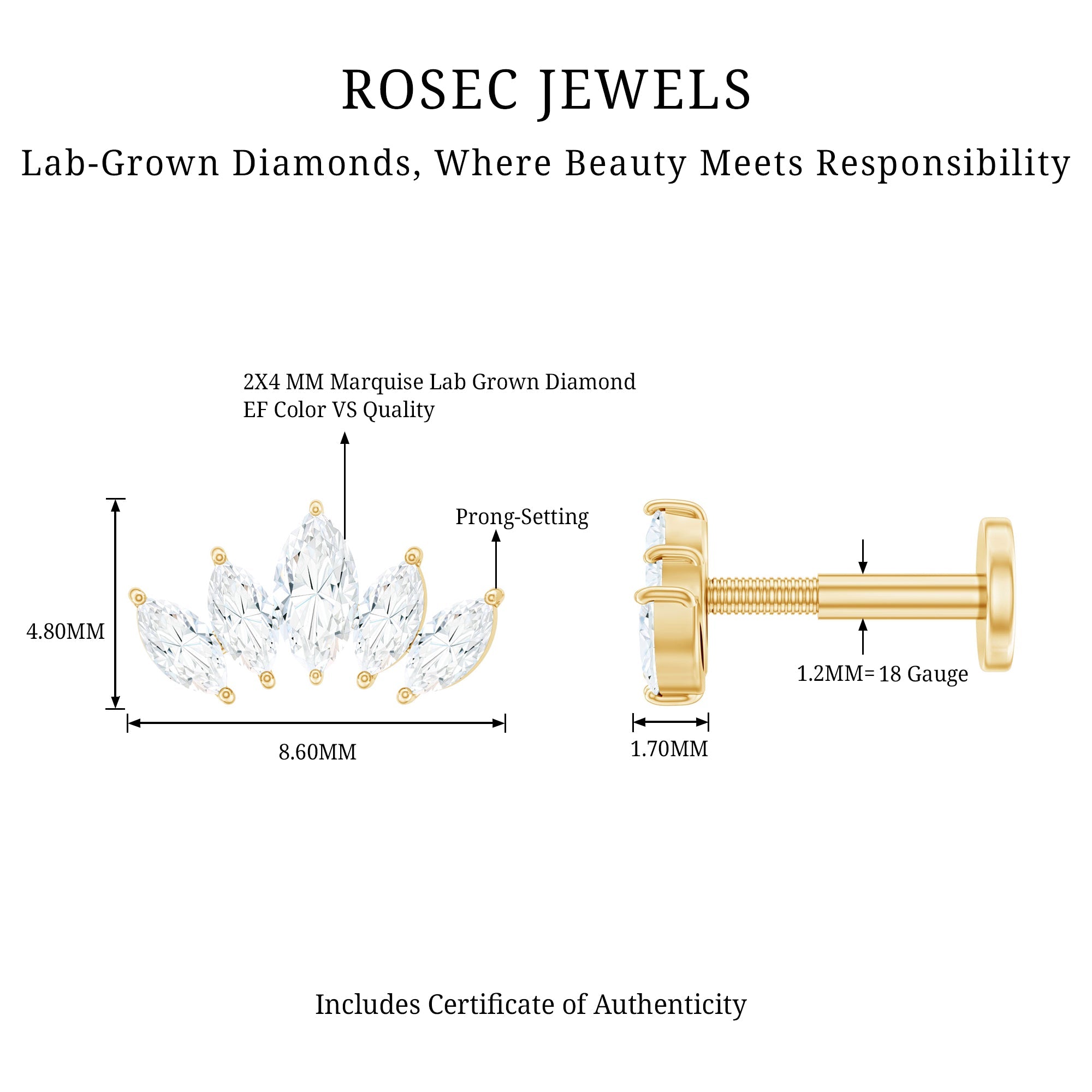 Certified Marquise Cut Diamond Helix Earring for Women ‐ Lab - ( EF-VS ) / 14K Yellow Gold / Flat Back 4.5 MM