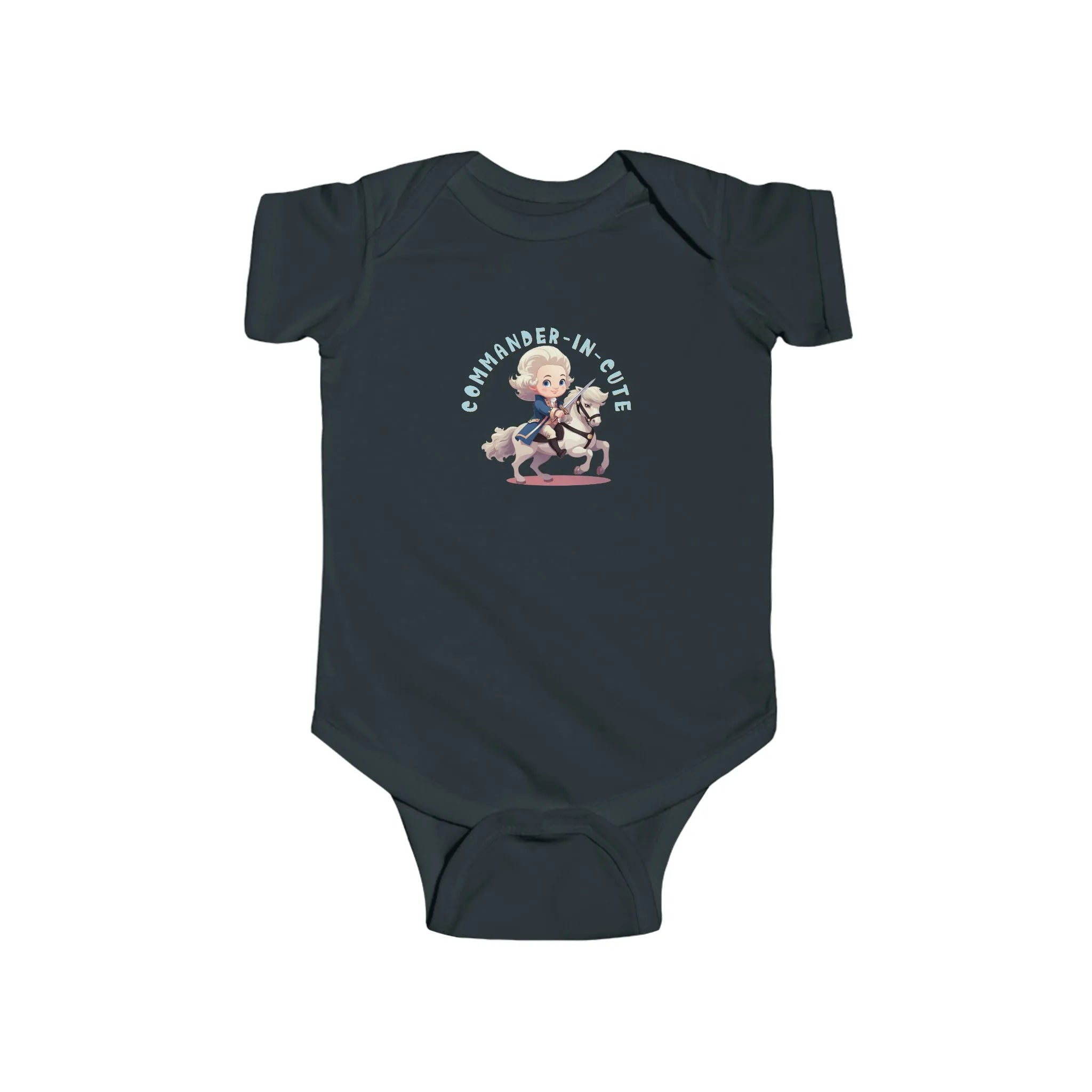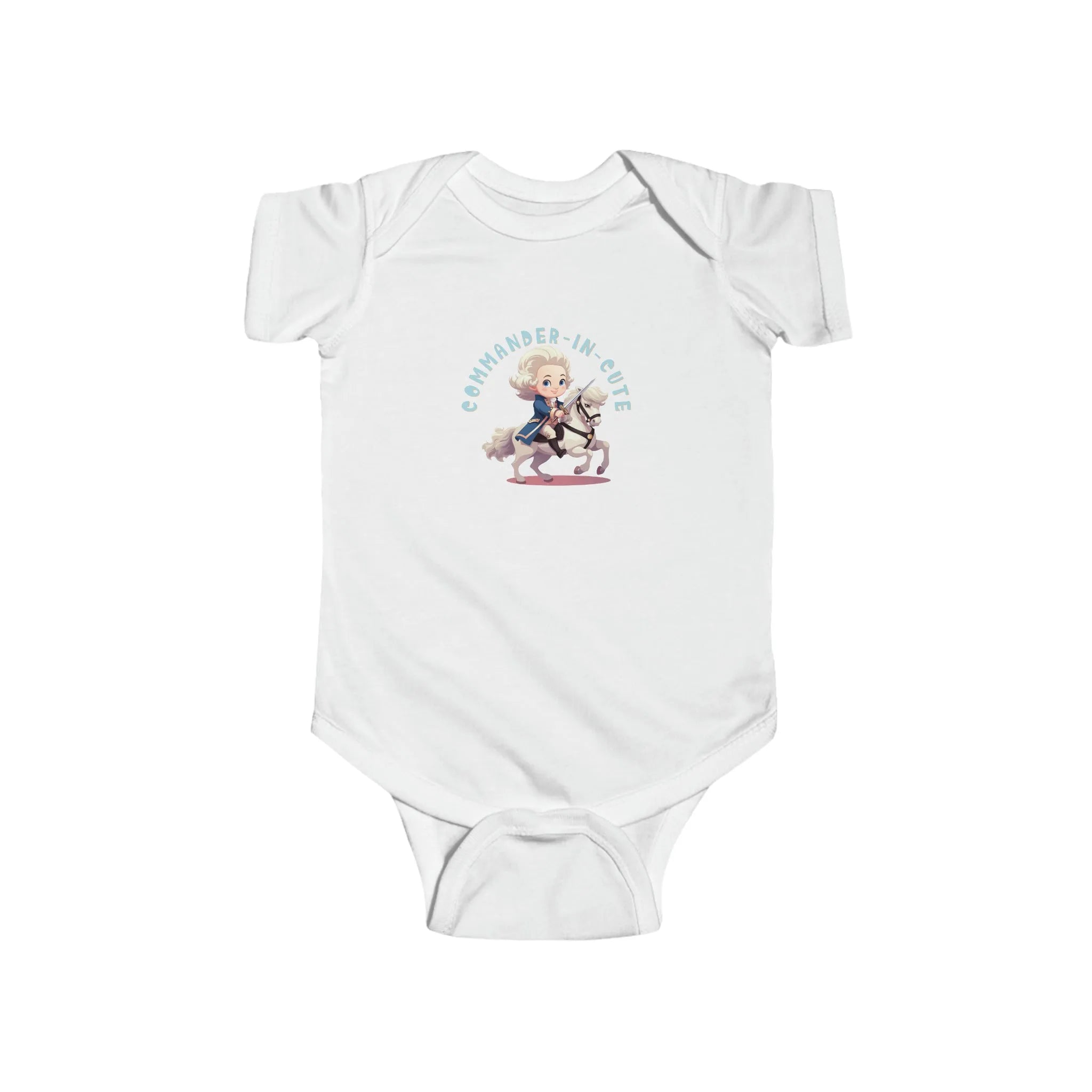 Introducing our delightful "Commander-in-Cute" baby outfit, a perfect blend of history and adorableness! This outfit features an enchanting picture of baby George Washington, the founding father himself, mounted on a charming pony and brandishing an adorable sword. Crafted with utmost care and attention to detail, this ensemble captures the spirit of bravery and cuteness in one delightful package. Made from soft, high-quality fabric, it ensures maximum comfort for your little one while they embark on imaginative adventures. Let your baby's irresistible charm and patriotic spirit shine bright with this unique and charming outfit, inspiring smiles and awe wherever they go. Prepare for a delightful blend of history and cuteness that's sure to capture hearts!