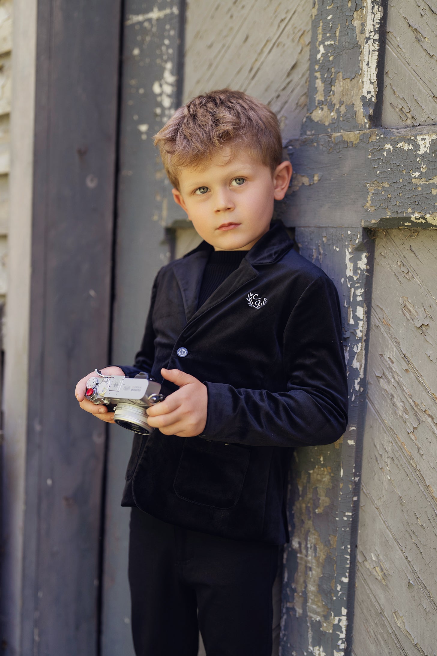 Boys velvet jacket with crest embroidery at left side chest and center front button opening.ֲ