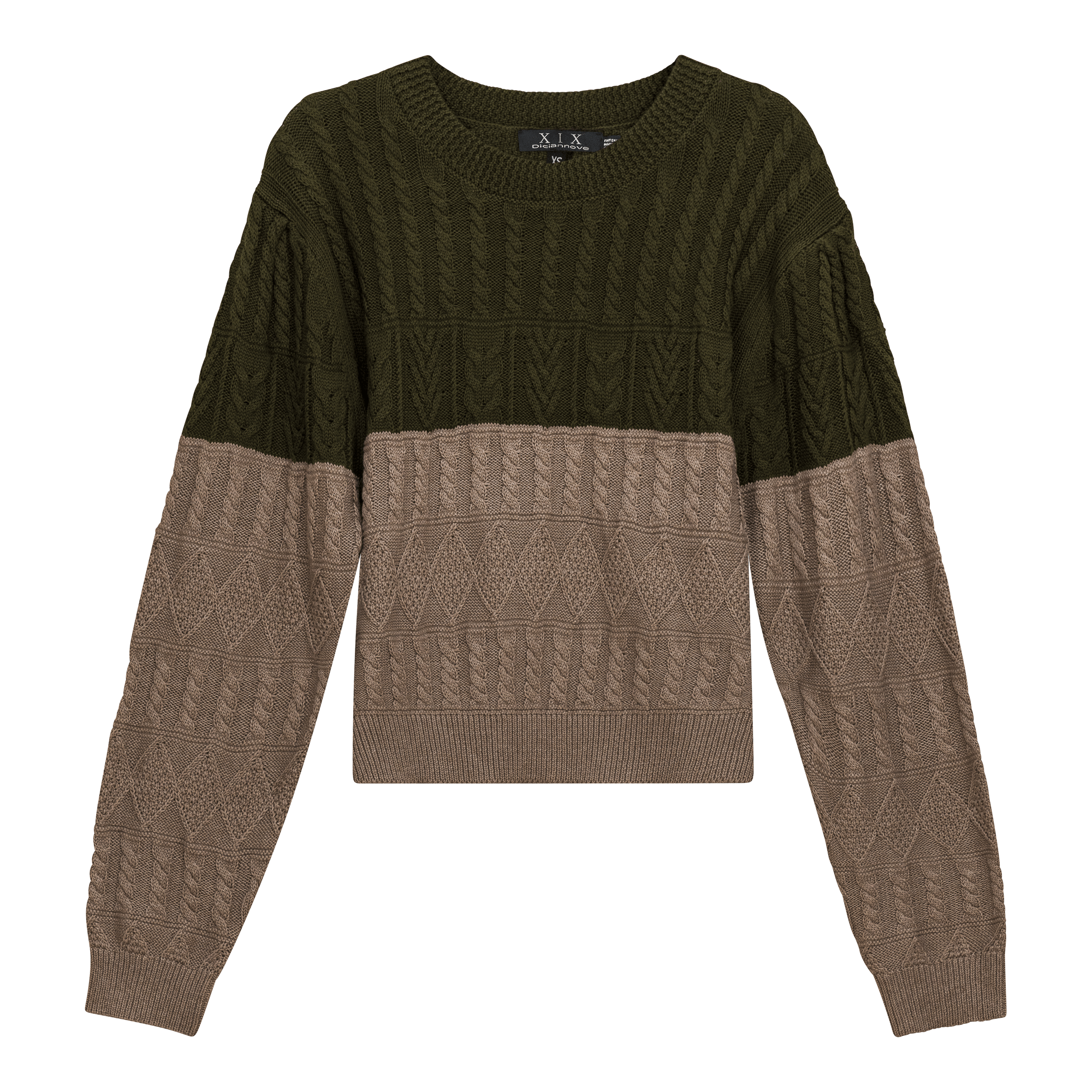 Cropped 2 Tone Cable Knit Sweater ‐ Olive/Stone / 1XL