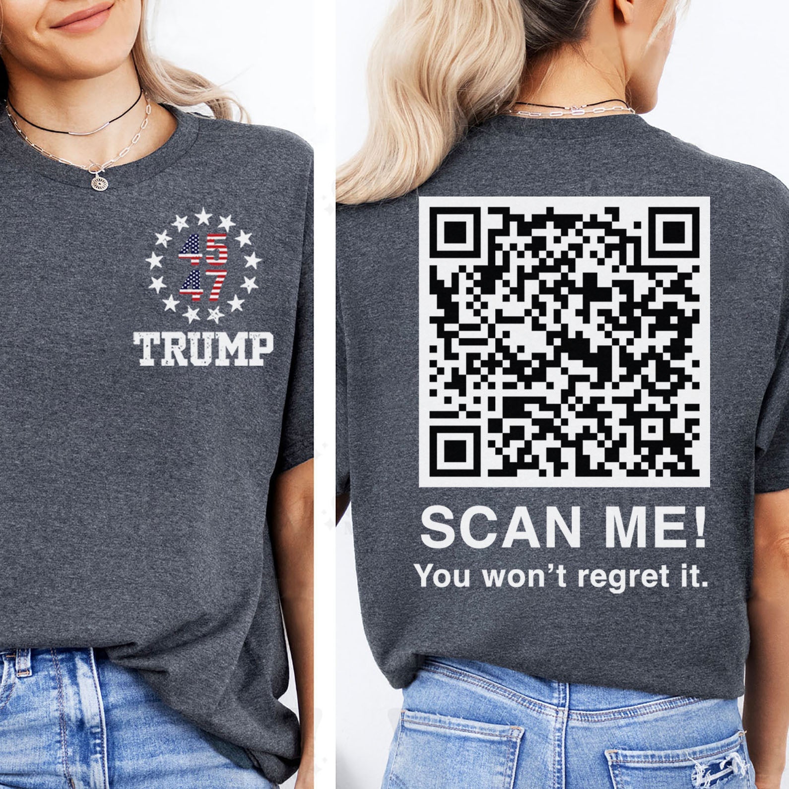 Dancing Trump QR Code Shirts | Funny Trump Tshirts | Unique Political Shirts | Republican Political T-shirts | Trump Front & Back Shirt Dark 681878 - GOP ‐ Women Tee / Dark Heather Color / M