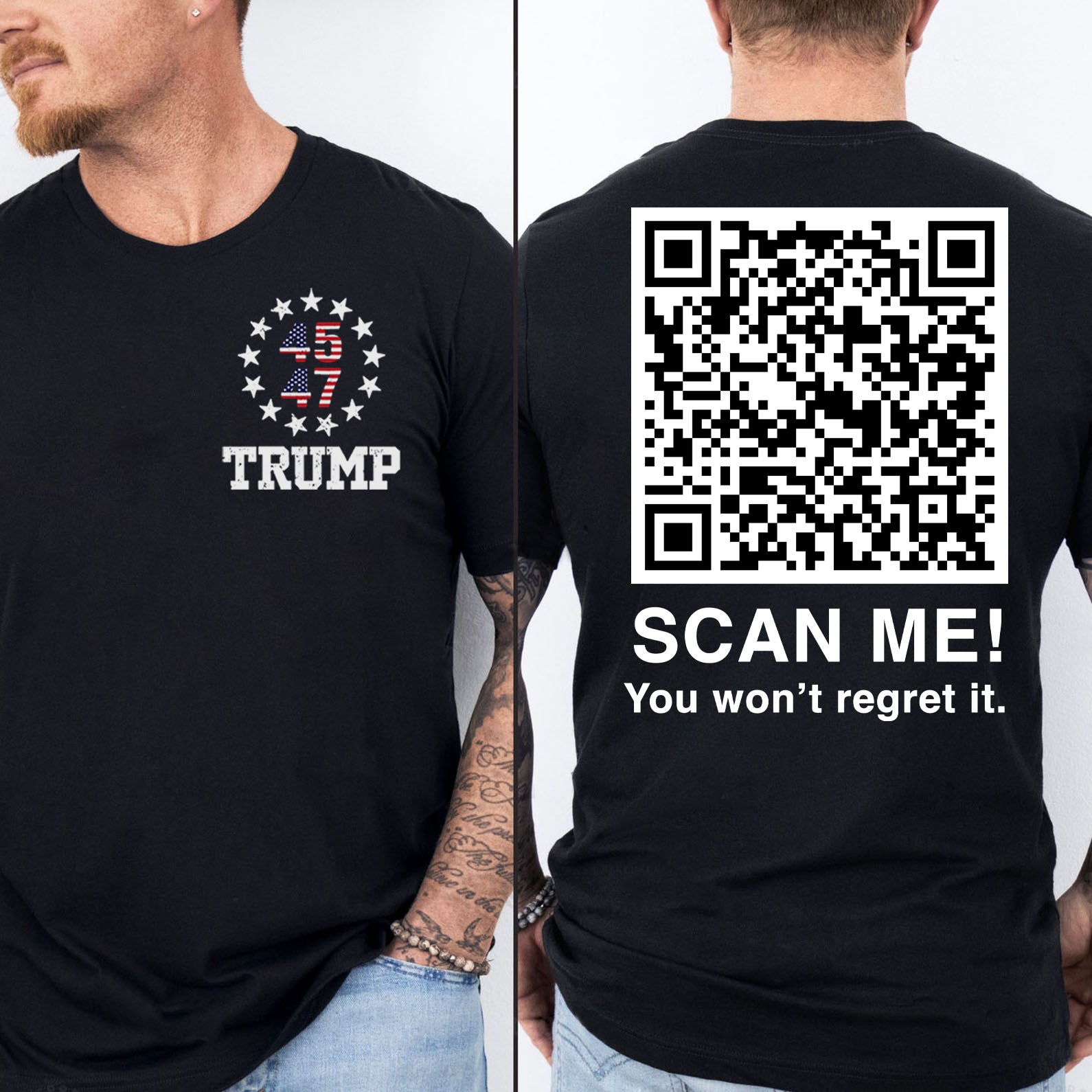 This t-shirt features a bold political with a prominent circular logo on the left chest area, composed of white stars surrounding the numbers "45" and "47," with the American flag pattern incorporated into the numbers. Below the circle is the bold text "TRUMP" in white capital letters, emphasizing a patriotic theme. Back Design: A large white QR code centered on the back, adding a modern and interactive touch to the design. The overall aesthetic is clean and bold, combining classic and contemporary elements to make a statement.