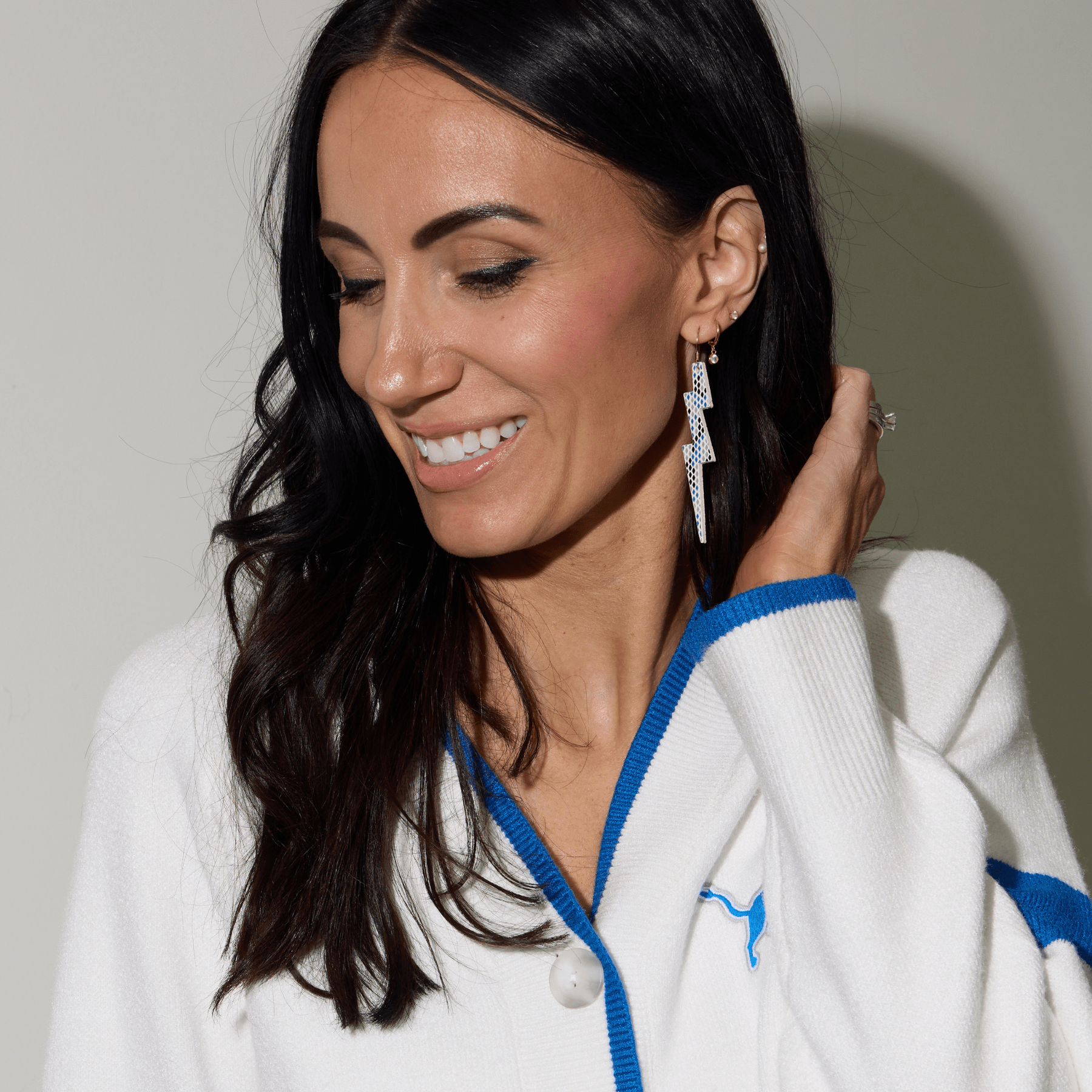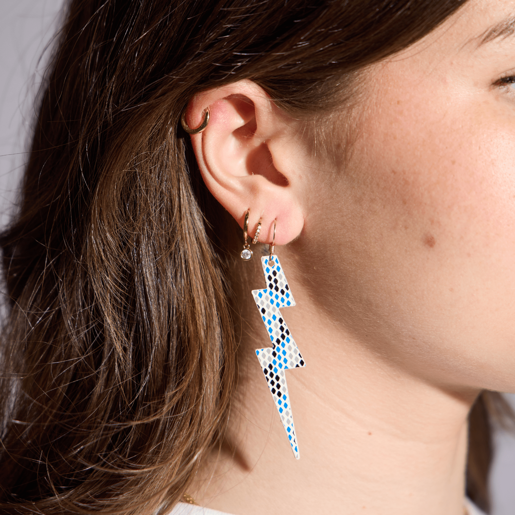 Get Thunderstruck with our Detroit Lightning Bolts - our iconic bolt silhouette that features our smooth crimson leather that is hand-stamped with metallic blue and gray iridescent foil in a snake-skin pattern.