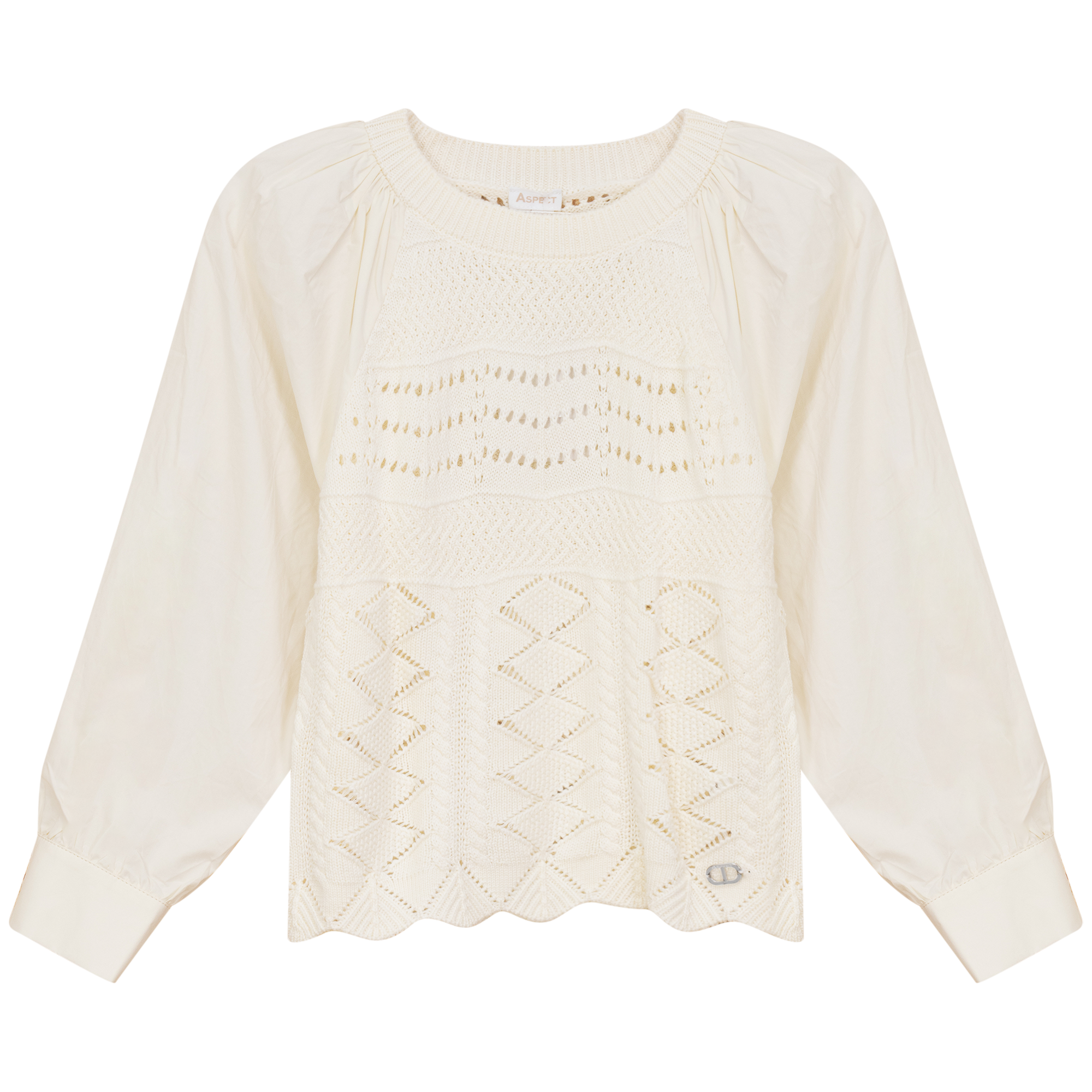 Teens 3/4 sleeved knit top with cotton sleeves, and scalloped edge hemband. ֲ