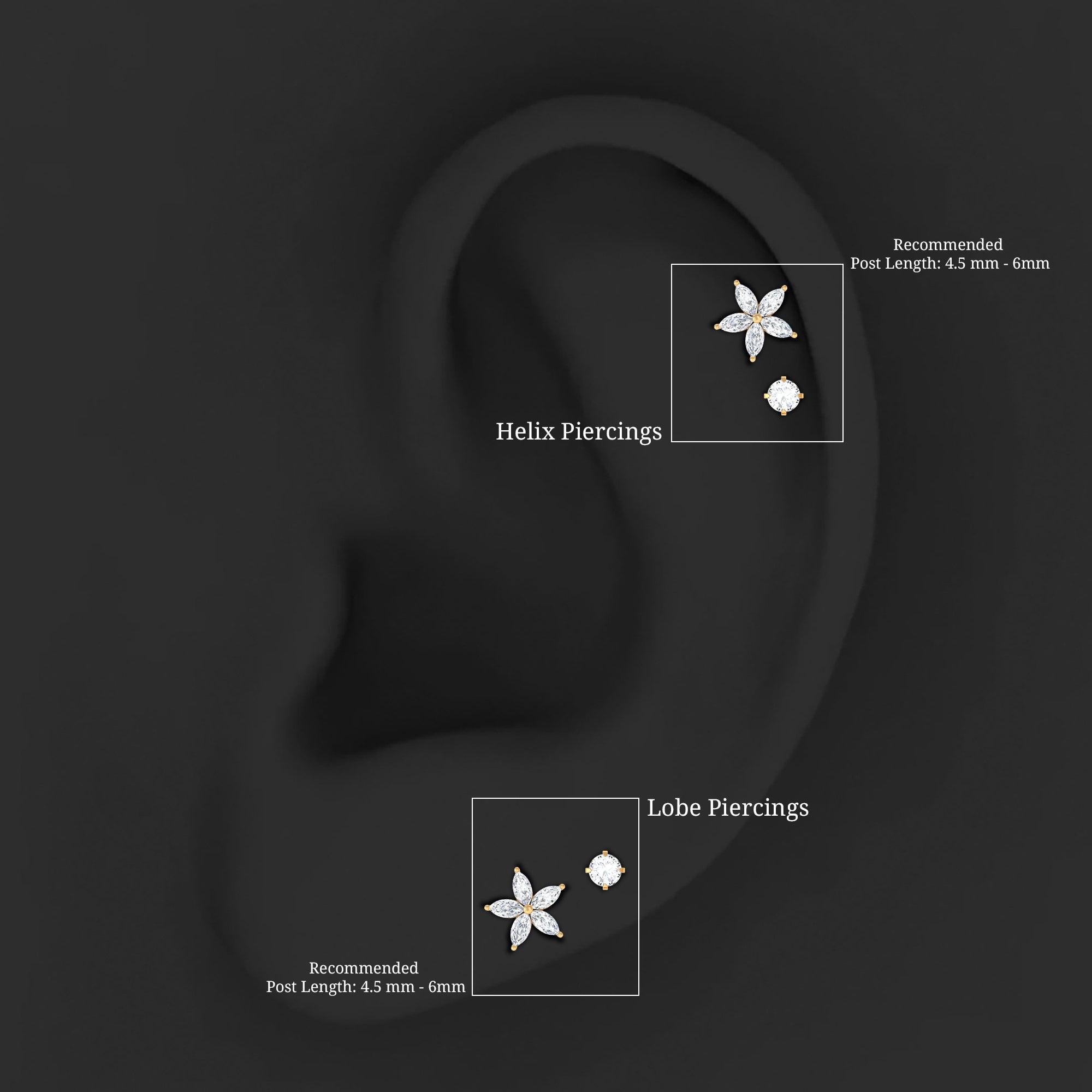 The Moissanite Flower Cartilage Earrings Set is embellished with Marquise Cut Moissanites assembled in a Floral Design and a dainty Round Cut Moissanite, crafted in Gold for a luxurious look. You can style these Moissanite Earrings Set on your Helix, Cartilage, or Upper Lobe Piercing and a Flat Back Closure that will keep it secured in the right place.