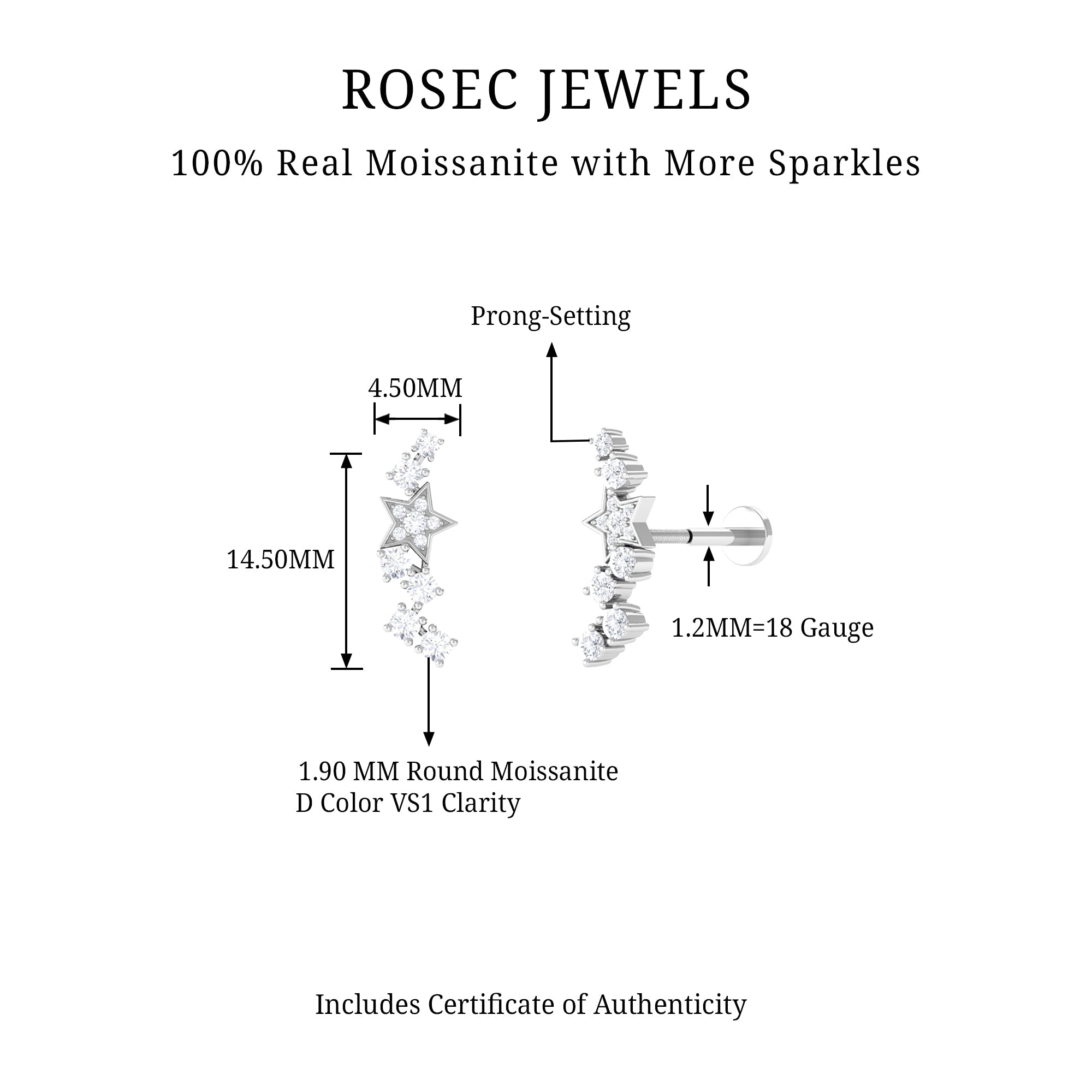 Moissanite Star Celestial Crawler Earring for Helix Piercing ‐ D-VS1 / 14K White Gold / Flat Back 4.5 MM