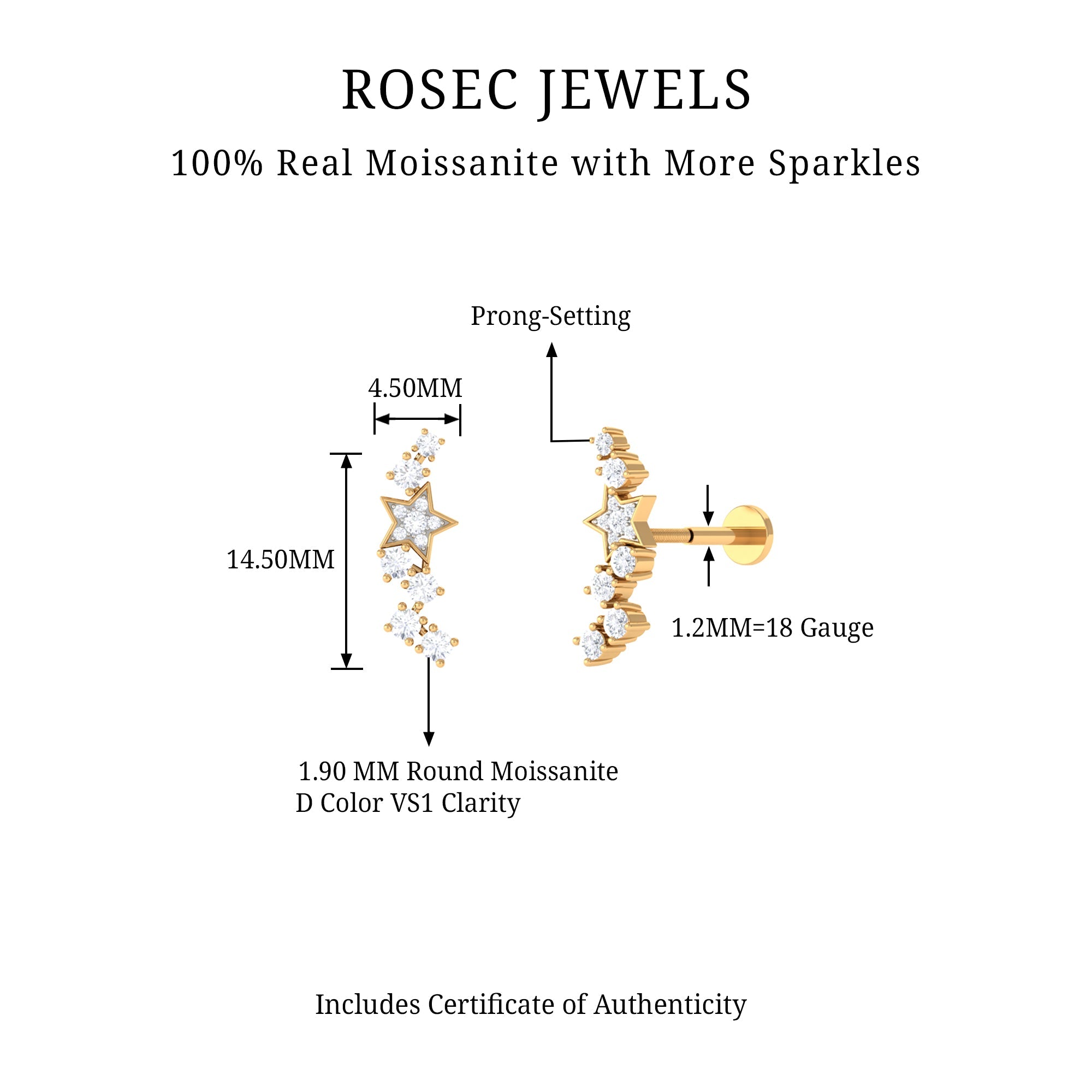 Moissanite Star Celestial Crawler Earring for Helix Piercing ‐ D-VS1 / 14K Yellow Gold / Flat Back 4.5 MM