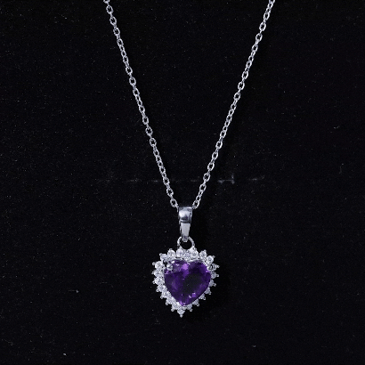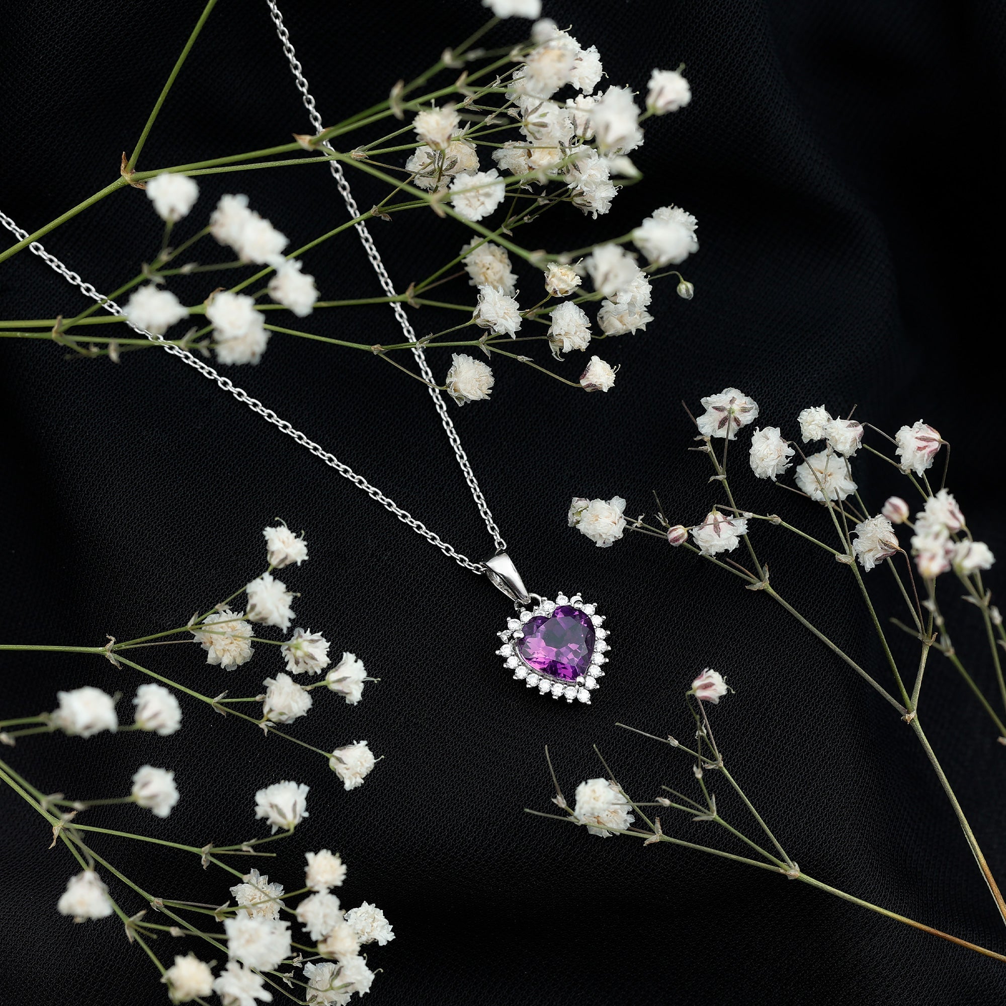This Amethyst Pendant Necklace exudes a deep purple hue, which depicts royalty and spirituality. The pendant necklace features an 8 MM Heart Shape Amethyst secured in Prong Setting and encircled with a Halo of Moissanite stones. The Heart Shape Pendant is the true symbol of love and affection to present to your beloved. The Halo Pendant Necklace will be delivered to you in a premium packaging with the certificate of authenticity.