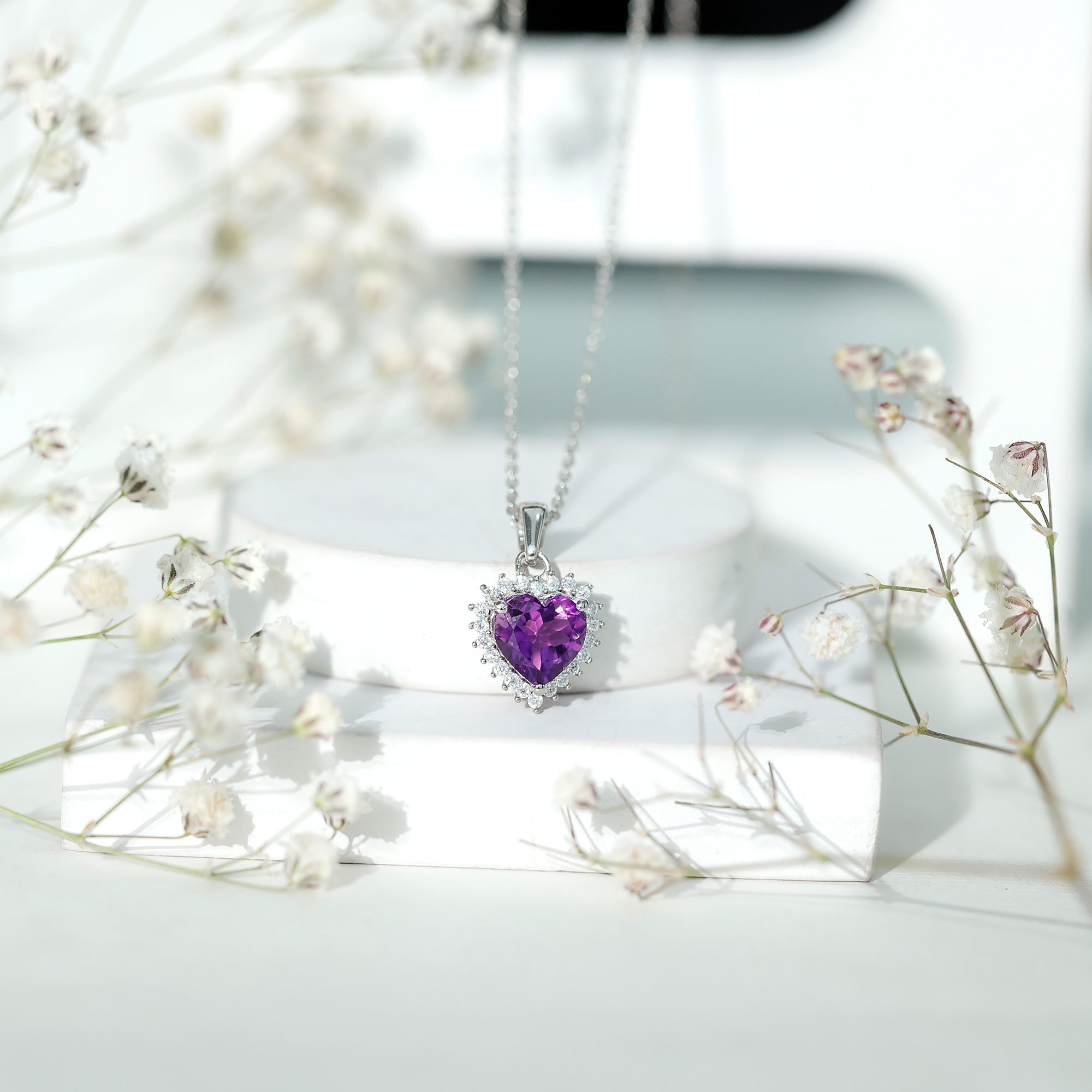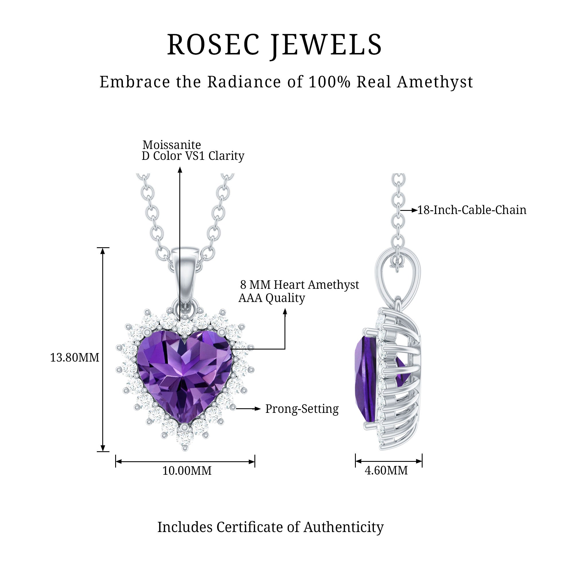 Natural 8 MM Amethyst Heart Necklace with Moissanite Halo ‐ AAA / 92.5 Sterling Silver