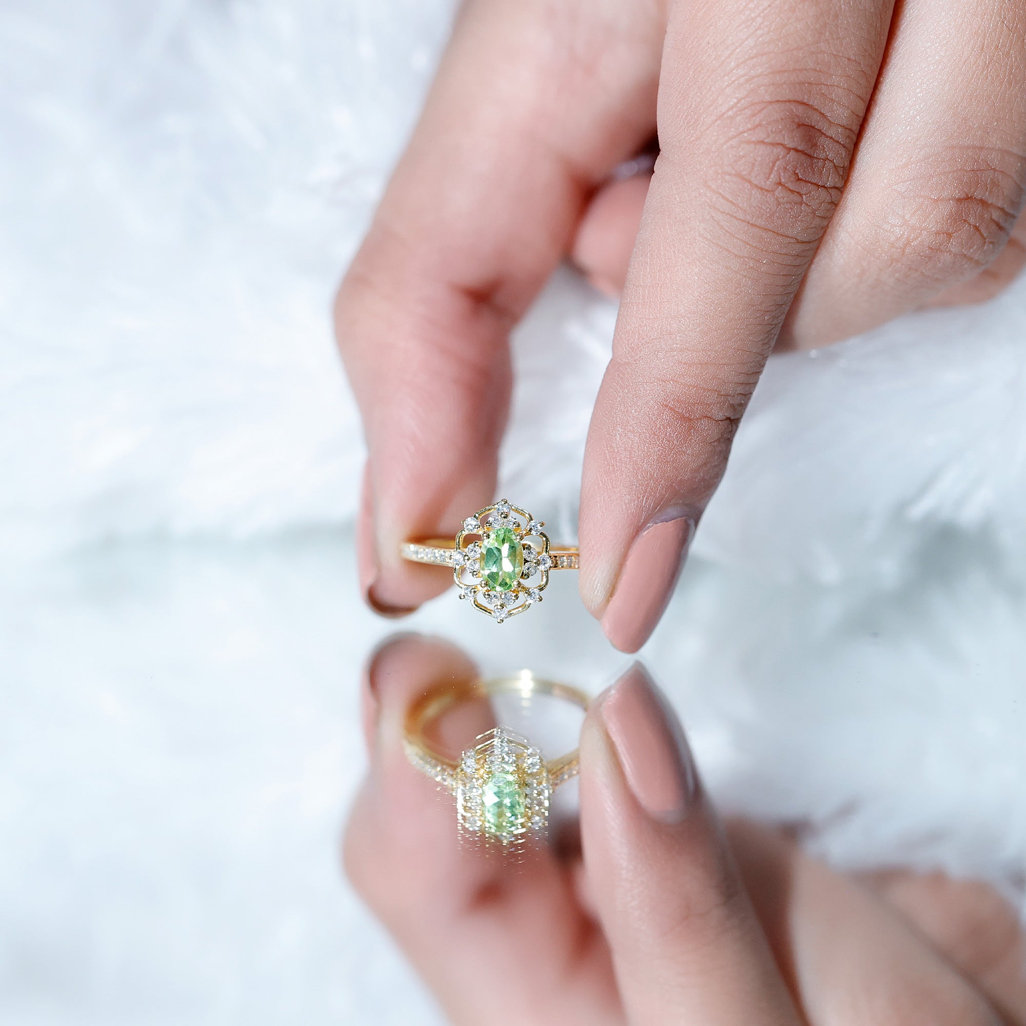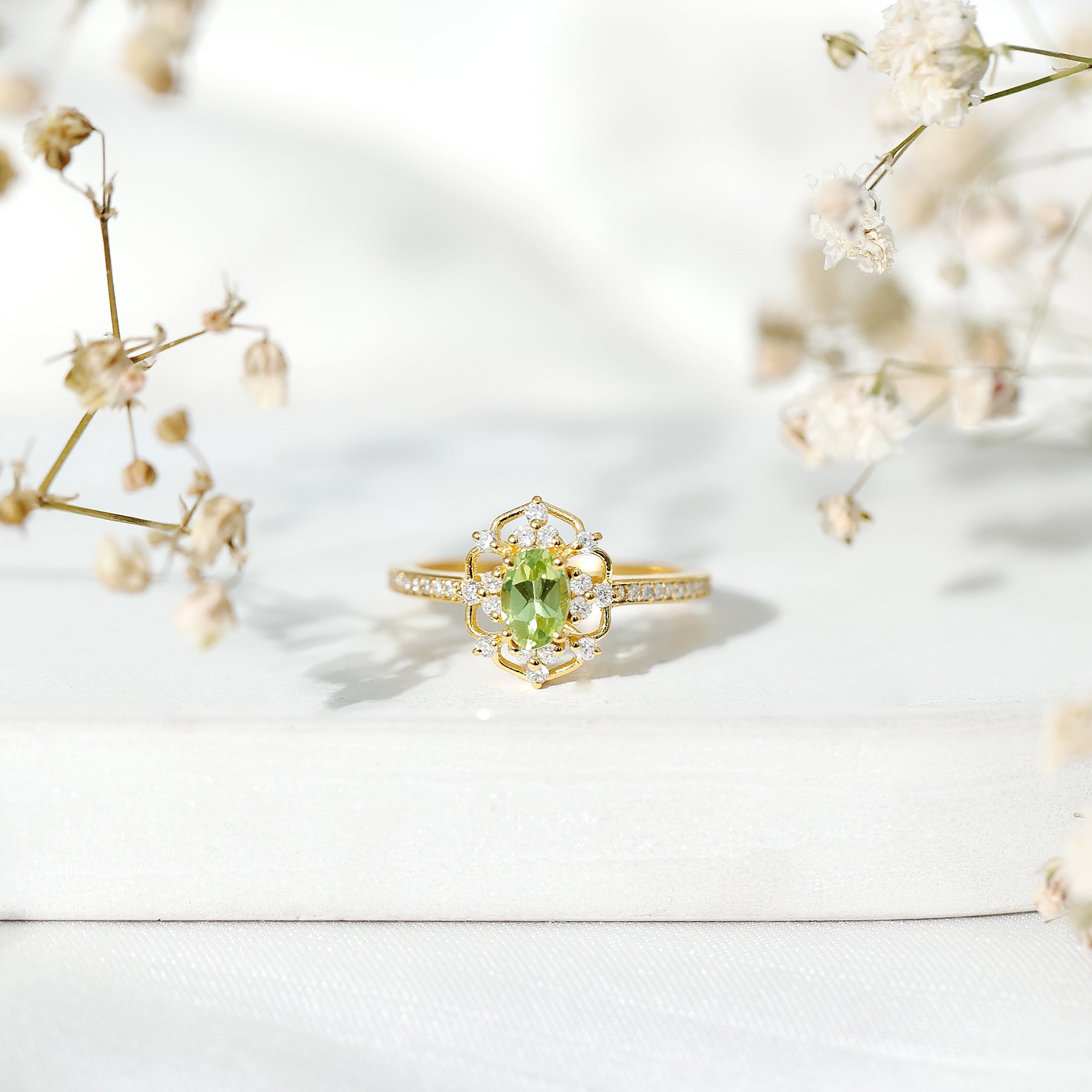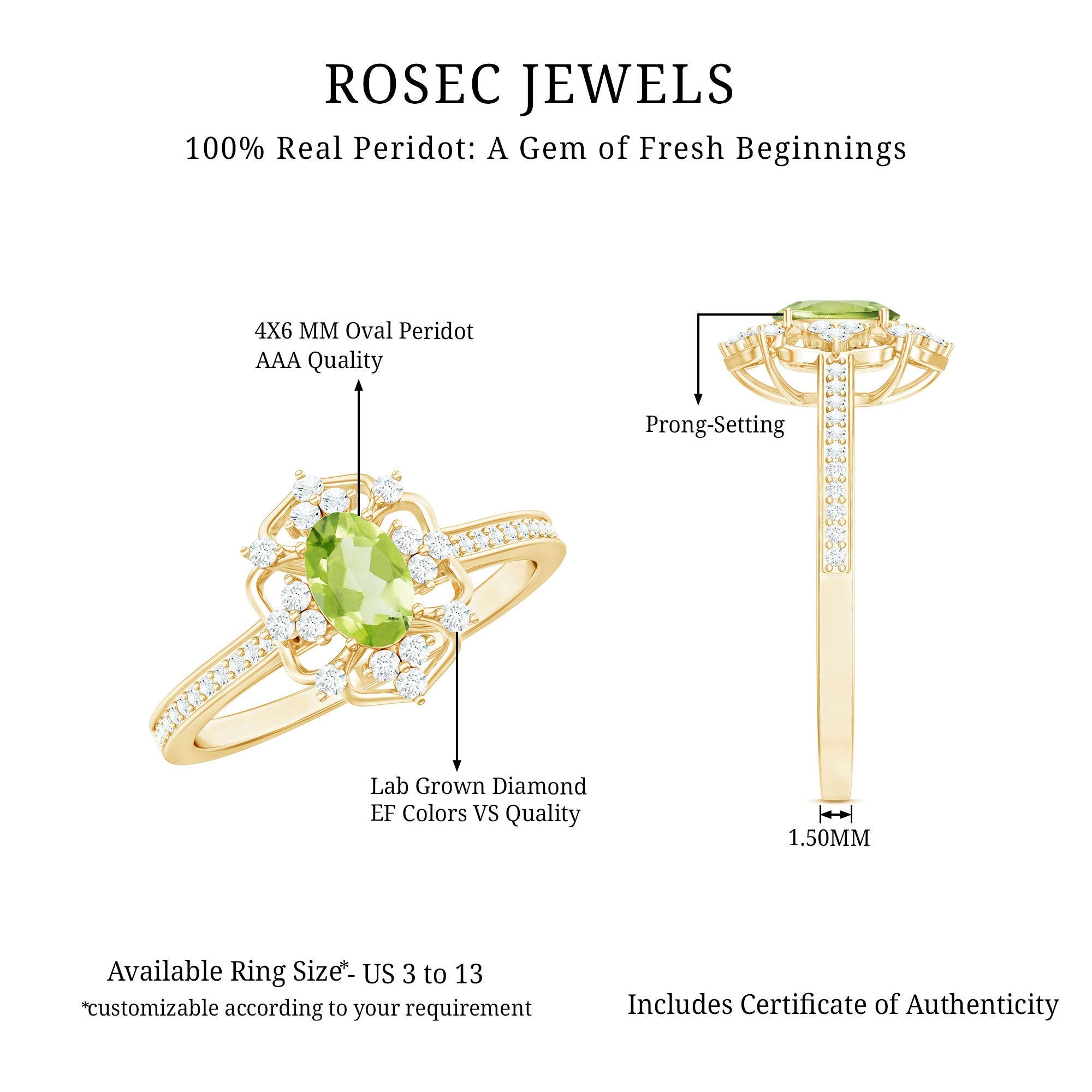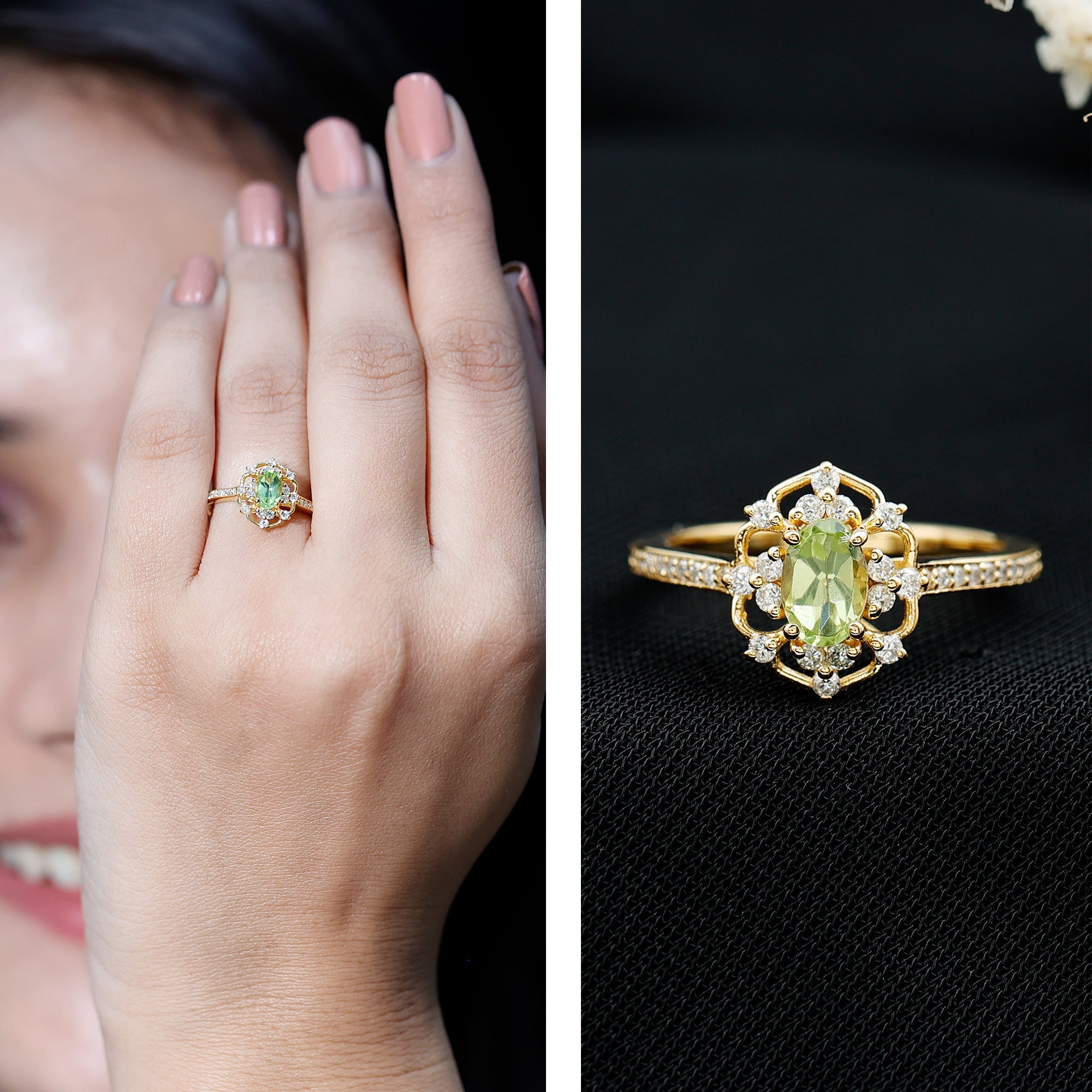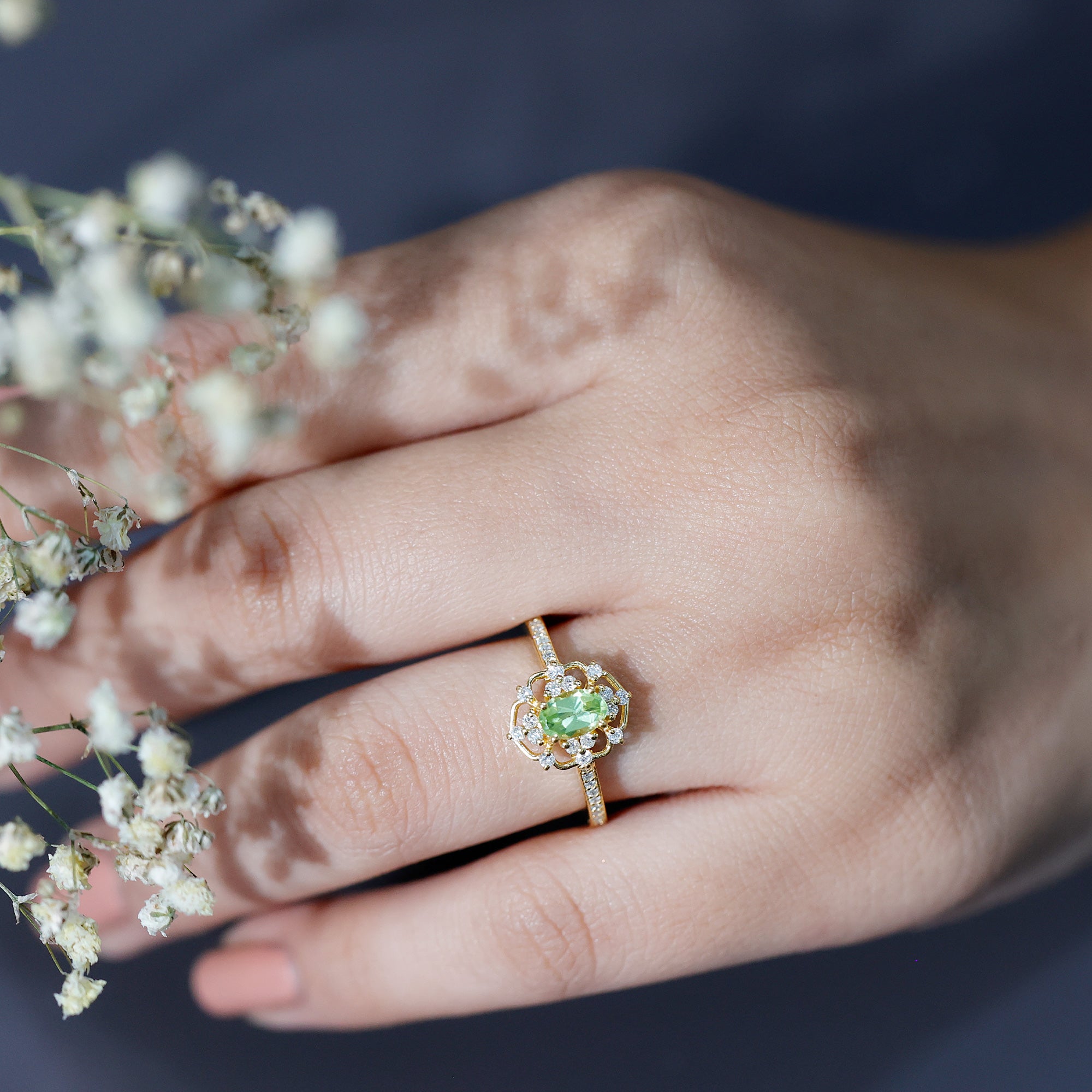 Looking for something unique, radiant, and filled with charm? This Vintage Peridot Engagement Ring is everything you did not know your jewelry collection needed - until now. With its bold retro flair and delicate details, this Oval Shaped Engagement Ring feels like a treasure from another era, reimagined for today’s love stories. Handcrafted in 14k yellow gold plated silver, it features a gorgeous 4X6 MM oval cut Peridot, the vibrant birthstone for August, glowing in its signature fresh green hue. Known to symbolize strength, peace, and harmony, this Antique Peridot Ring is perfect for anyone born in August, or anyone who just loves a pop of nature’s color on their finger. Set in prong setting, it is framed by sparkling round cut lab created diamonds, adding just the right touch of brilliance and making the center stone shine even brighter. The vintage frame gives it that retro-chic vibe, while the side stones along the band bring a dose of modern sparkle (and a guilt-free shine, thanks to their ethical origins!). Whether you are popping the question, marking a milestone, or simply treating yourself to something meaningful, this Peridot and Diamond Ring is a beautiful reminder that love, like vintage style, never goes out of fashion.