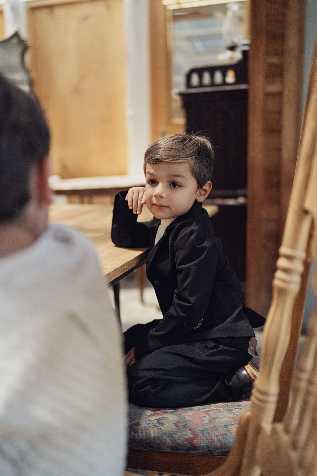 Boys ponte suit jacket with center front button opening and and crest at left side pocket. ֲ