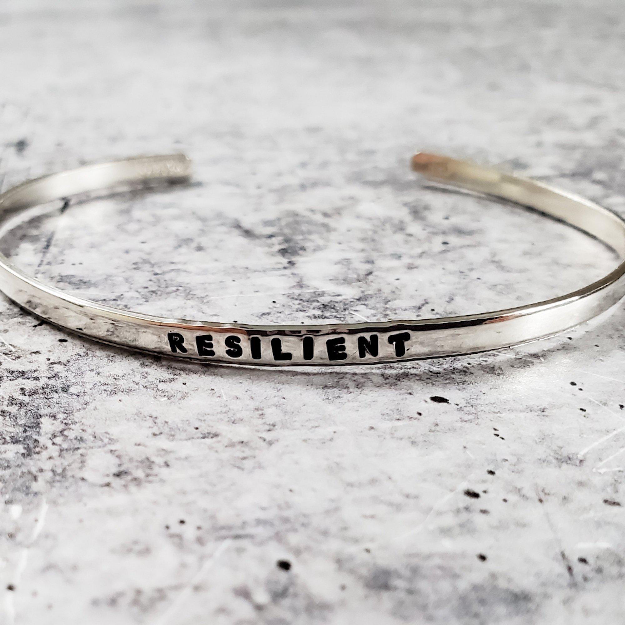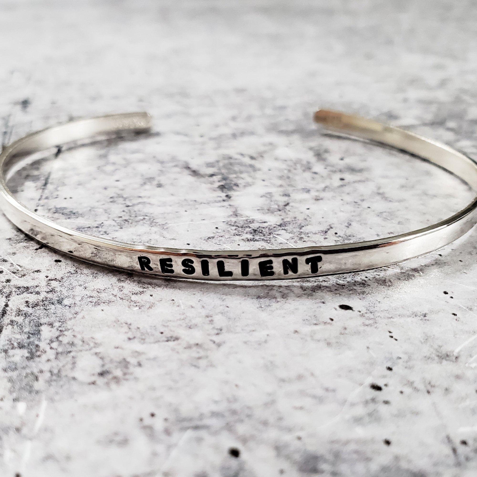 This skinny cuff bracelet reads "RESILIENT" or your own custom text hand-stamped in vegan ink. It's a fantastic accessory for the strong woman standing steadfast and firm against all the trials hurled her way.