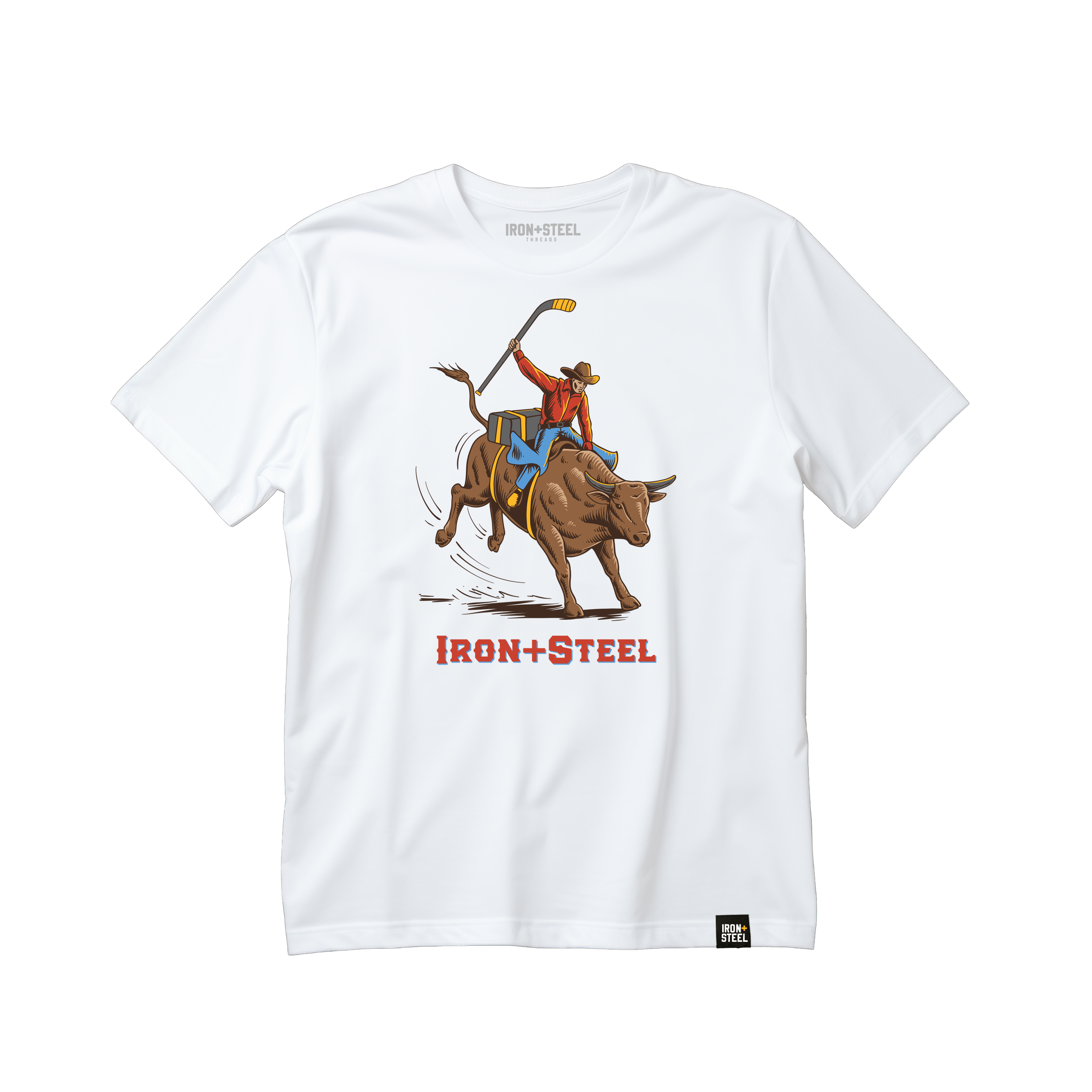 Unleash your inner rink warrior with the "Ride the Bull" hockey T-shirt from Iron+Steel. This bold design captures the gritty, fearless spirit of hockey with a dynamic graphic of a hockey player charging forward like a bull, stick in hand, ready to dominate the ice.