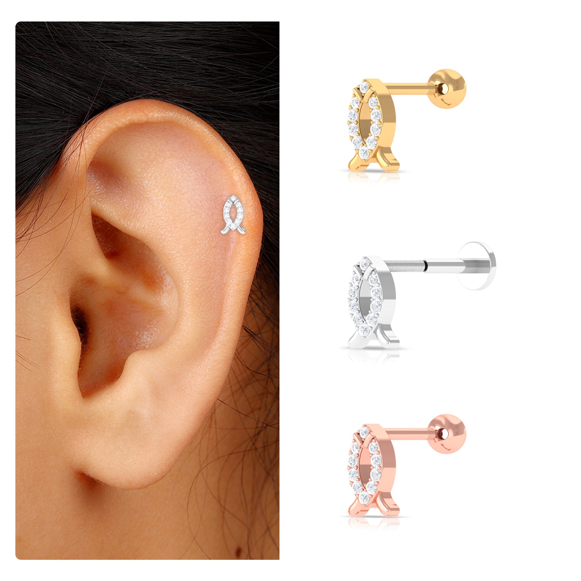 Unique Diamond Gold Fish Earring for Tragus Piercing ‐ Natural - ( HI-SI ) / 18K White Gold / Select Option