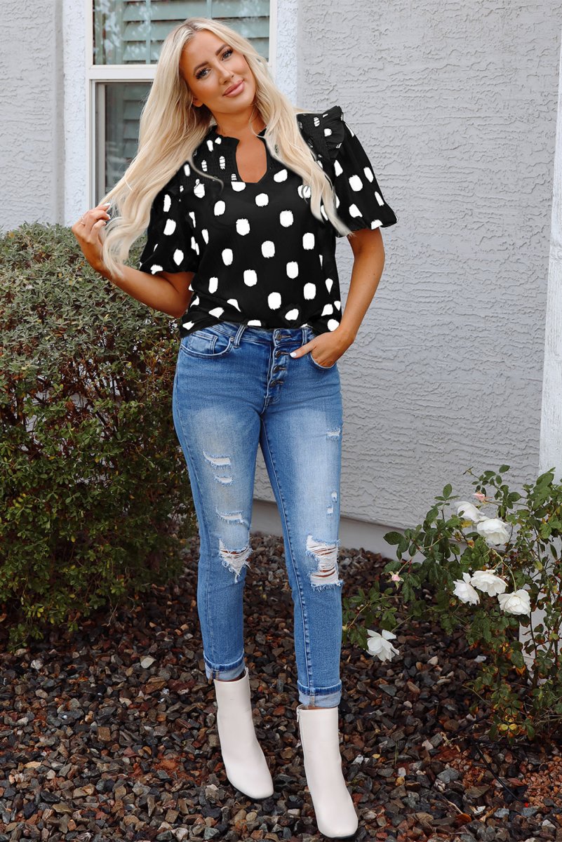 Black Polka Dot Print Shirred Yoke Notched Neck Blouse