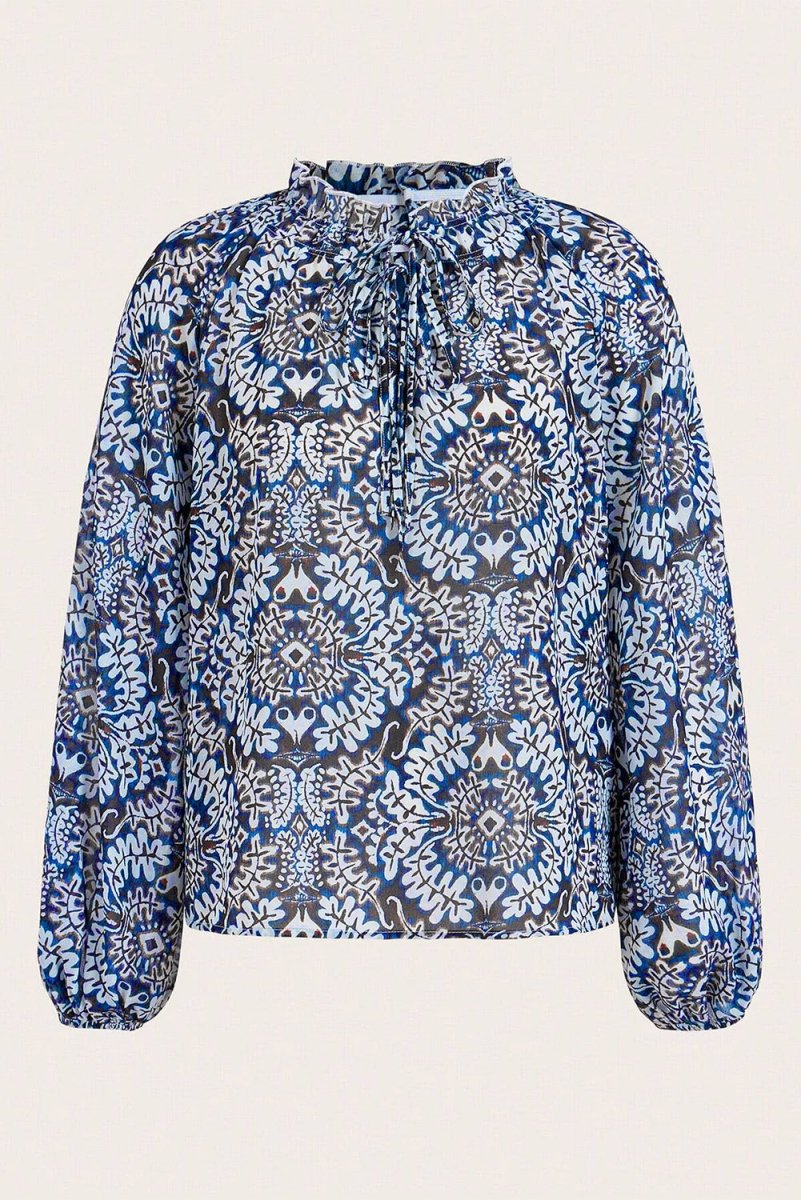 Blue Tribal Print Lace-up Frilled Neck Puff Sleeve Blouse