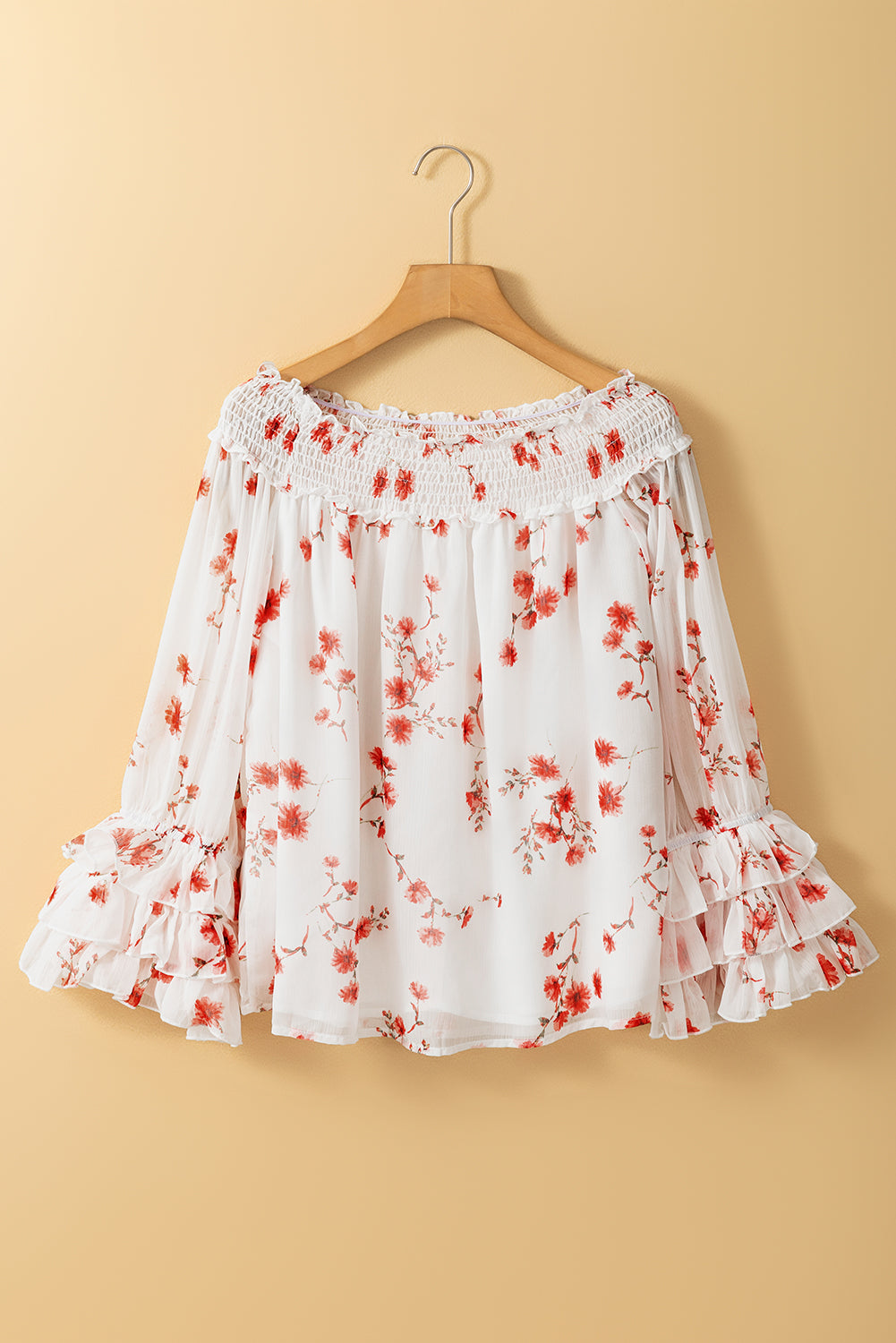 This chic blouse is forever-classy and girly, featuring a dainty floral design. Off-the-shoulder style with ruched accents for a flirtatious allure. Vintage-inspired frills on the sleeves for a touch of nostalgia. Relaxed, breezy fit for effortless and airy vibes.